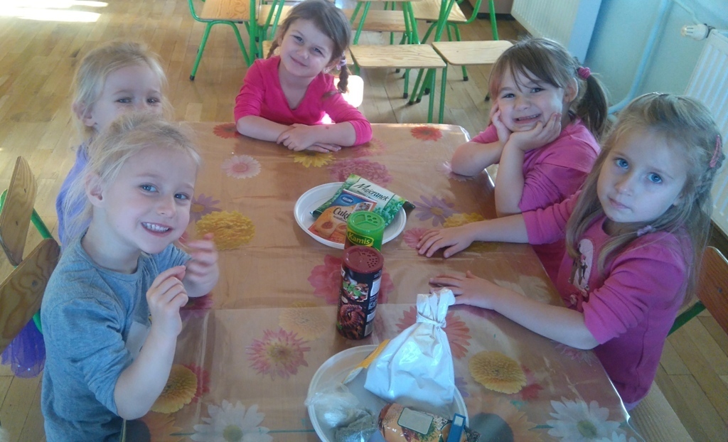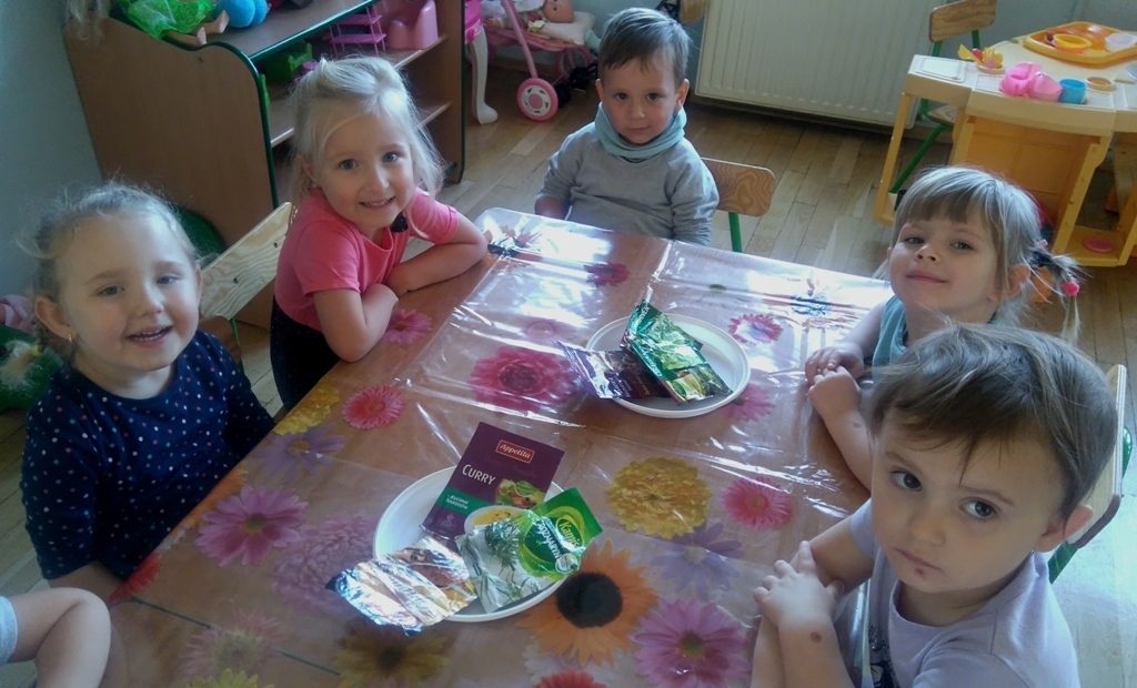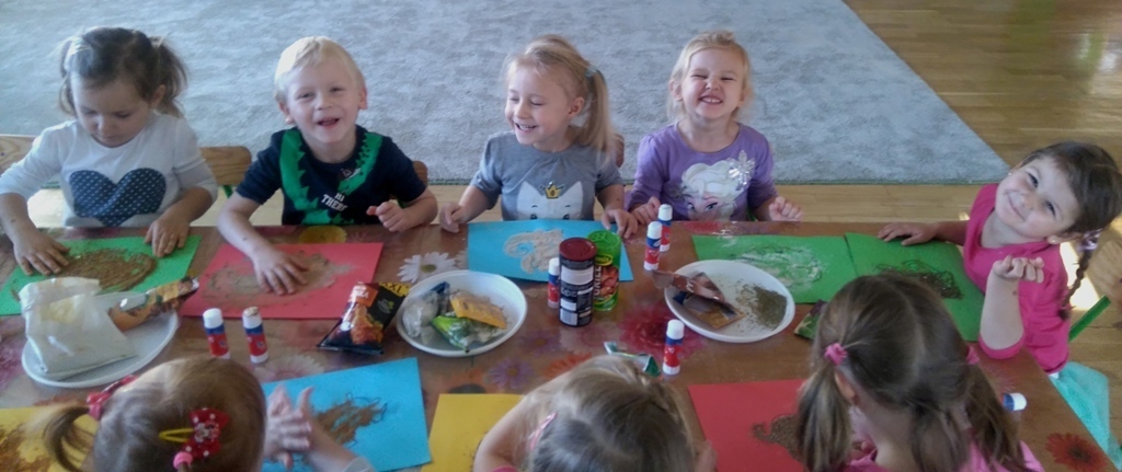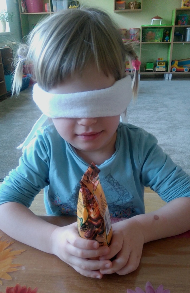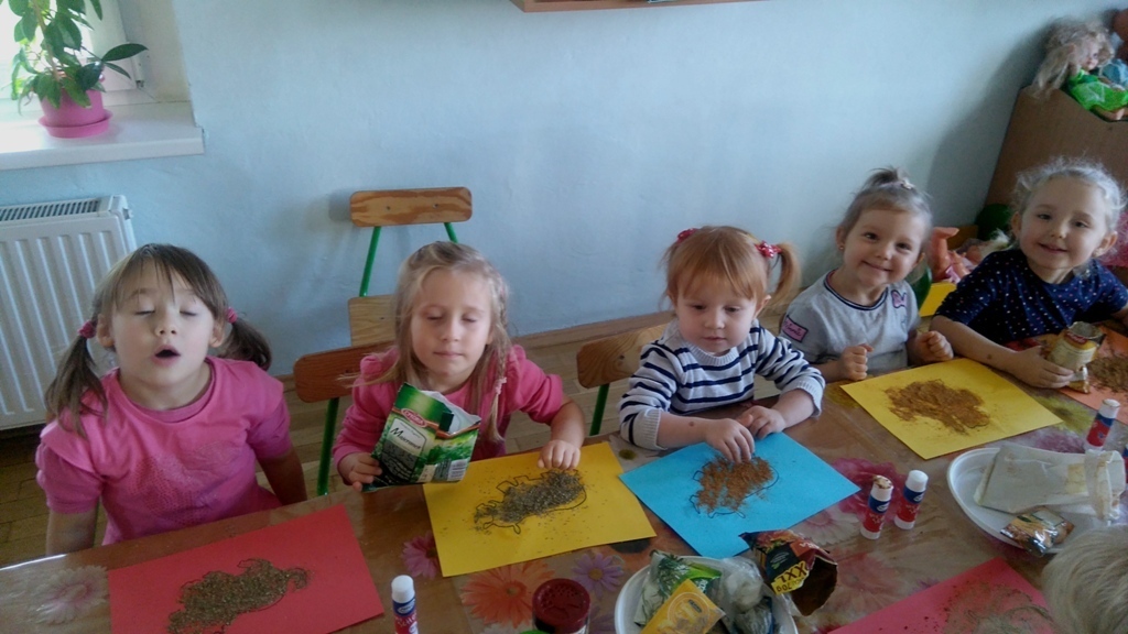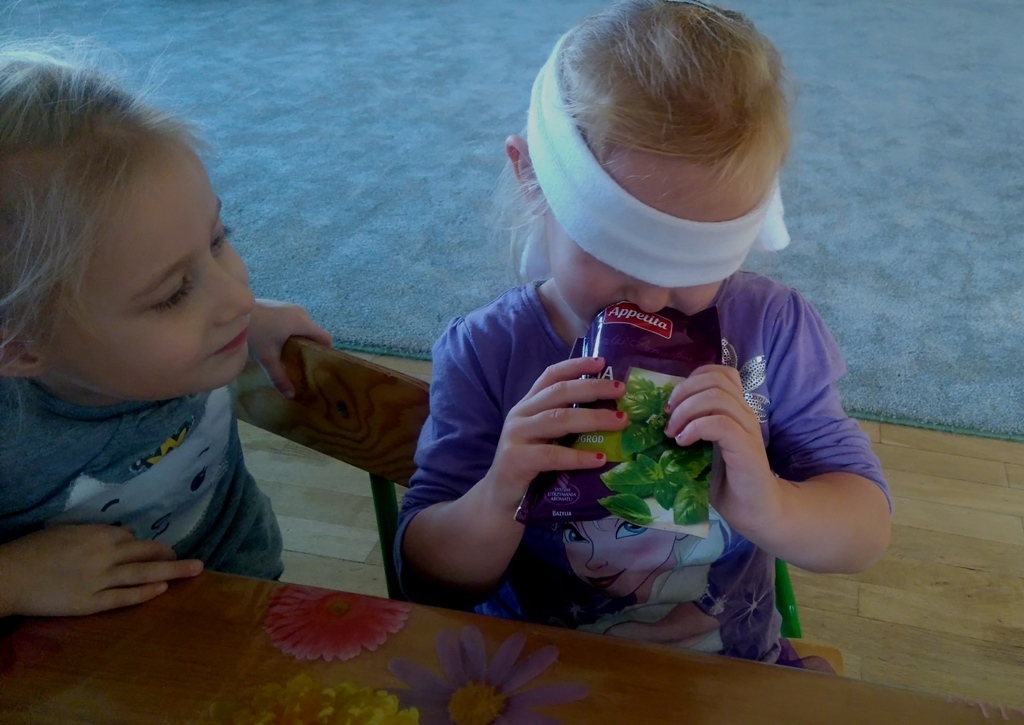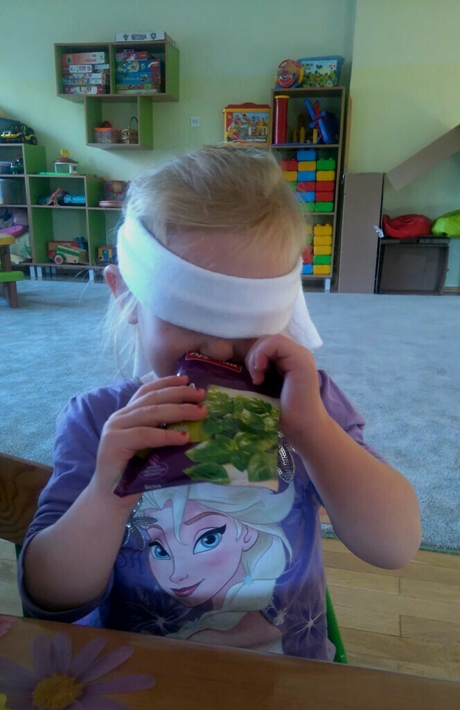 Rozpoczęliśmy zajęcia mając zawiązane oczy. Wąchaliśmy i rozpoznawaliśmy różne przyprawy do gotowania i pieczenia. Nasze zadanie polegało na rozpoznaniu, czy jest ro dodatek do ciast, czy do mięs. Następnie smarowaliśmy klejem obrazek przedstawiający zwierzątko i posypywaliśmy go dowolnymi przyprawami. Na koniec zajęć wszyscy mogliśmy bawić się w kucharzy, doprawiać dania, dotykając i wąchając przypraw. Zabawa przyniosła element zaskoczenia, eksperymentu, pobudziła do działania zmysły zapachu, dotyku i smaku.