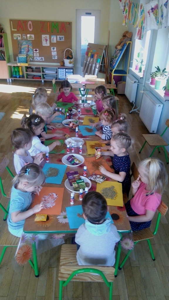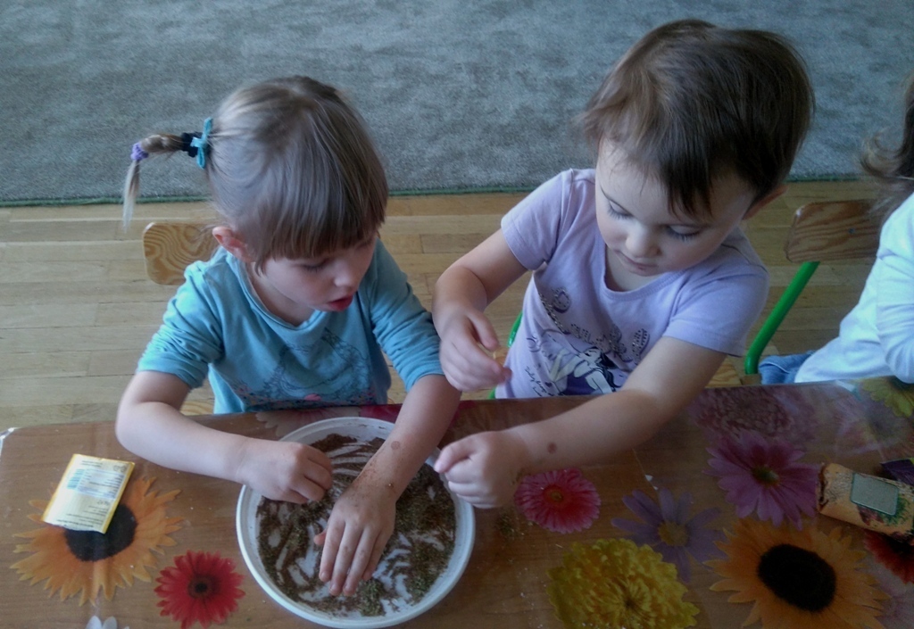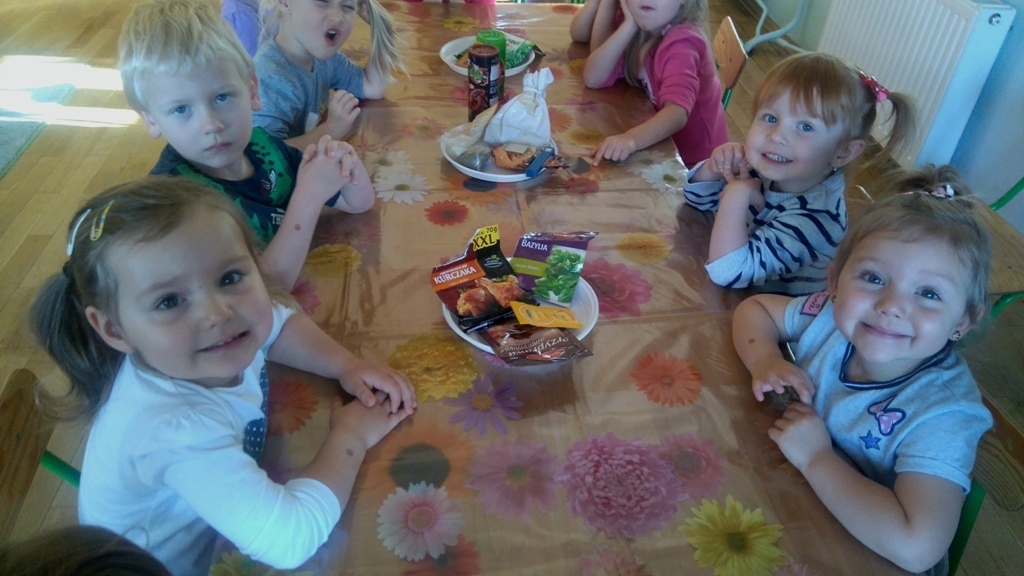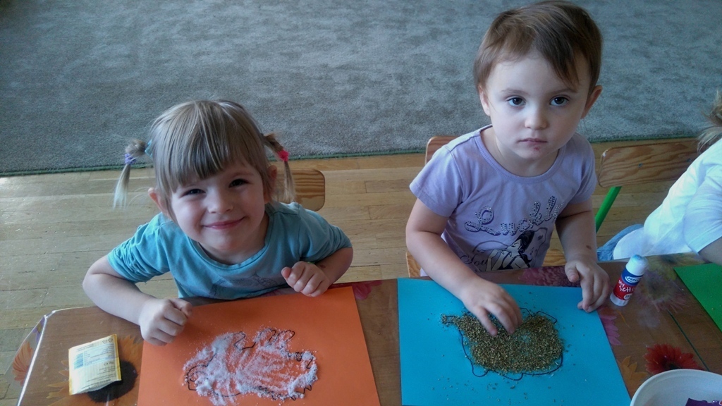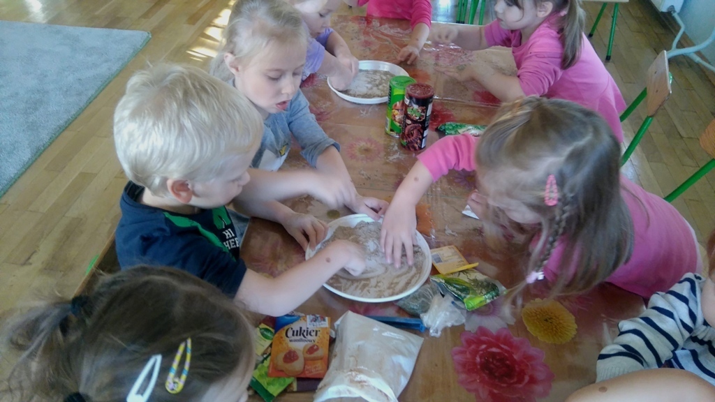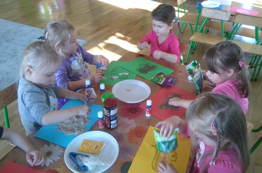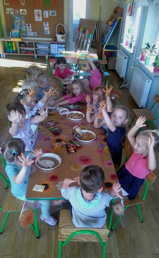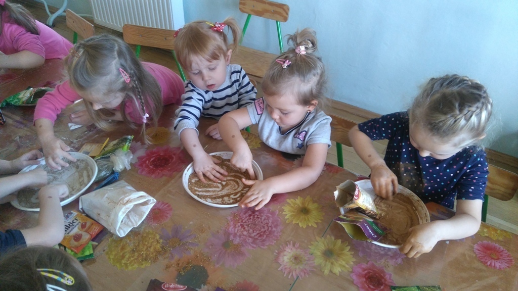 Rozpoczęliśmy zajęcia mając zawiązane oczy. Wąchaliśmy i rozpoznawaliśmy różne przyprawy do gotowania i pieczenia. Nasze zadanie polegało na rozpoznaniu, czy jest ro dodatek do ciast, czy do mięs. Następnie smarowaliśmy klejem obrazek przedstawiający zwierzątko i posypywaliśmy go dowolnymi przyprawami. Na koniec zajęć wszyscy mogliśmy bawić się w kucharzy, doprawiać dania, dotykając i wąchając przypraw. Zabawa przyniosła element zaskoczenia, eksperymentu, pobudziła do działania zmysły zapachu, dotyku i smaku.