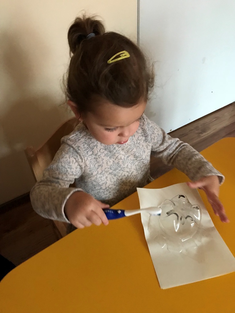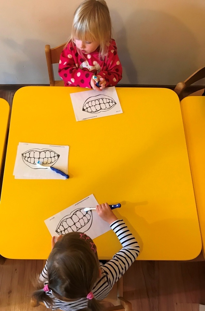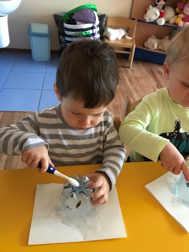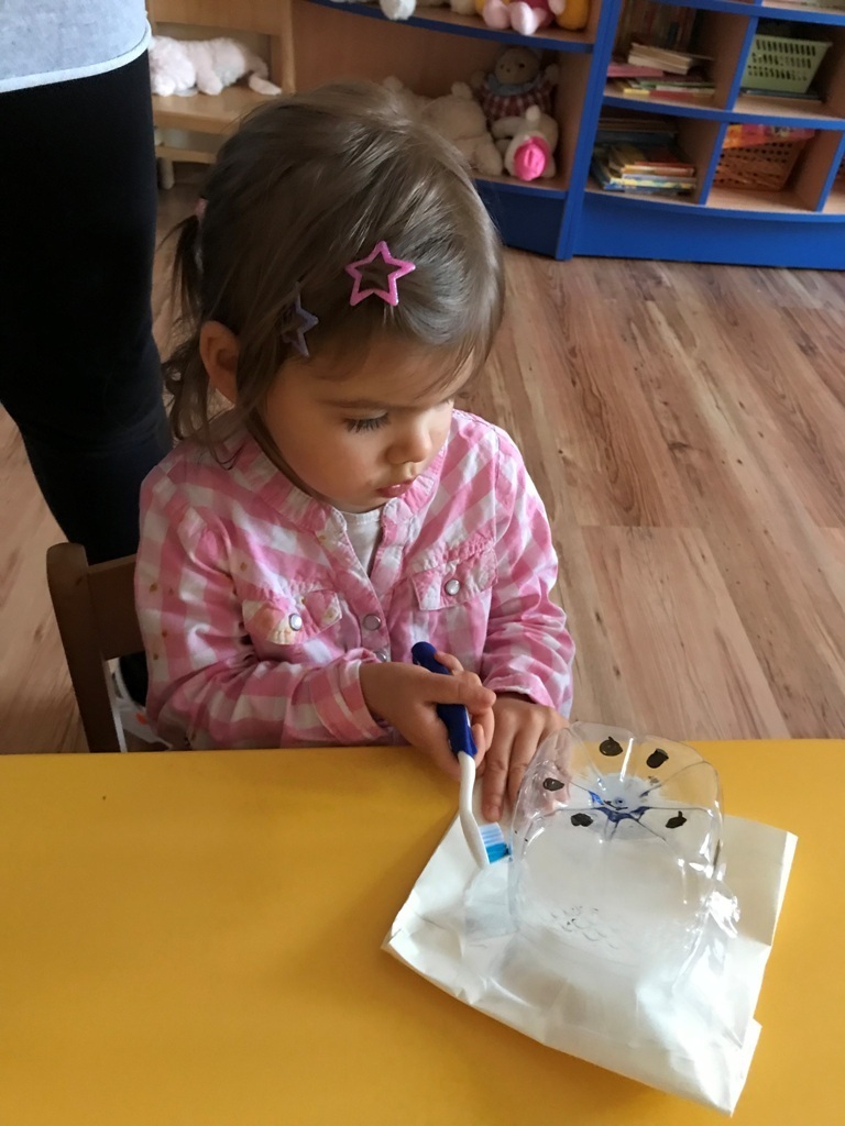 W dniu dzisiejszym grupa Smerfów zakończyła cykl zajęć dotyczących zdrowia. Ostatnie dwa dni Maluszki spędziły na przygotowaniach do samodzielnego mycia zębów. Najpierw ćwiczyliśmy ruchy szczoteczki na płaskim szablonie przedstawiającym górną i dolną szczękę. Kolejnym etapem było szczotkowanie przestrzenne modelu zęba wykonanego z denka plastikowej butelki. Tak przygotowane Smerfy podjęły wyzwanie i wyszczotkowały swoje ząbki. Każdy z przejęcia starał się najlepiej wykonać nauczone ruchy. Z dumą możemy się pochwalić,że najmłodsze przedszkolaki zadanie wykonały idealnie, jak na możliwościowi swoich małych rączek.