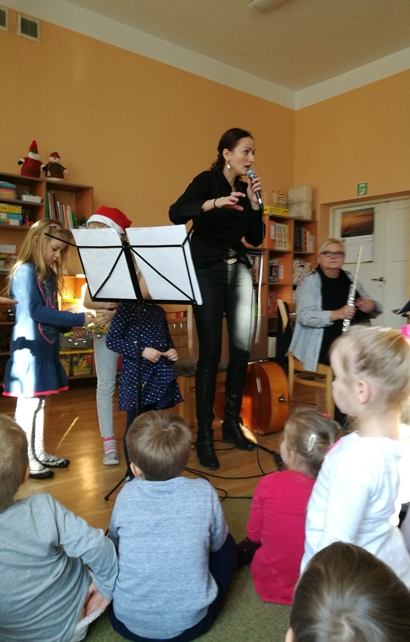 Dżwięki wiolonczeli, pianina i magicznego fletu poprzecznego zabrały dzieci do bajecznych krain. Wraz z choinkowymi prezentami udaliśmy się do mroźnej krainy, którą zrodziła zła Królowa Śniegu. Kolejnym odwiedzonym miejscem była kraina Dziewczynki z zapałkami. Na koniec podróży dzieci poznały Polskie tradycje Bożonarodzeniowe i wspólne z muzykami zaśpiewały kolędę pt. „Wśród nocnewj ciszy”.