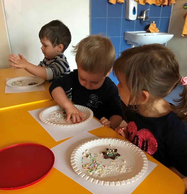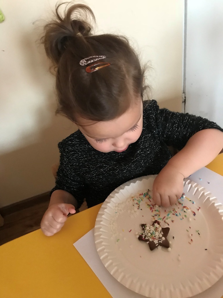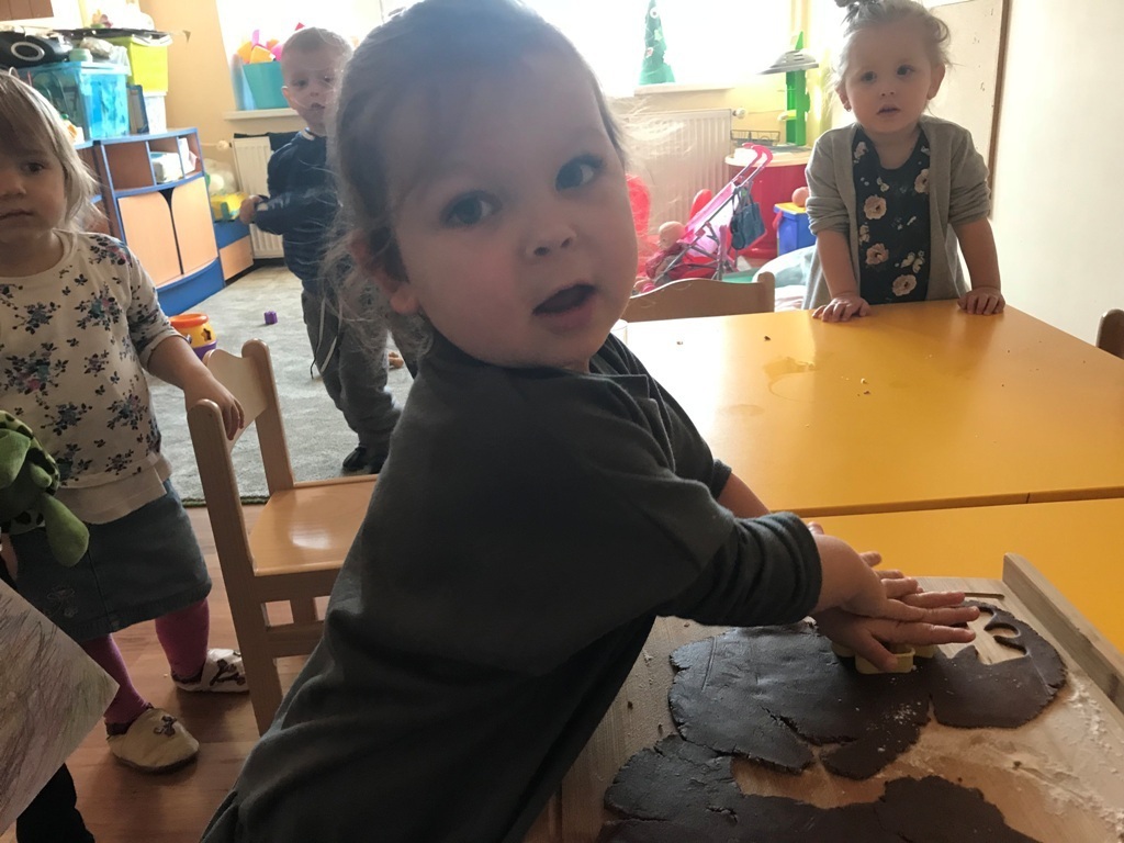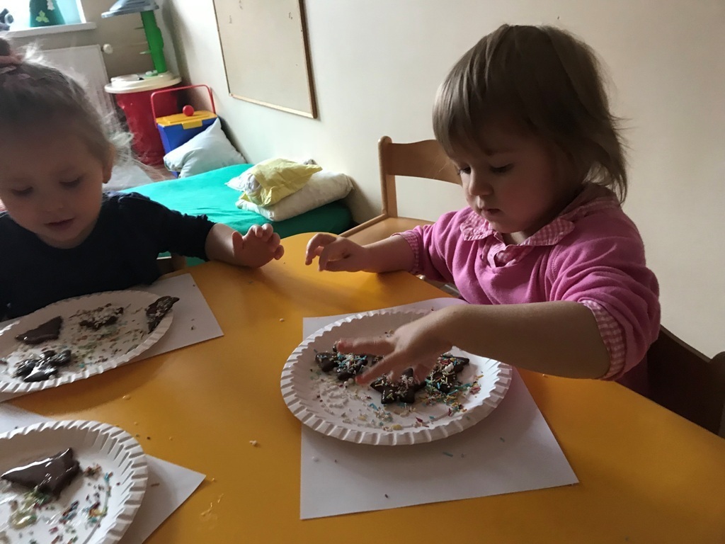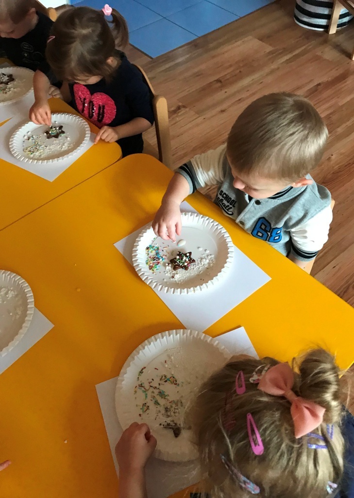 Czwartkowe wykrawanie i piątkowe zdobienie pierniczków mocno zaangażowało maluszki. Wykrawane gwiazdki, choinki i aniołki zostały własnoręcznie ozdobione przez grupę Smerfów. Każde ciasteczko zostało unikatowo obsypane posypką, groszkami i innymi cukrowymi ozdobami. Każdy z Maluszków ukradkiem spróbował cukrowych przysmaków. Pierniczki pozostały do wyschnięcia po dekorowaniu i zostaną zjedzone wspólnie w czasie przedszkolnej wigilii.