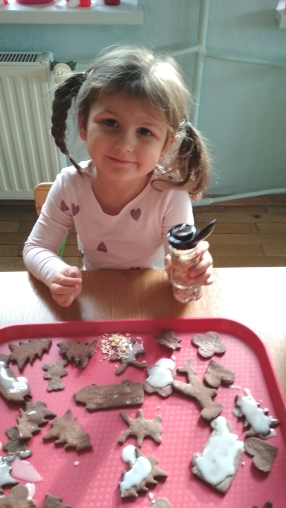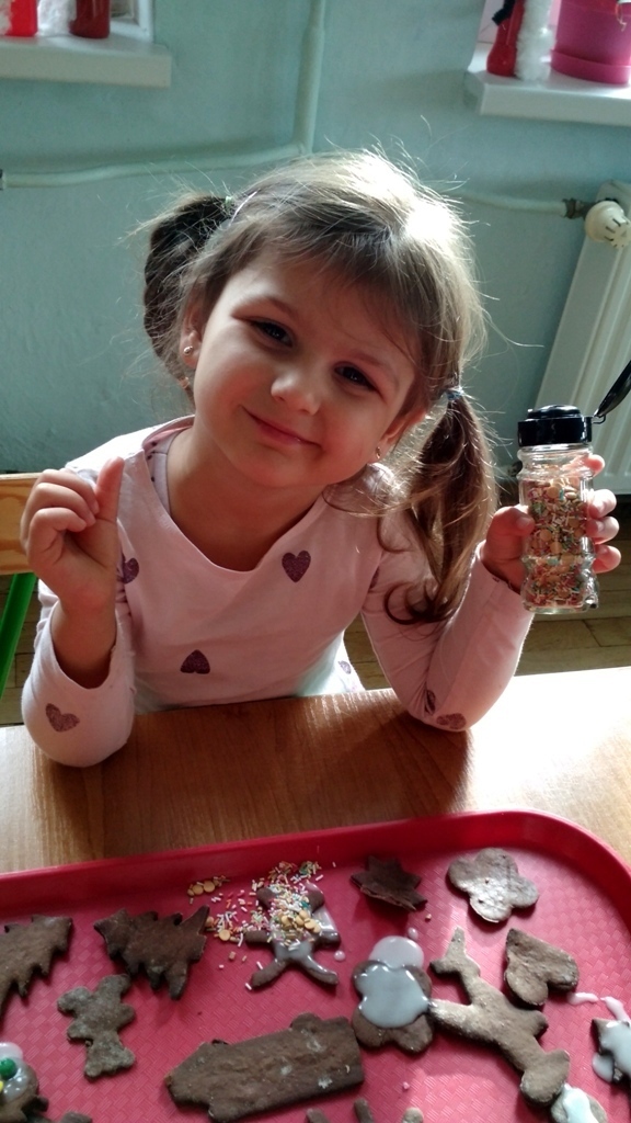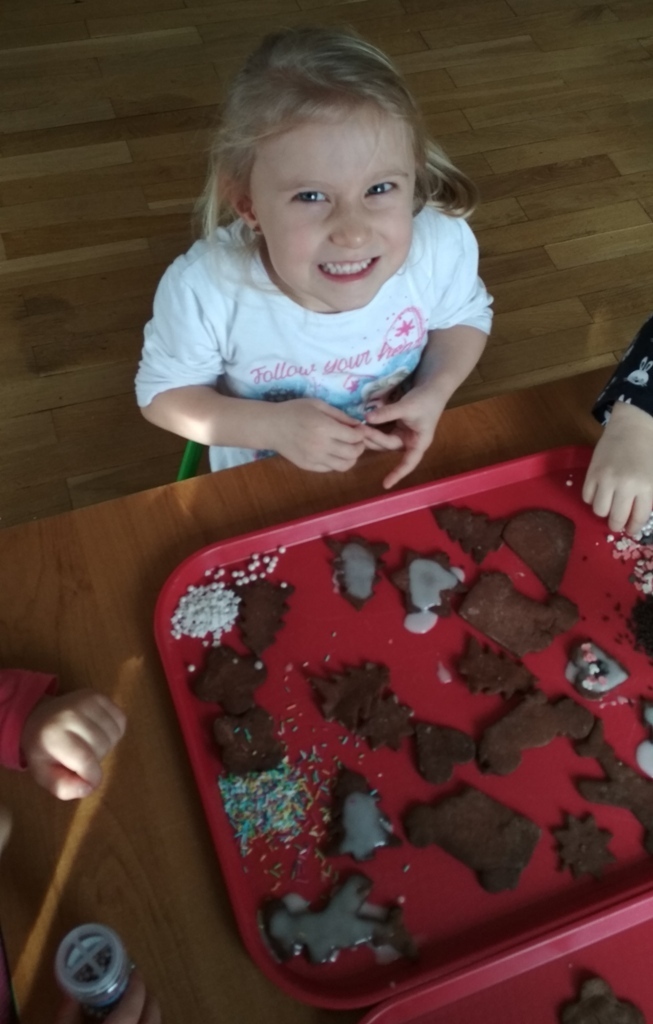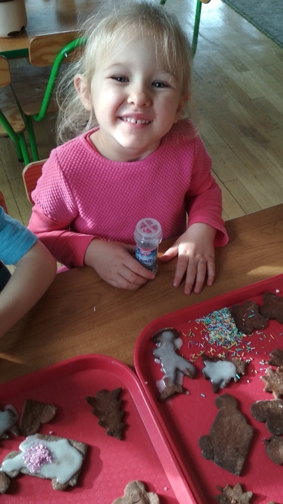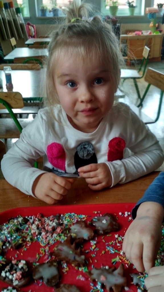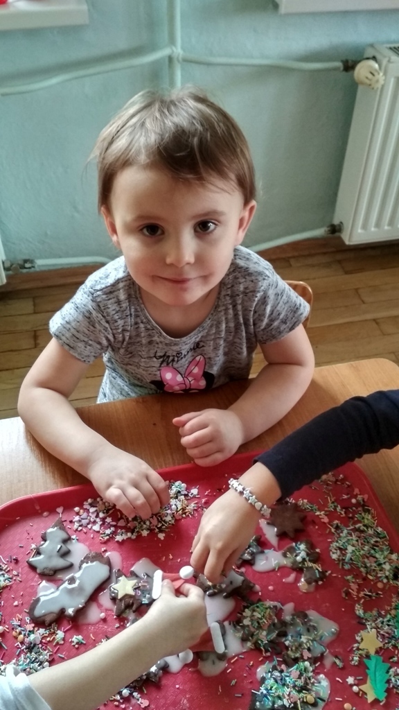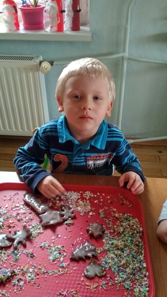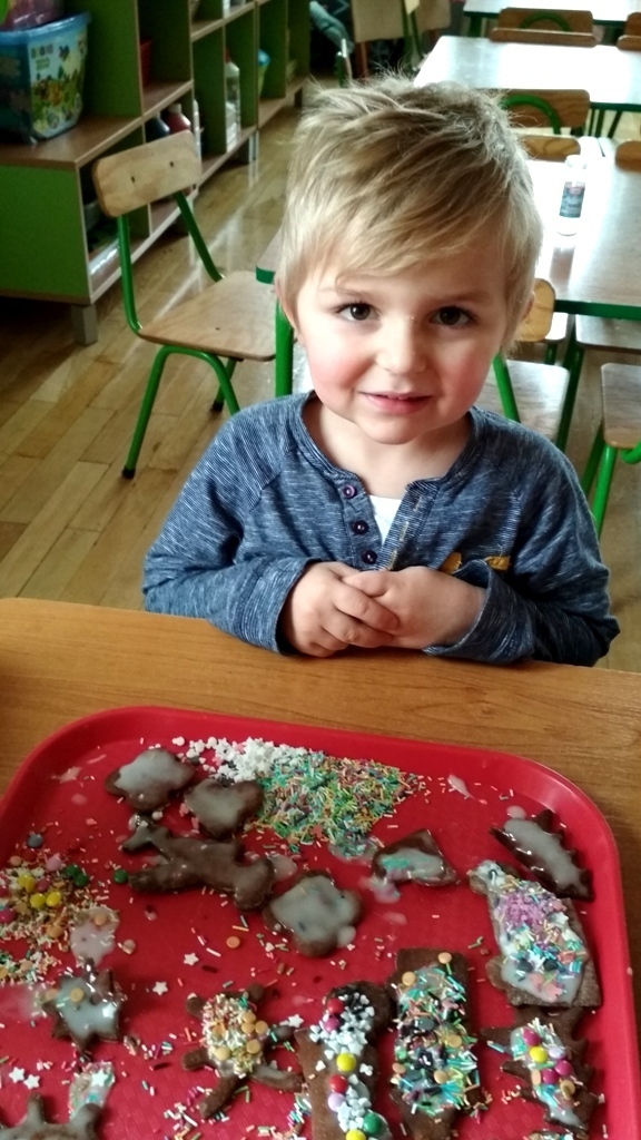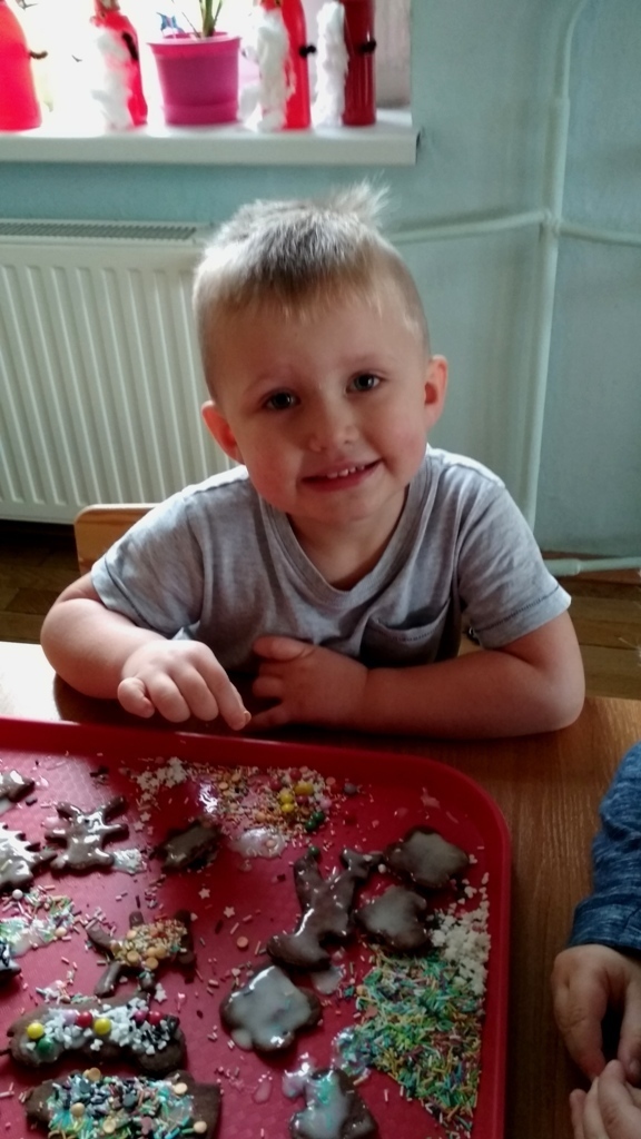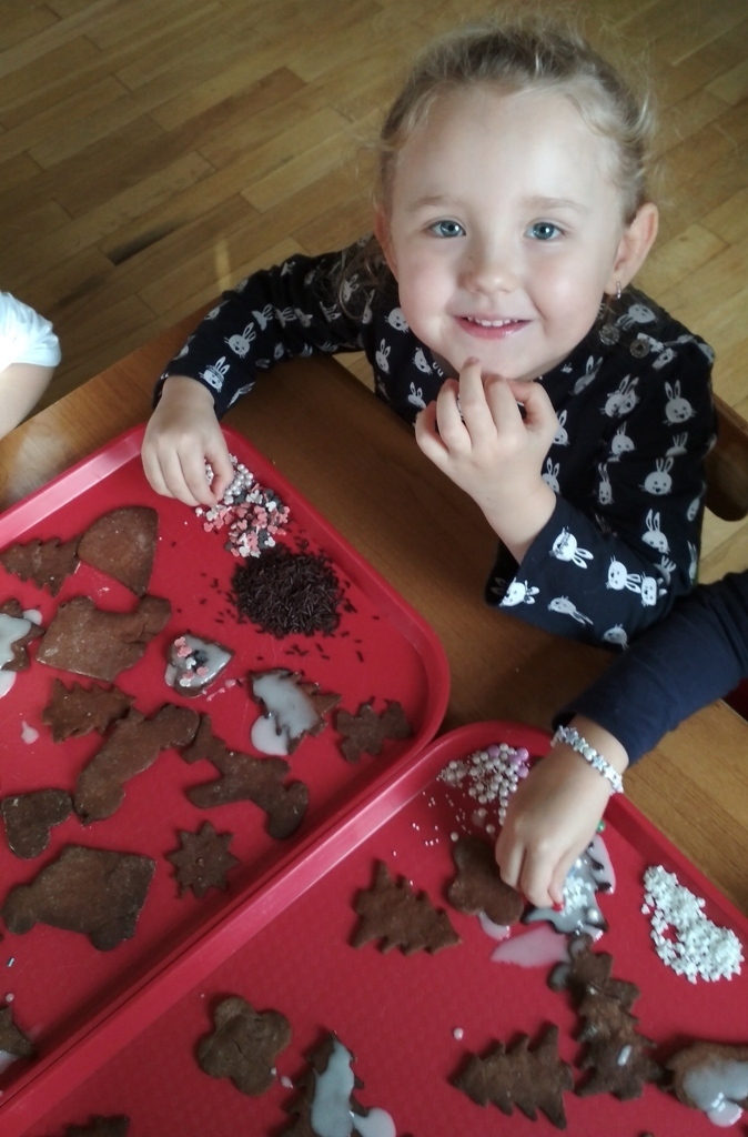 Dzisiejszego dnia dekorowaliśmy nasze pierniczki, które przygotowaliśmy kilka dni wcześniej. Na naszym stole, aż mieniło się od kolorowych, słodkich dekoracji. Każdy z nas z przyjemnością siadał do stolika i dekorował choinki, misie, gwiazdki i aniołki - lukrem, a także pysznymi słodkimi posypkami, których oczywiście musieliśmy spróbować, żeby wiedzieć, czy pierniki udały się i czy będą nam smakowały w dniu Wigilii. A będą przepyszne, musicie nam uwierzyć!