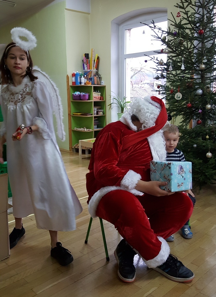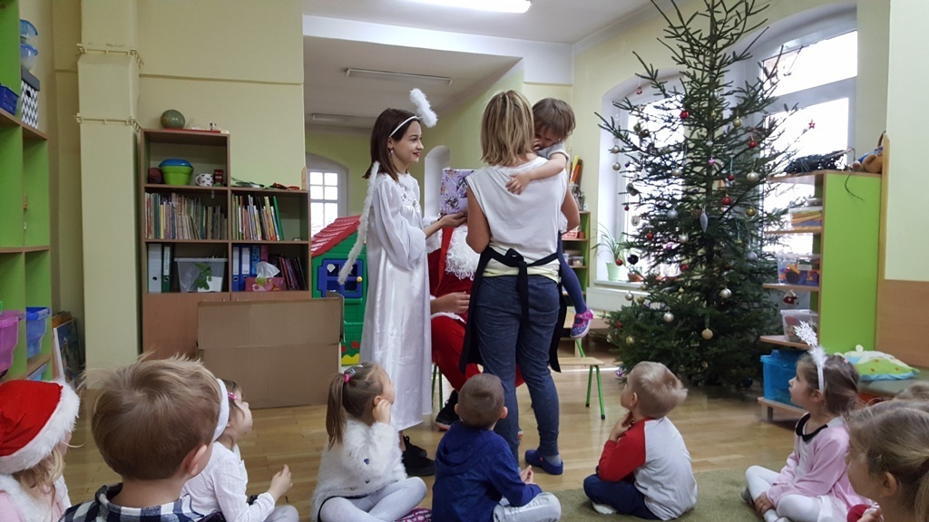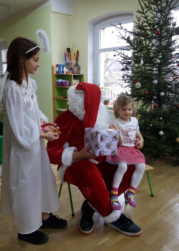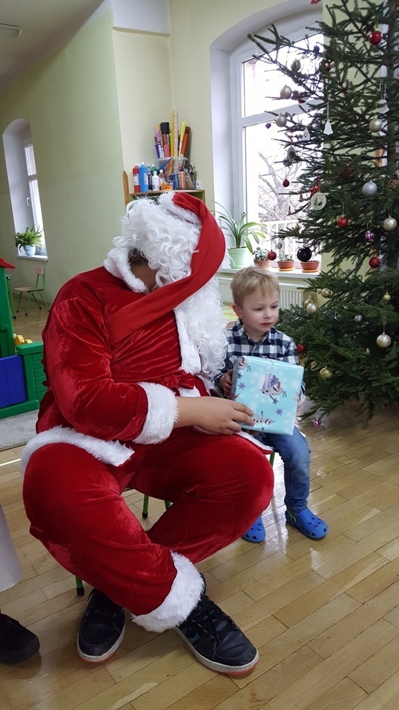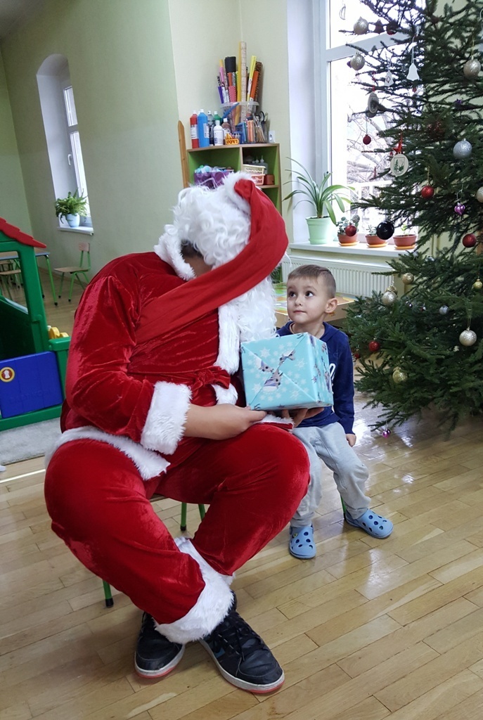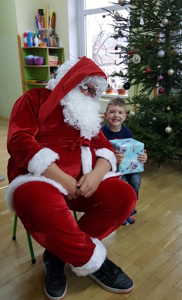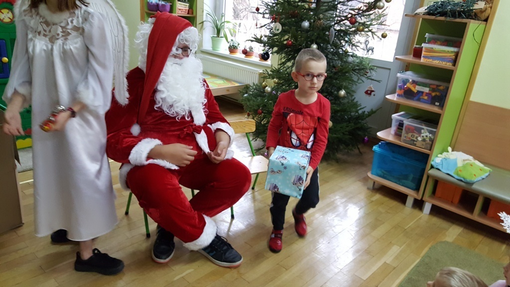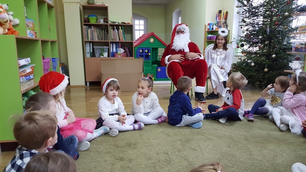 Zjawił się wreszcie z dawna gość - w pięknym czerwonym stroju, z białą brodą, z workiem pełnym prezentów. To św. Mikołaj. Przybył do nas z Laponii wraz ze swoim pomocnikiem - sympatyczną białą śnieżynką. Rozdał wszystkim prezenty, pobawił się z nami, pośpiewał, następnie wyruszył w dalszą drogę, by odwiedzić na szas wszystkie dzieci w całej Polsce.