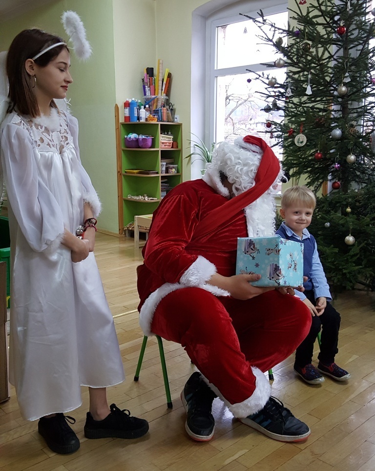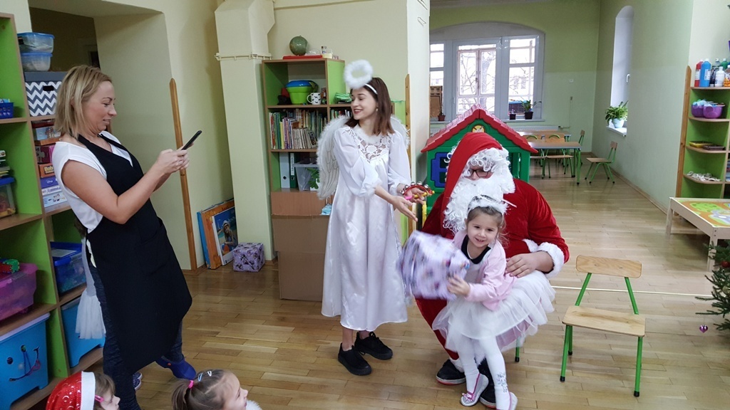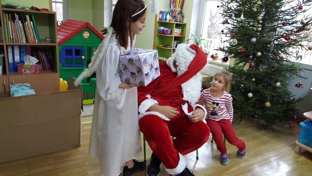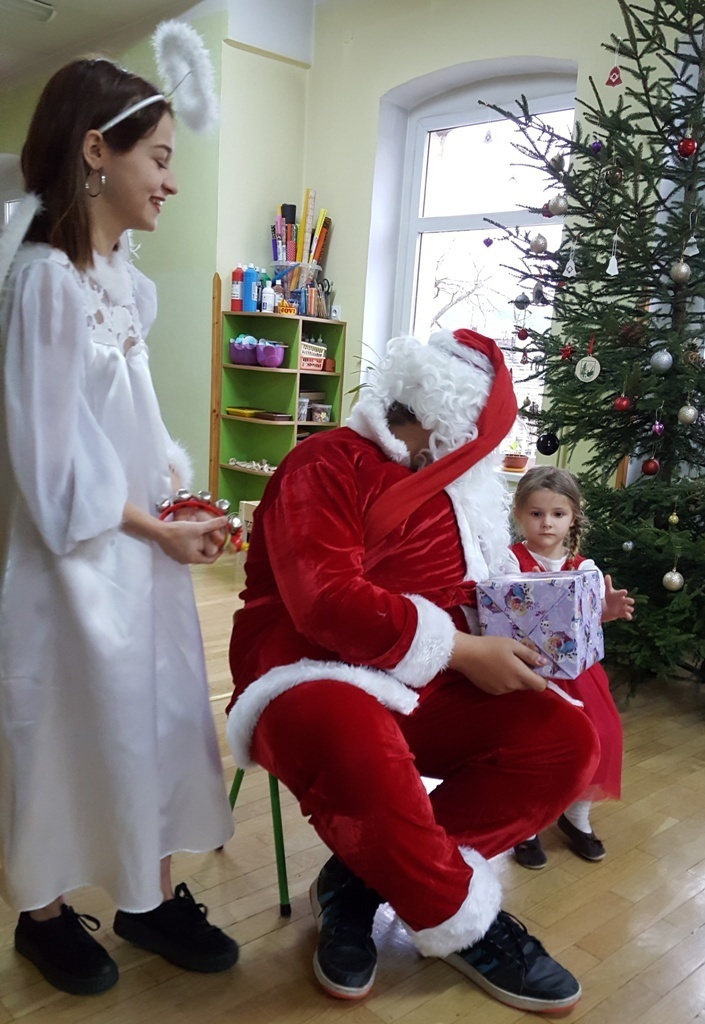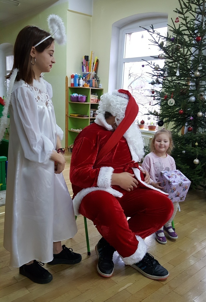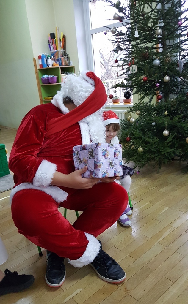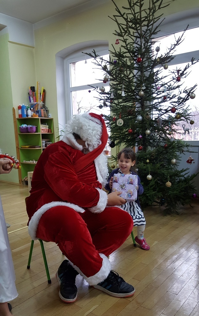 Zjawił się wreszcie z dawna gość - w pięknym czerwonym stroju, z białą brodą, z workiem pełnym prezentów. To św. Mikołaj. Przybył do nas z Laponii wraz ze swoim pomocnikiem - sympatyczną białą śnieżynką. Rozdał wszystkim prezenty, pobawił się z nami, pośpiewał, następnie wyruszył w dalszą drogę, by odwiedzić na szas wszystkie dzieci w całej Polsce.