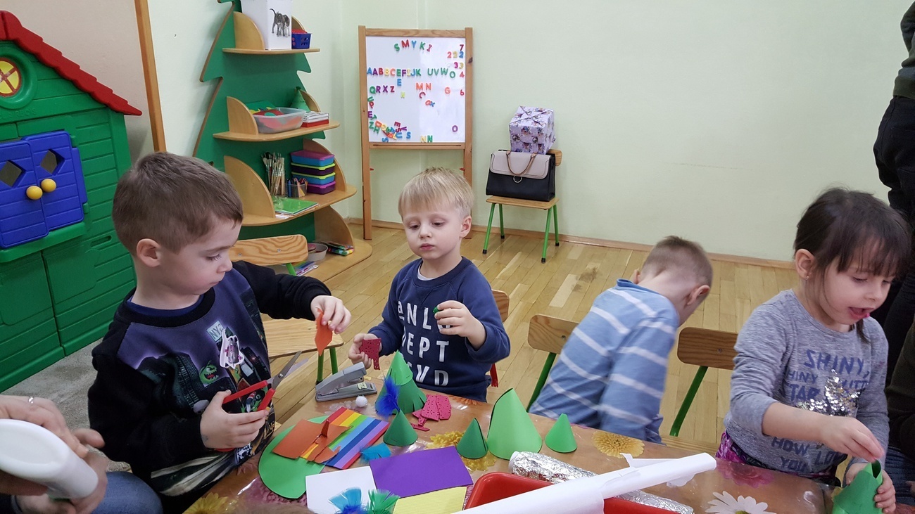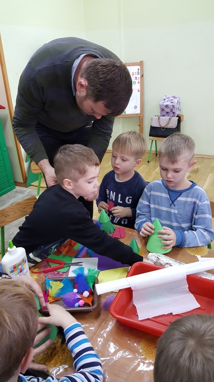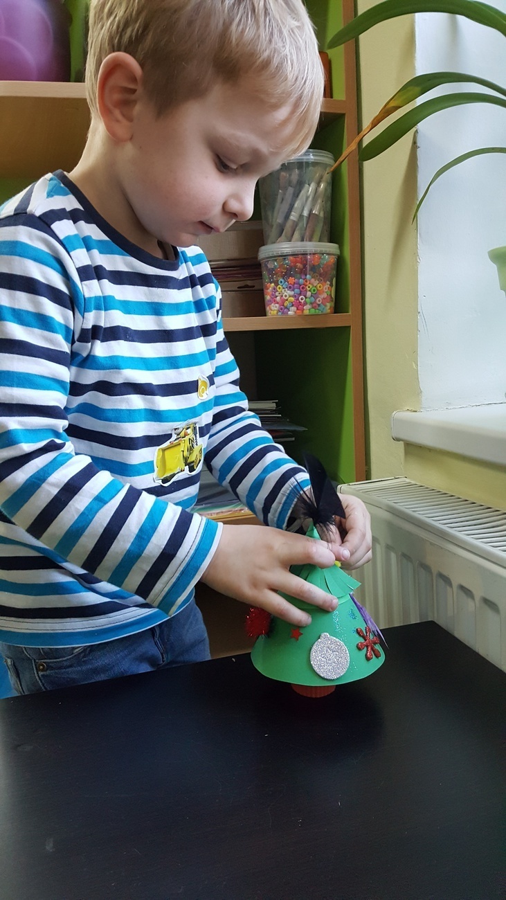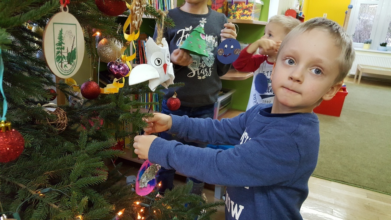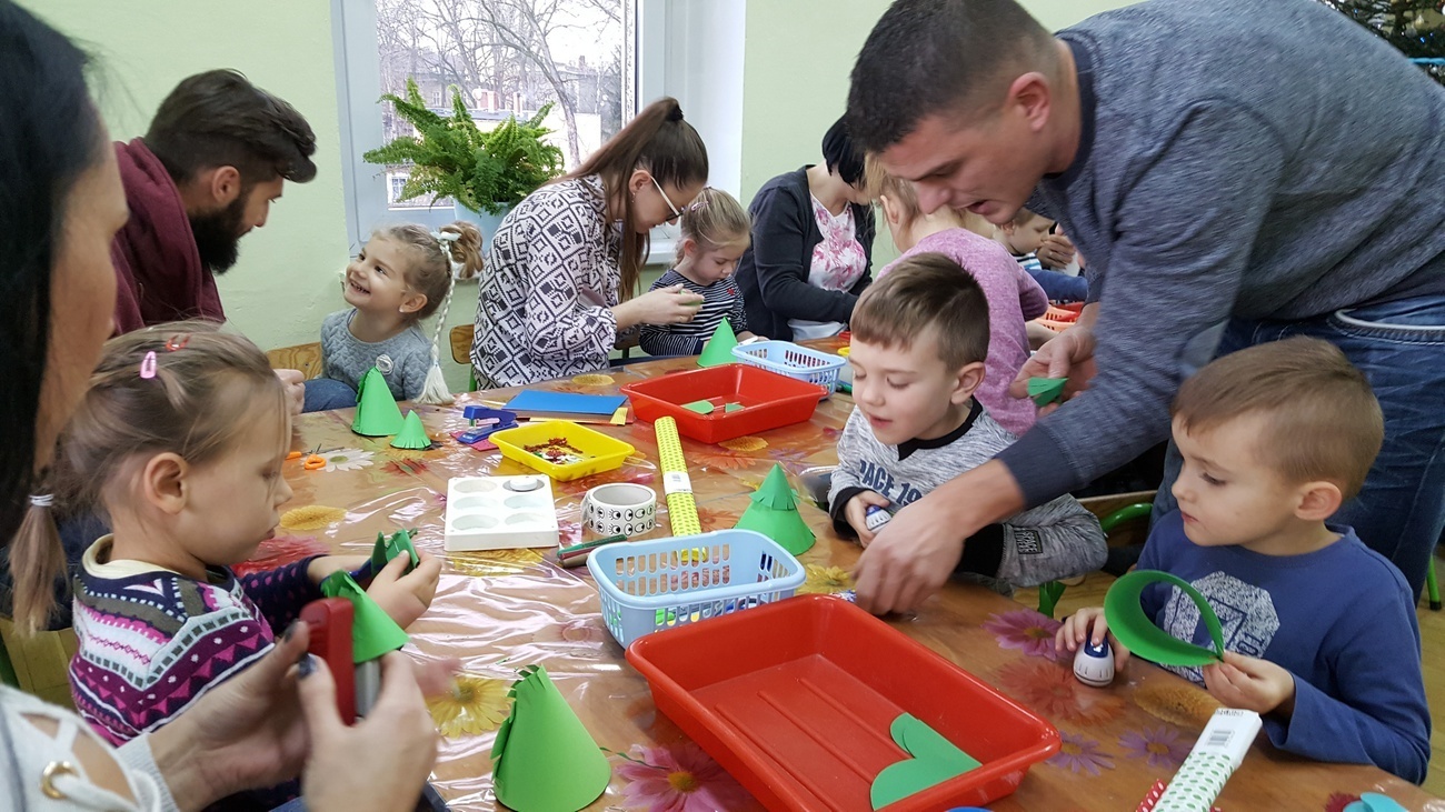 Wspólnie z rodzicami wykonywaliśmy dziś ozdoby choinkowe. Przy jednym stole pełnym przygotowanych wcześniej materiałów plastycznych zasiedliśmy by wykonać fantazyjne choinki i bombki. Efekt przerósł nasze oczekiwania. Dzięki pomocy rodziców powstało mnóstwo wspaniałych ozdób, które udekorowały naszą przedszkolną choinkę.