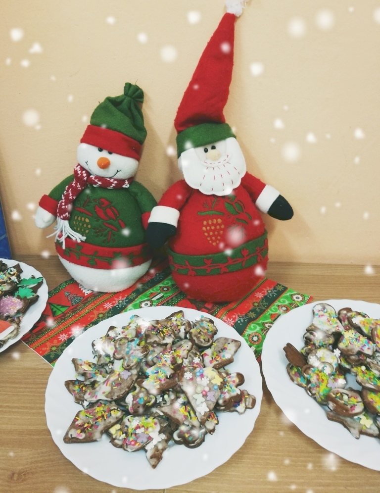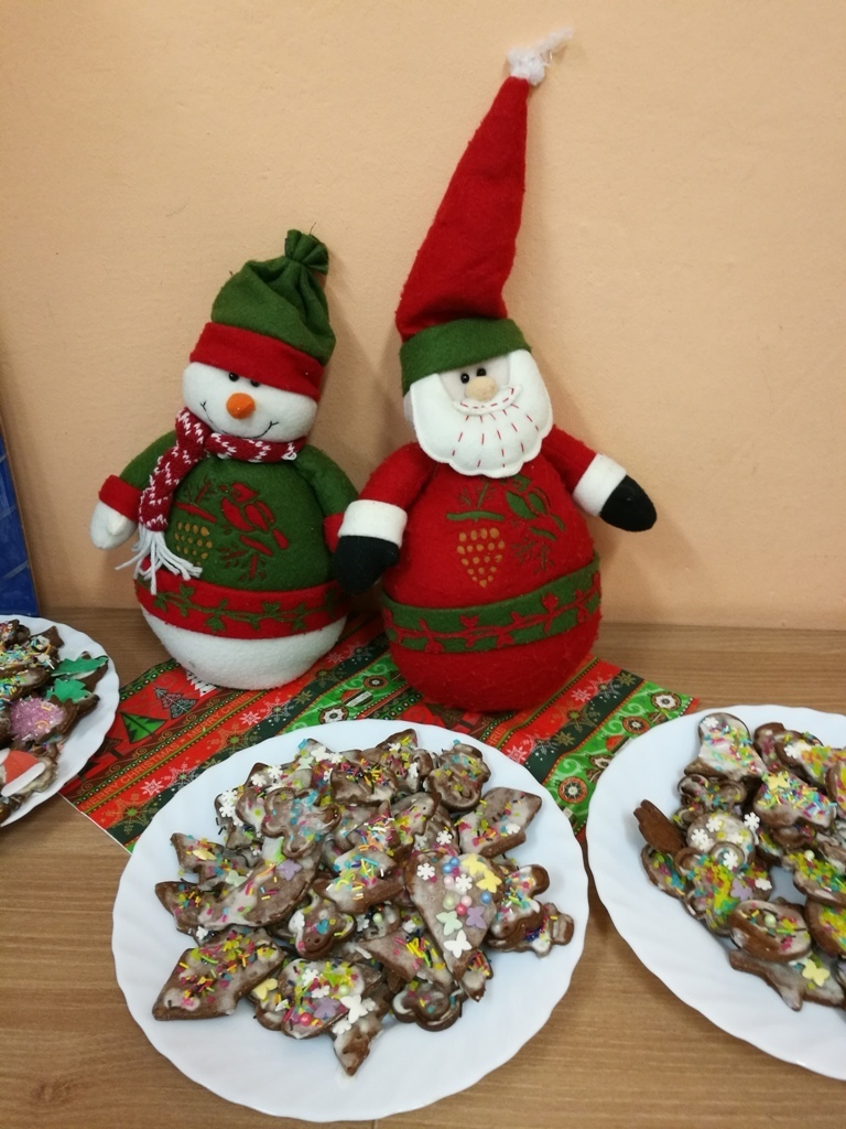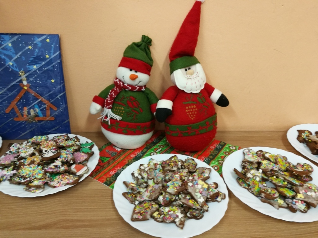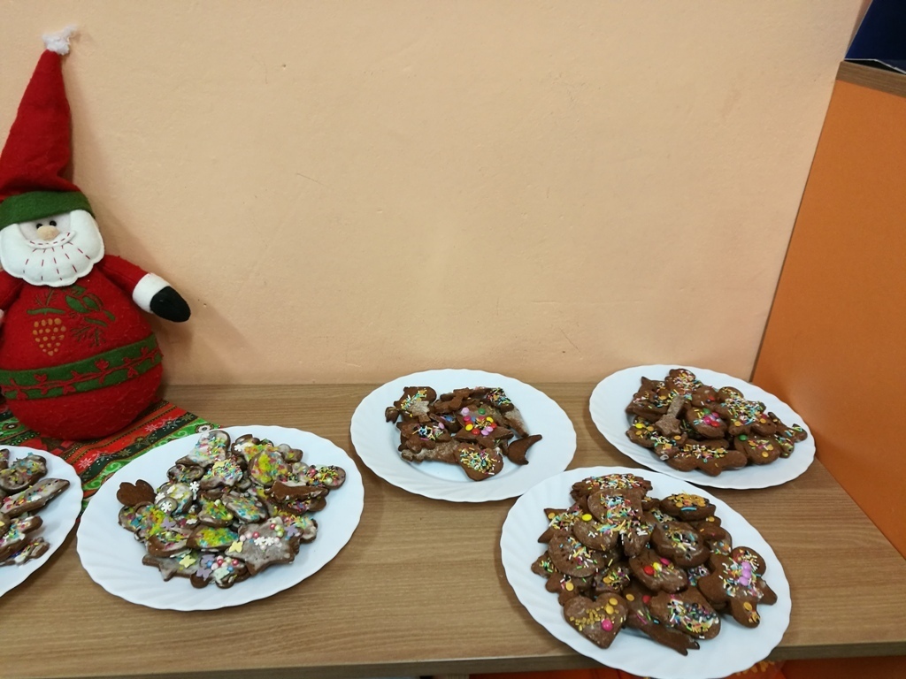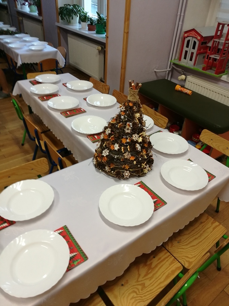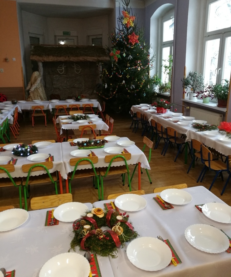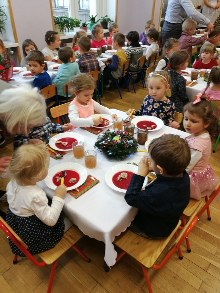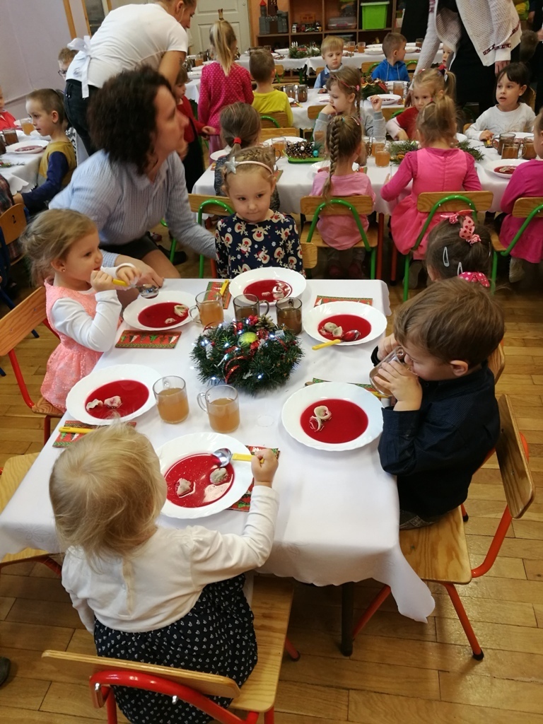 Wspólne chwile rozpoczęły się od podzielenia opłatkiem i życzenia sobie pomyślności oraz wesołych świąt. W dalszej części uroczystości dzieci spożywały obiad wigilijny, smaczny barszcz z uszkami, rybę po grecku i kompot z suszu. Na deser przedszkolaki częstowały się pierniczkami które wykonały i zdobiły własnoręcznie ze swymi wychowawczyniami.