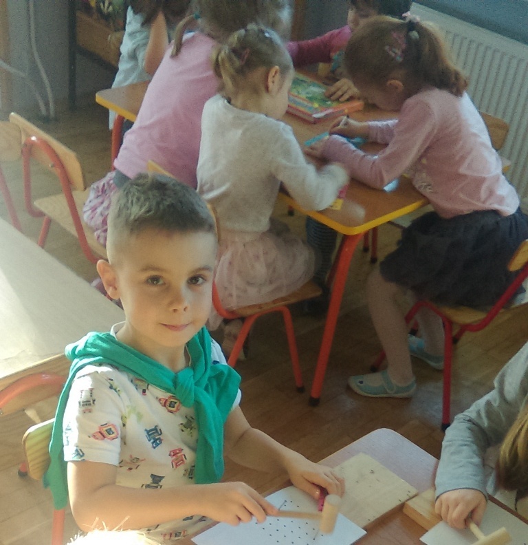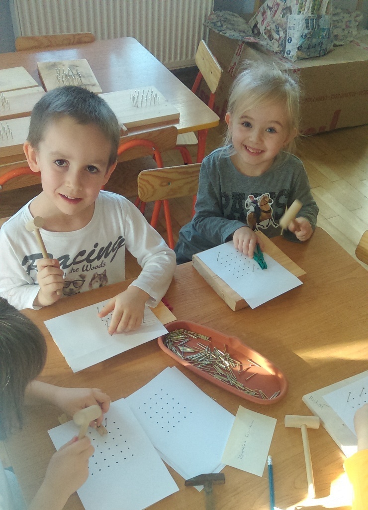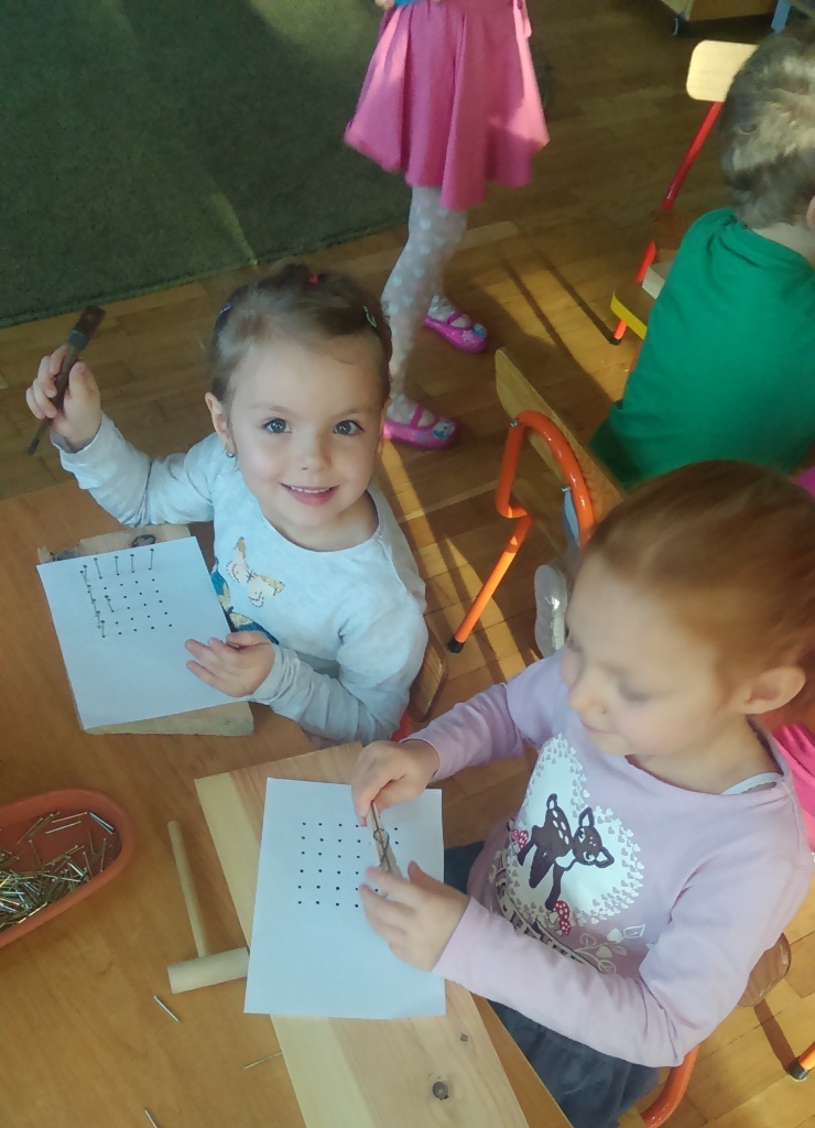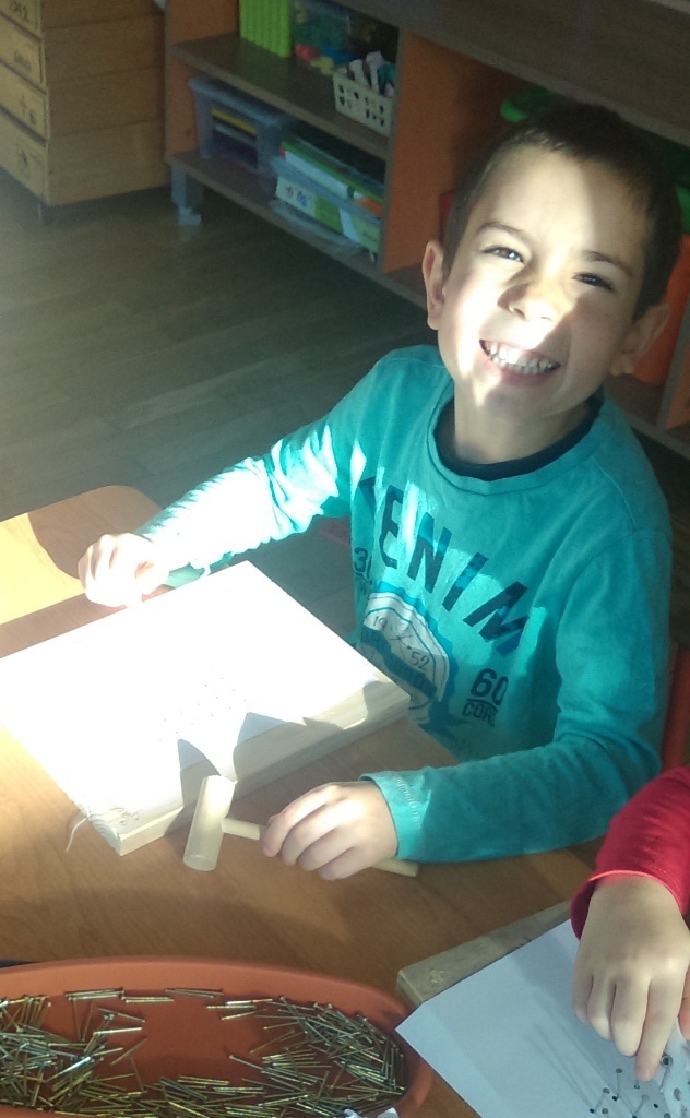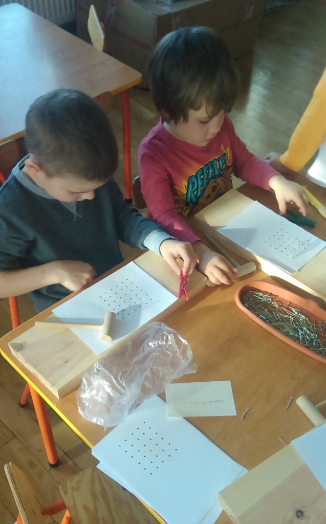Dzisiaj odbyły się kolejne spośród całego cyklu zajęć pod hasłem ROBÓTKOWO. Było dość głośno, ponieważ sami wykonywaliśmy dla siebie zabawki. Potrzebne nam do tego były klamerki, małe gwoździe i deseczki, od pani dostaliśmy małe młotki. Kiedy już skończyliśmy przybijać gwoździe dostaliśmy kolorowe gumeczki, które wykorzystaliśmy do tworzenia kompozycji jakich jakich tylko chcieliśmy. Było fajnie nie wiedzieliśmy, że mamy tyle siły.