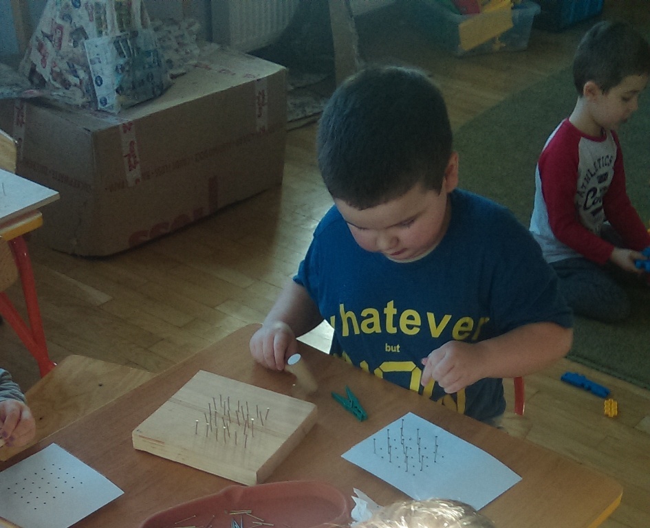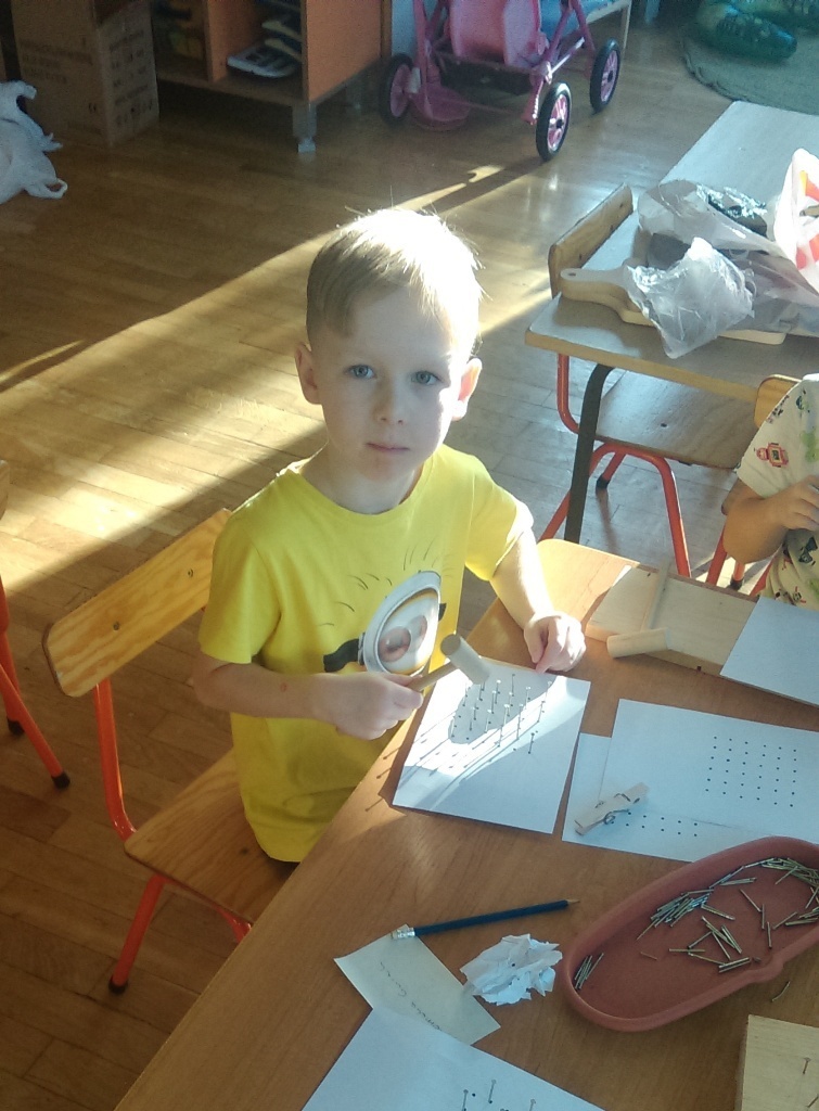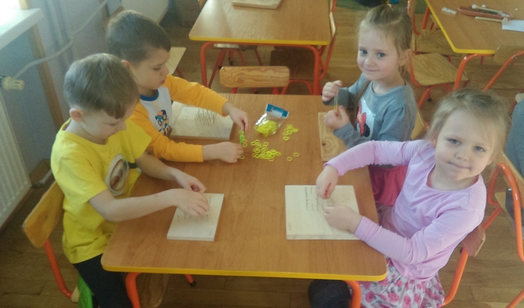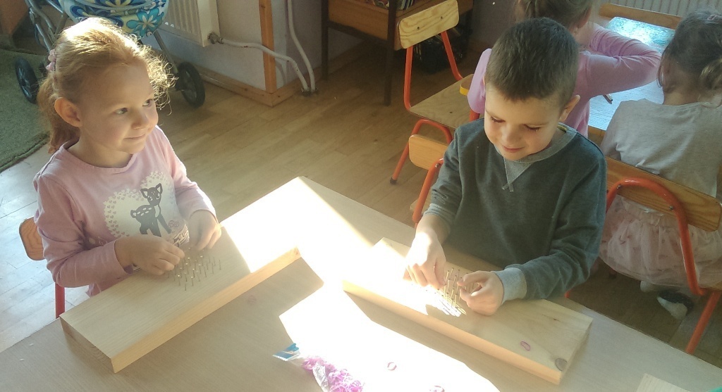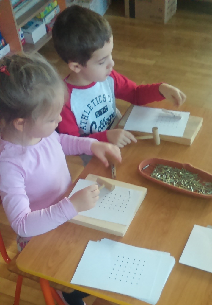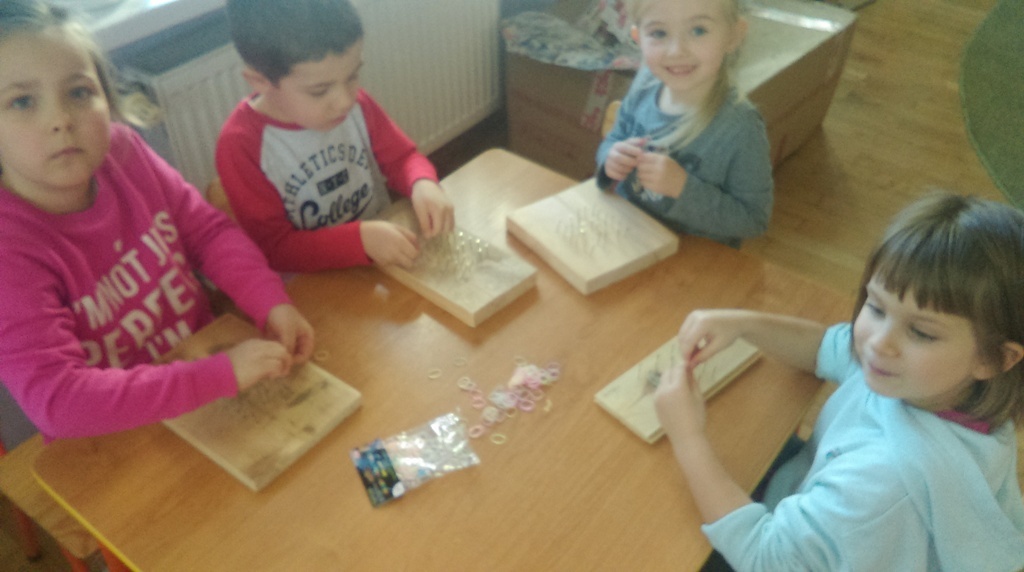 Dzisiaj odbyły się kolejne spośród całego cyklu zajęć pod hasłem ROBÓTKOWO. Było dość głośno, ponieważ sami wykonywaliśmy dla siebie zabawki. Potrzebne nam do tego były klamerki, małe gwoździe i deseczki, od pani dostaliśmy małe młotki. Kiedy już skończyliśmy przybijać gwoździe dostaliśmy kolorowe gumeczki, które wykorzystaliśmy do tworzenia kompozycji jakich jakich tylko chcieliśmy. Było fajnie nie wiedzieliśmy, że mamy tyle siły.