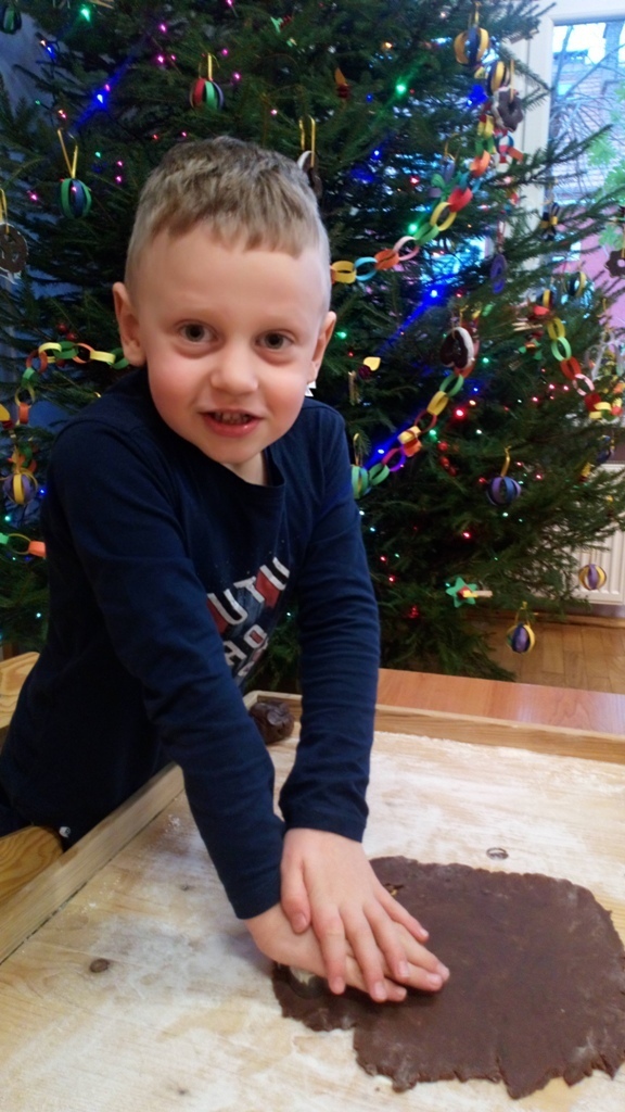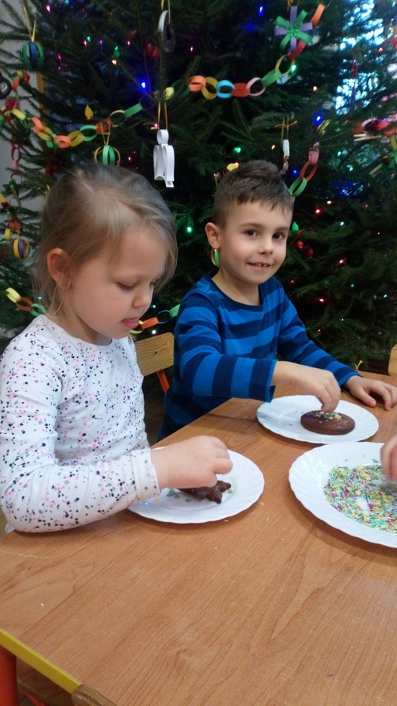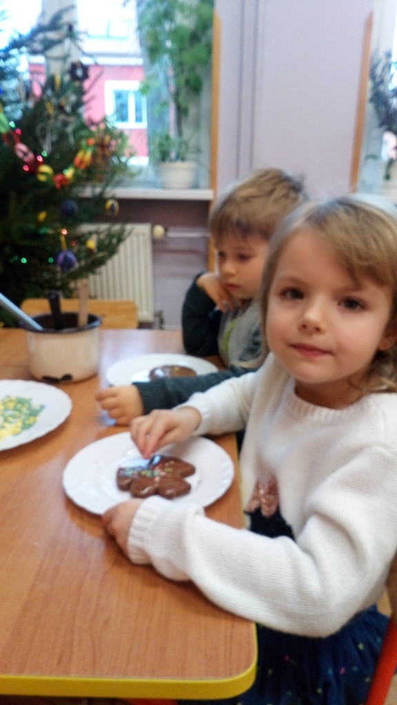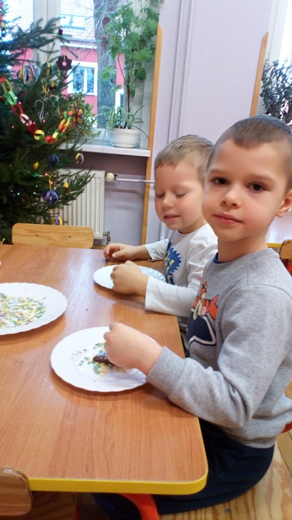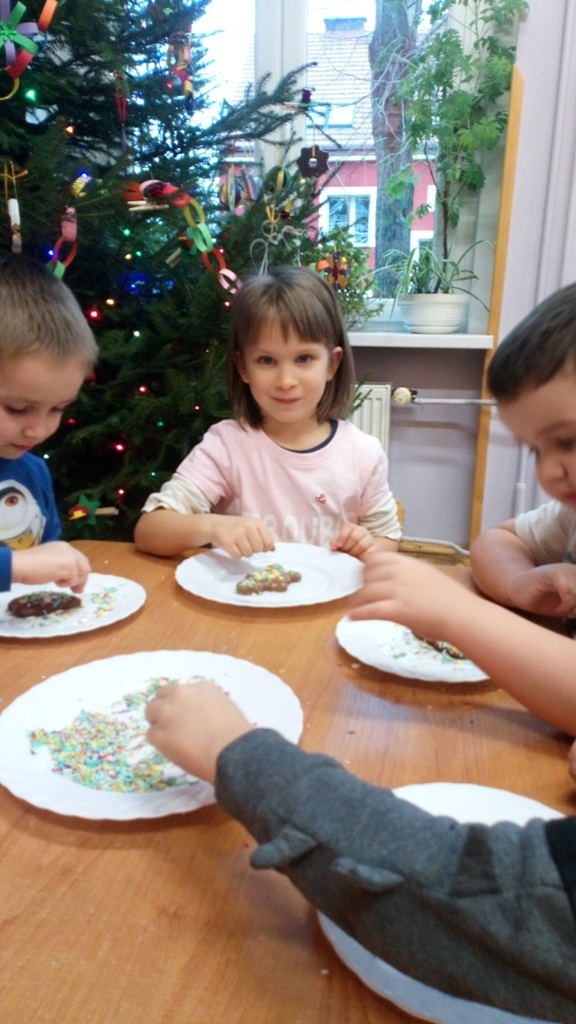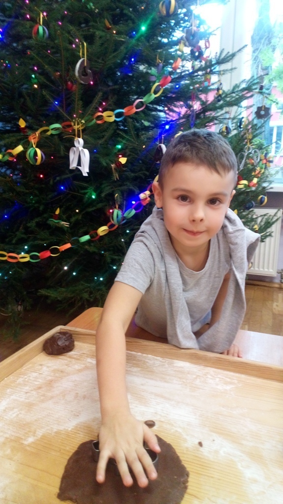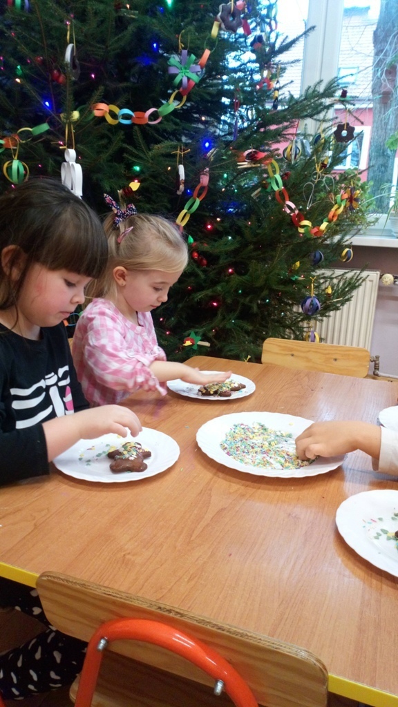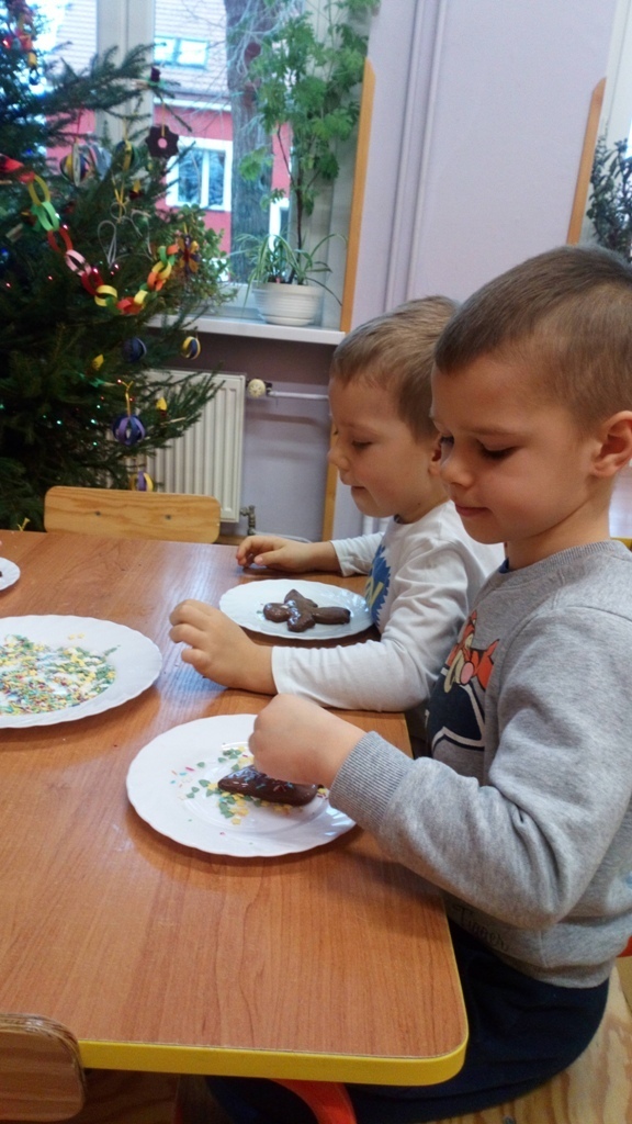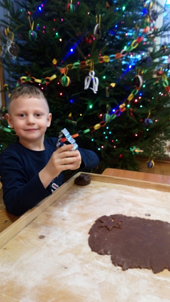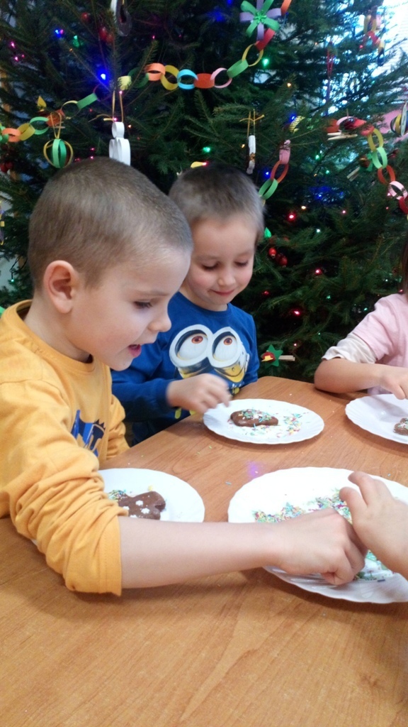 Tradycją już się stało w naszym przedszkolu, że przed wigilią pieczemy wspólnie pierniki. I w tym roku również podwinęliśmy rękawy i zabraliśmy się do pracy. Gdy wycięliśmy już wszystkie wzory zesłaliśmy nasze ciasteczka do kuchni. Nie musieliśmy długo czekać, aby całe przedszkole wypełniło się pysznym zapachem pierników. Szkoda, że nie mogliśmy ich od razu zjeść. Podczas dekorowania pierniczków było nam bardzo słodko i to nie prawda, że gwiazdki, choinki i śnieżynki cukrowe smakują tak samo. Już nie możemy doczekać się przedszkolnej wigilii, żeby je zjeść, nasze pierniczki.