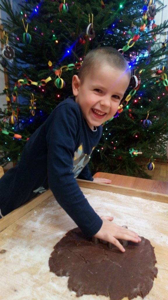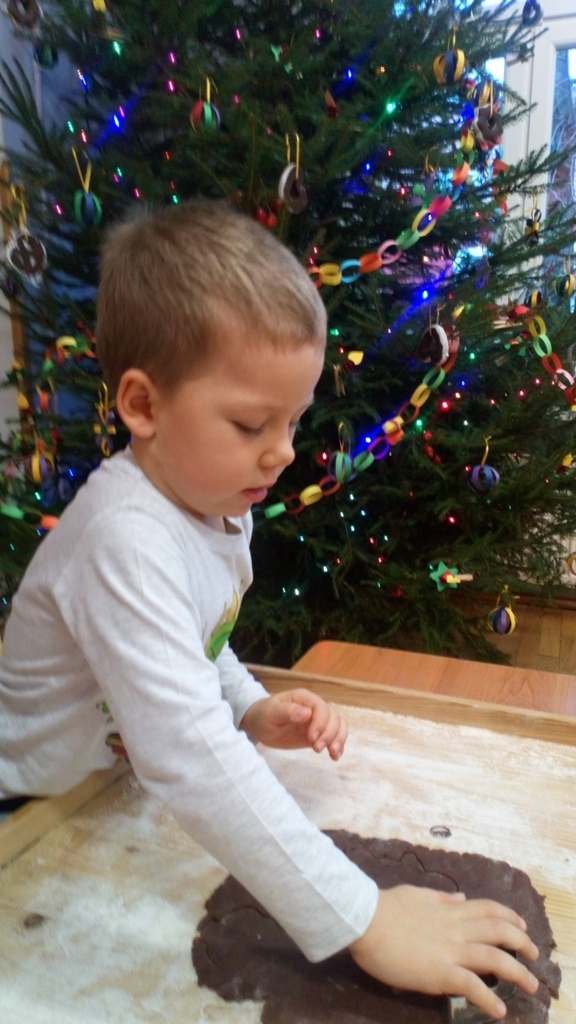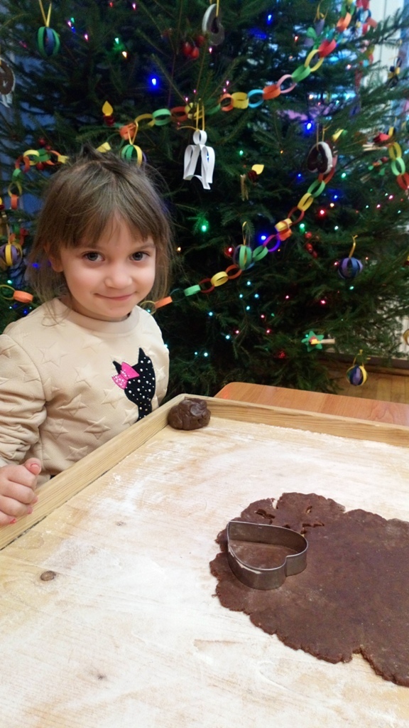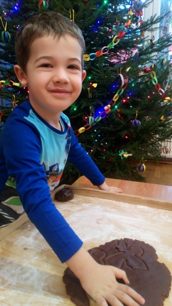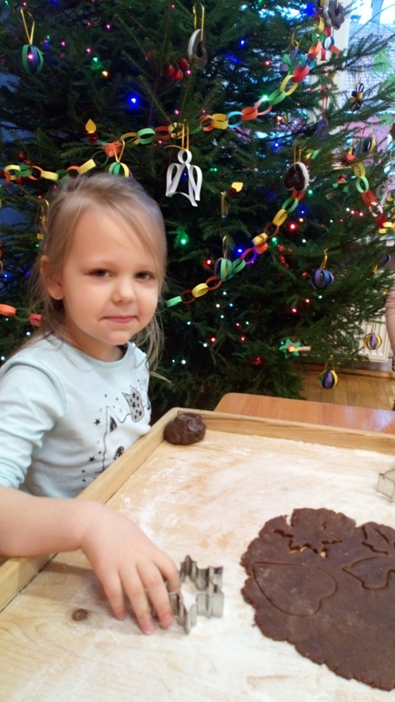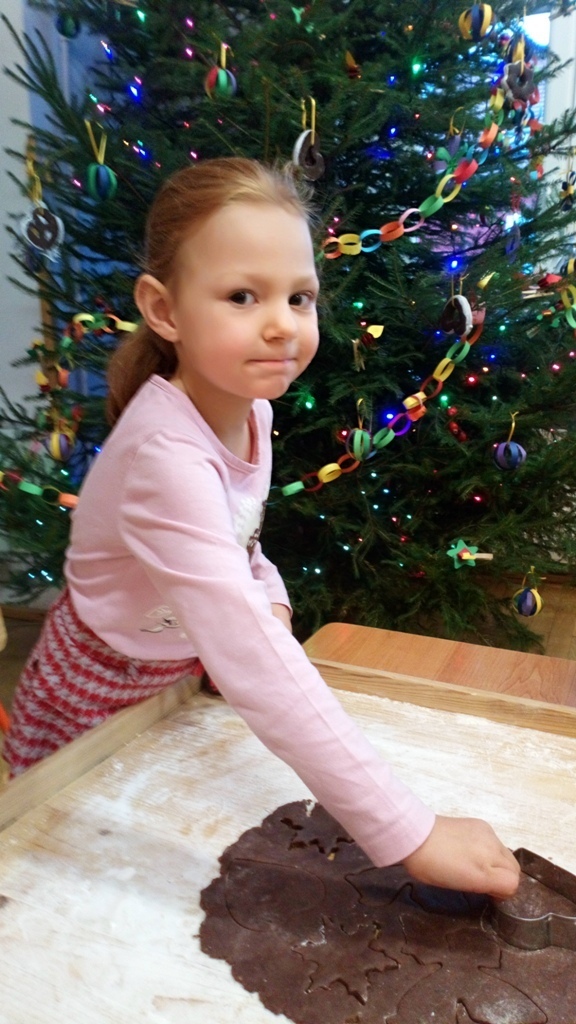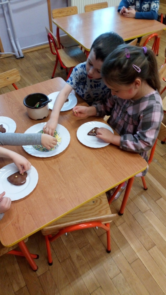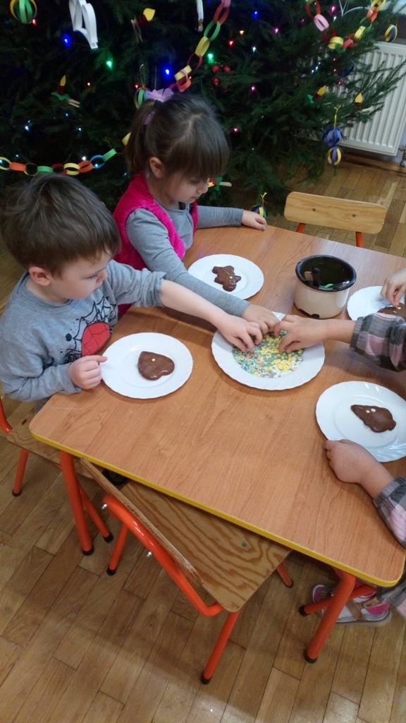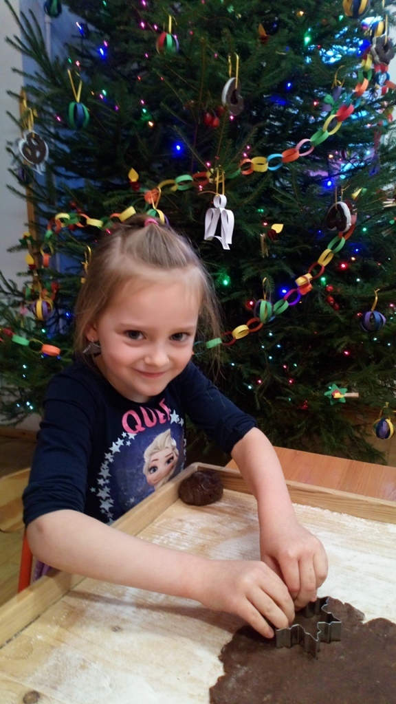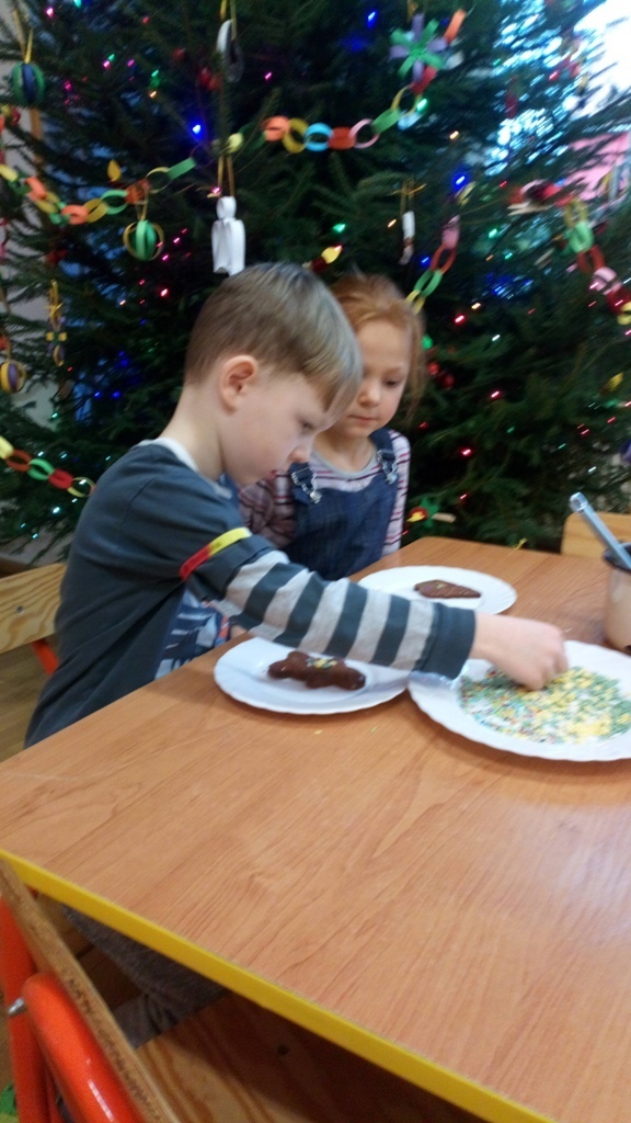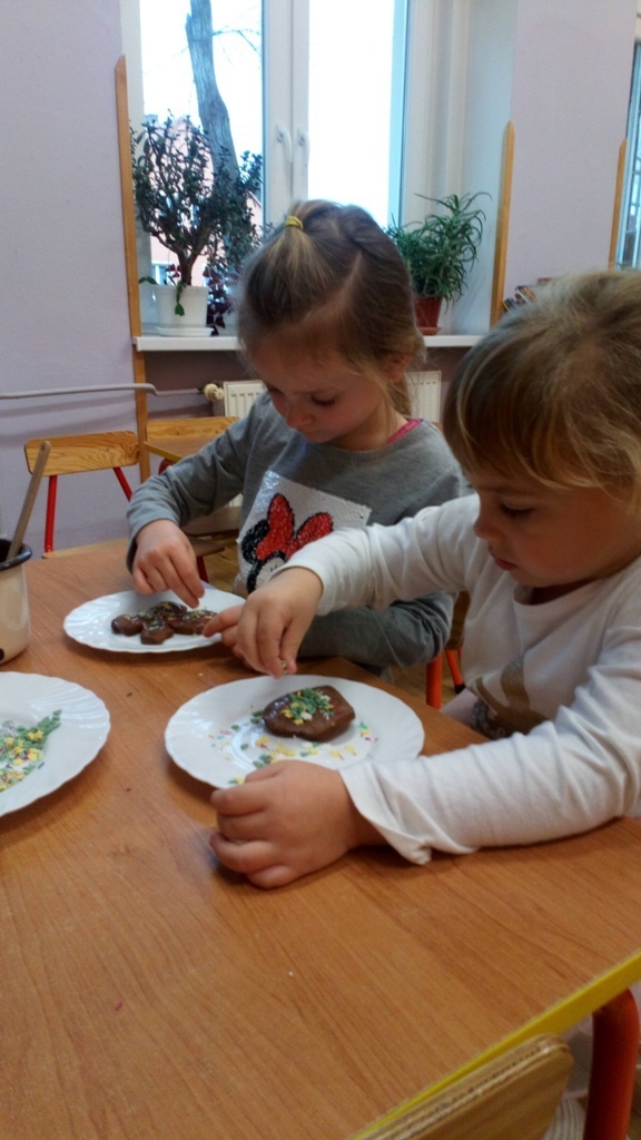 Tradycją już się stało w naszym przedszkolu, że przed wigilią pieczemy wspólnie pierniki. I w tym roku również podwinęliśmy rękawy i zabraliśmy się do pracy. Gdy wycięliśmy już wszystkie wzory zesłaliśmy nasze ciasteczka do kuchni. Nie musieliśmy długo czekać, aby całe przedszkole wypełniło się pysznym zapachem pierników. Szkoda, że nie mogliśmy ich od razu zjeść. Podczas dekorowania pierniczków było nam bardzo słodko i to nie prawda, że gwiazdki, choinki i śnieżynki cukrowe smakują tak samo. Już nie możemy doczekać się przedszkolnej wigilii, żeby je zjeść, nasze pierniczki.