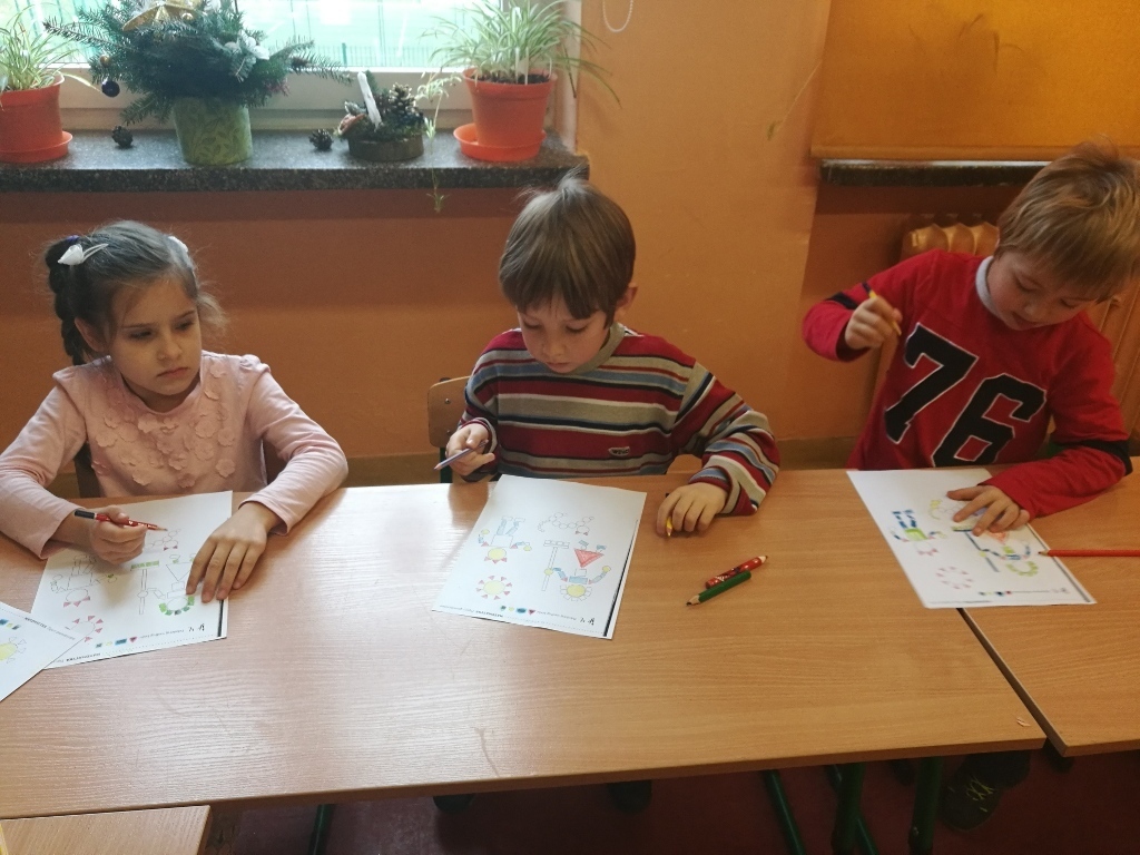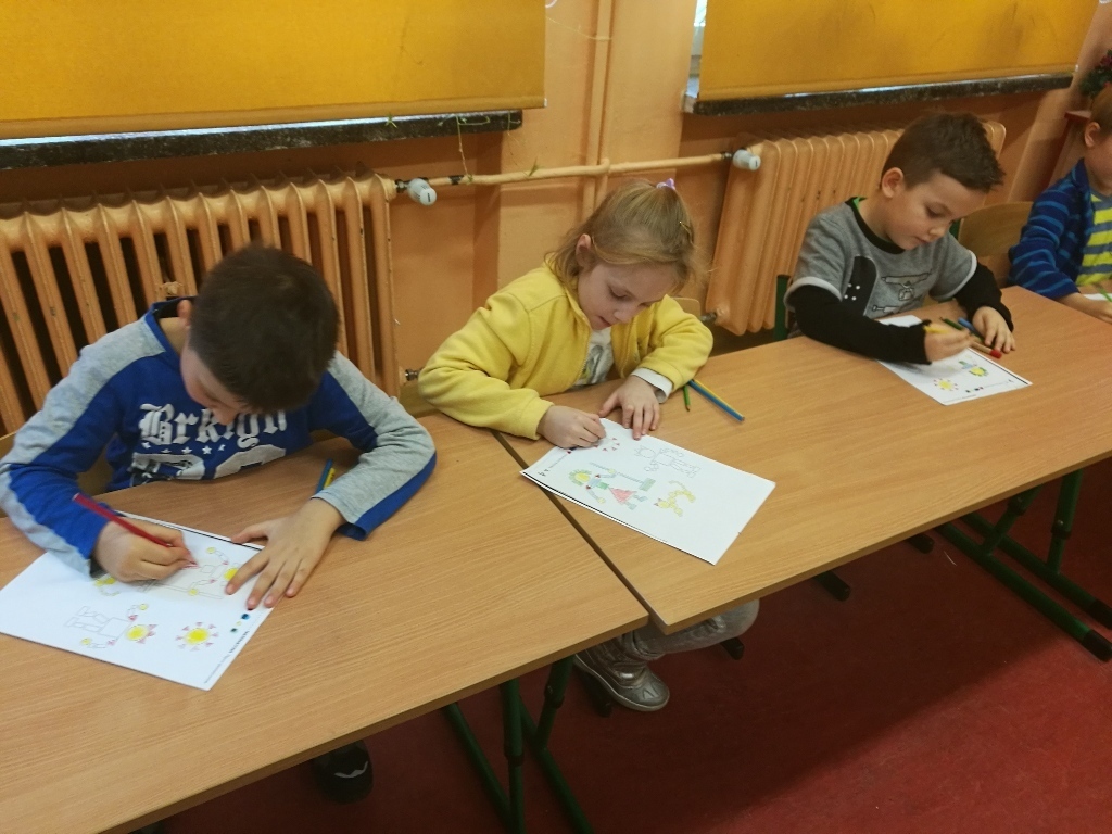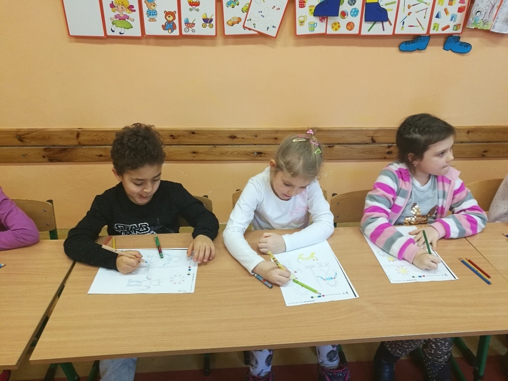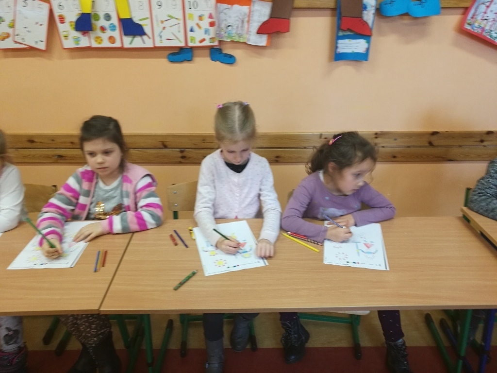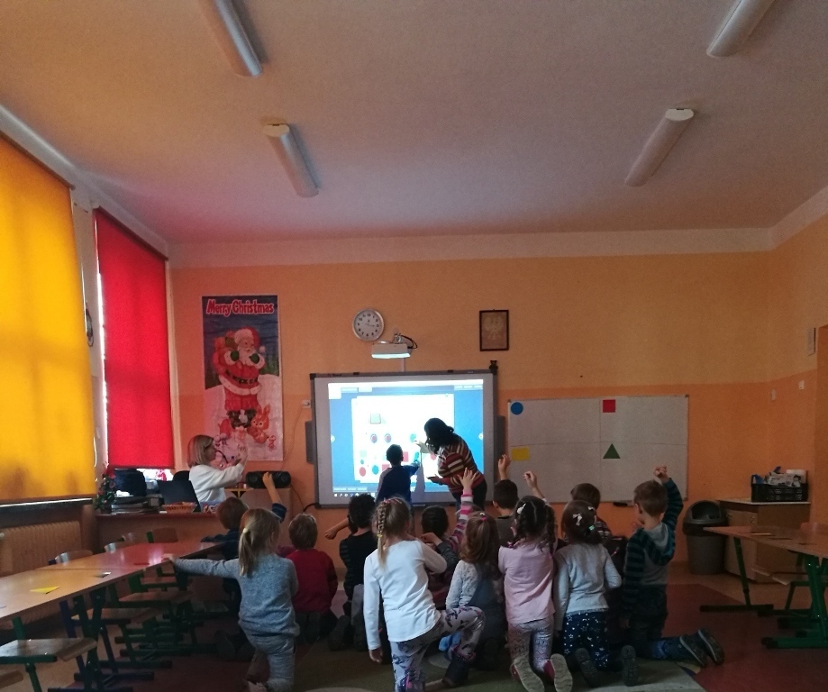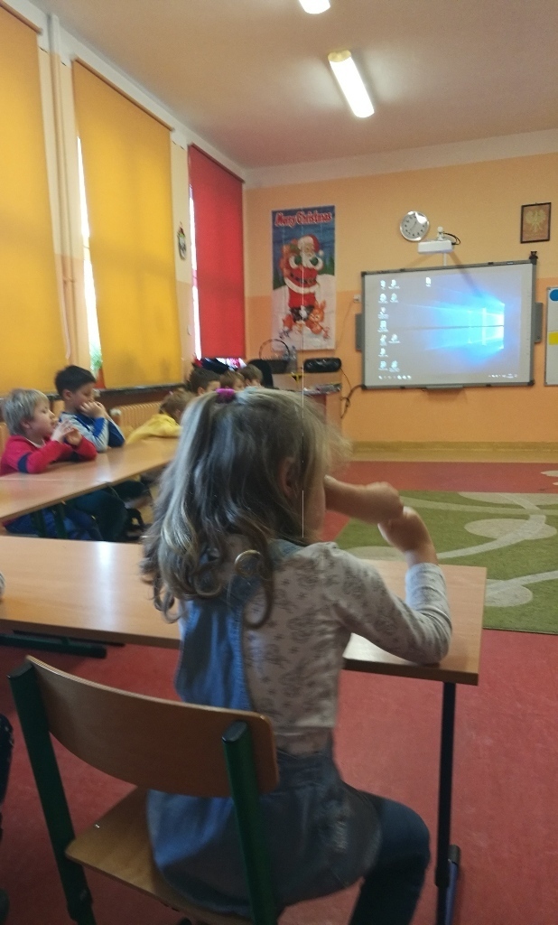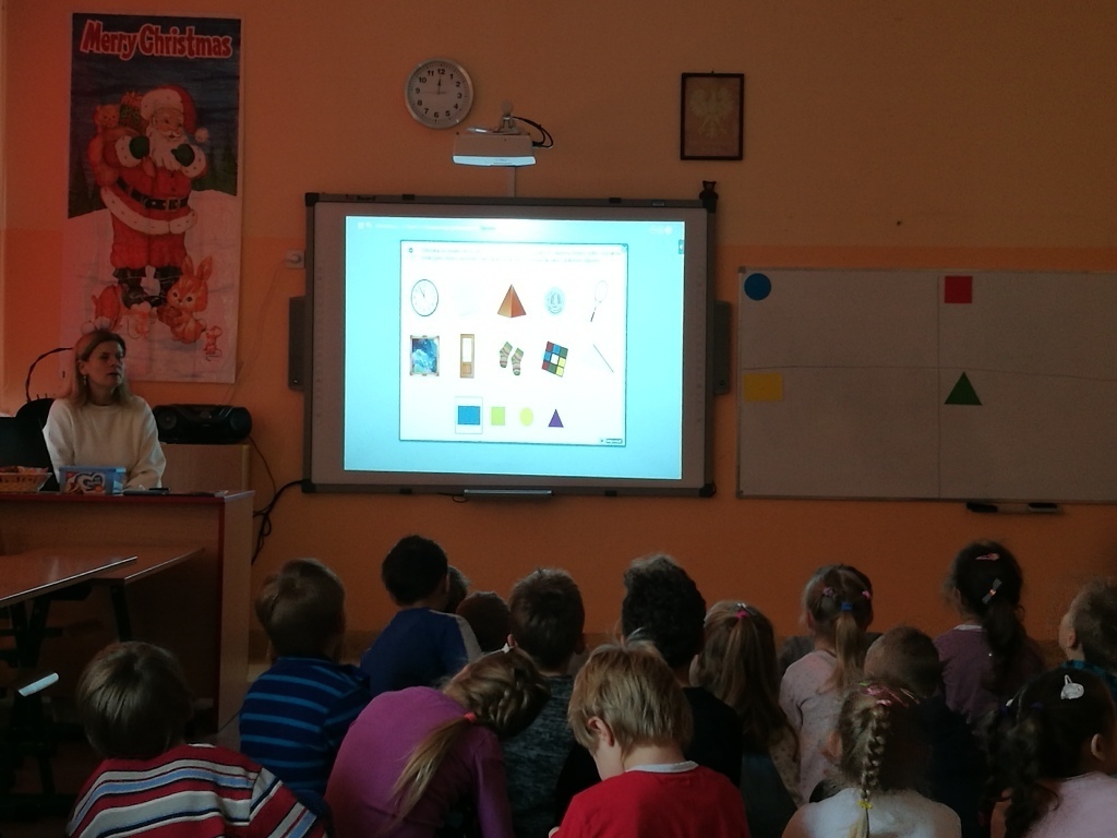 Starszaki z gr.V były już w Sp 10, Sp 707 w Karpaczu a tym razem odwiedziliśmy Szkołę Podstawową nr 13. Po przyjściu do szkoły i rozebraniu się w szatni udaliśmy się do sali jednej z klas pierwszych. Tam przywitały nas dwie panie nauczycielki, które zaprosiły na na lekcje matematyki. Zajęcia były prowadzone z wykorzystaniem tablicy interaktywnej. Powtórzyliśmy nasze wiadomości na temat podstawowych figur geometrycznych. Każdy z nas miał możliwość podejść do tablicy i wykonać na niej przygotowane zadanie. Łączyliśmy figury w zbiory, tworzyliśmy z nich różne obrazki, odnajdywaliśmy ich kształty w przedmiotach codziennego użytku. Na koniec wykonaliśmy przygotowane karty pracy. Zajęcia nam się bardzo podobały a sama tablica zrobiła na nas duże wrażenie. Byłoby bardzo ciekawie, gdybyśmy mogli w przyszłym roku pracować z takimi pomocami.
