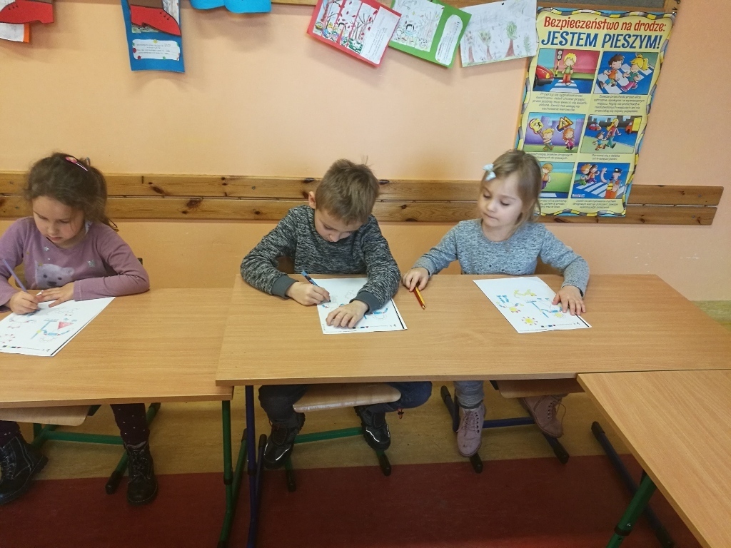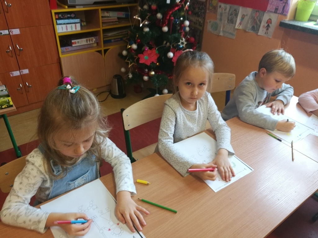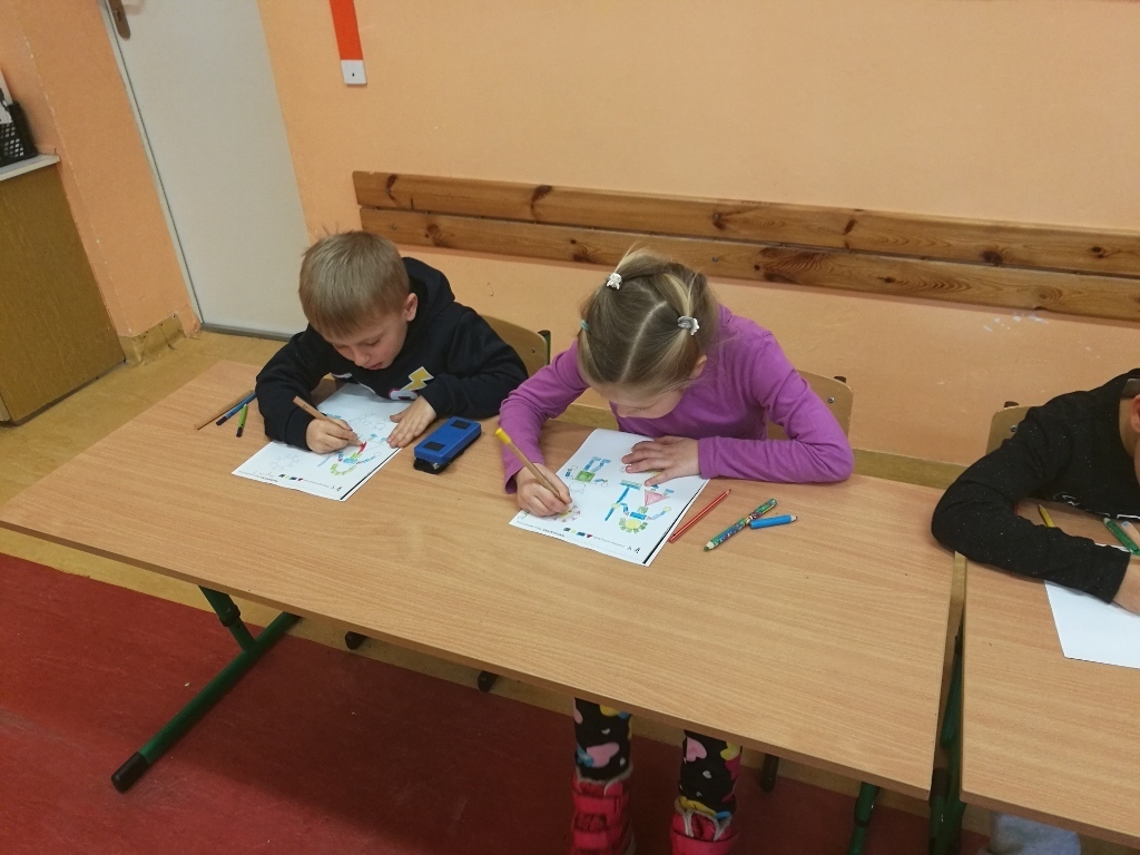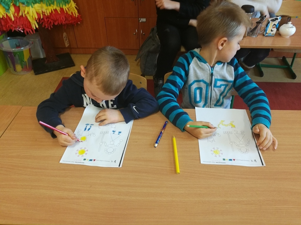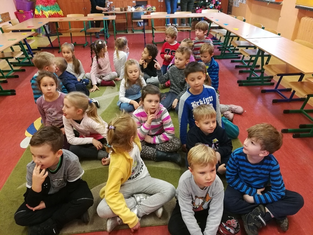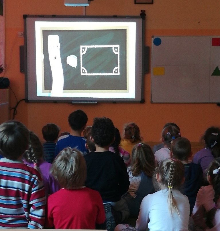 Starszaki z gr.V były już w Sp 10, Sp 707 w Karpaczu a tym razem odwiedziliśmy Szkołę Podstawową nr 13. Po przyjściu do szkoły i rozebraniu się w szatni udaliśmy się do sali jednej z klas pierwszych. Tam przywitały nas dwie panie nauczycielki, które zaprosiły na na lekcje matematyki. Zajęcia były prowadzone z wykorzystaniem tablicy interaktywnej. Powtórzyliśmy nasze wiadomości na temat podstawowych figur geometrycznych. Każdy z nas miał możliwość podejść do tablicy i wykonać na niej przygotowane zadanie. Łączyliśmy figury w zbiory, tworzyliśmy z nich różne obrazki, odnajdywaliśmy ich kształty w przedmiotach codziennego użytku. Na koniec wykonaliśmy przygotowane karty pracy. Zajęcia nam się bardzo podobały a sama tablica zrobiła na nas duże wrażenie. Byłoby bardzo ciekawie, gdybyśmy mogli w przyszłym roku pracować z takimi pomocami.
