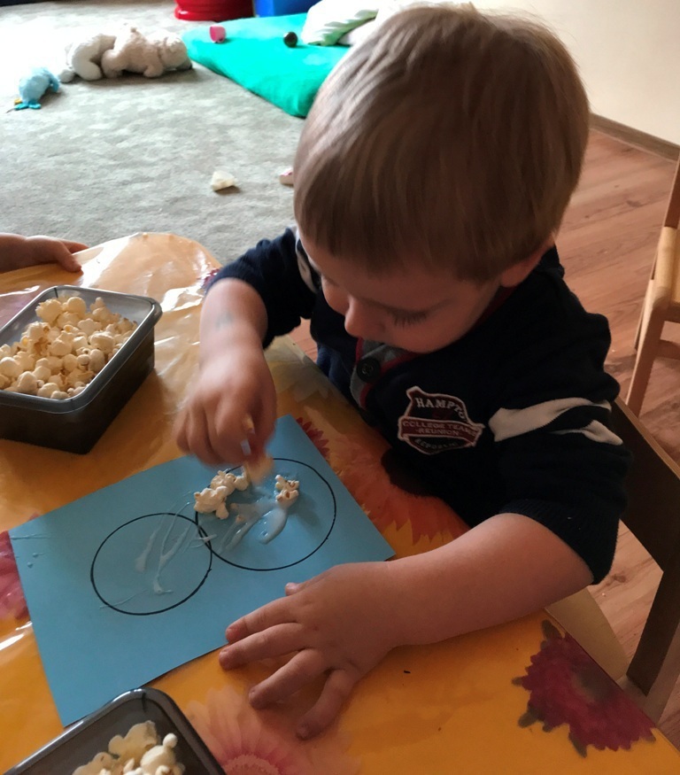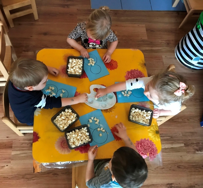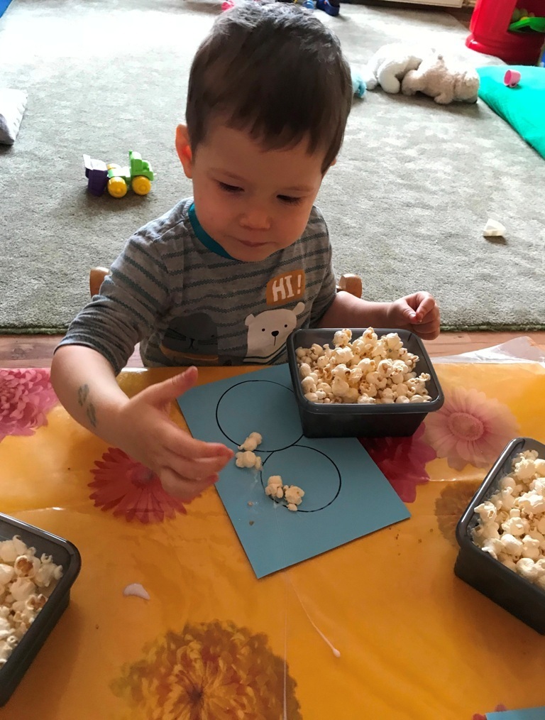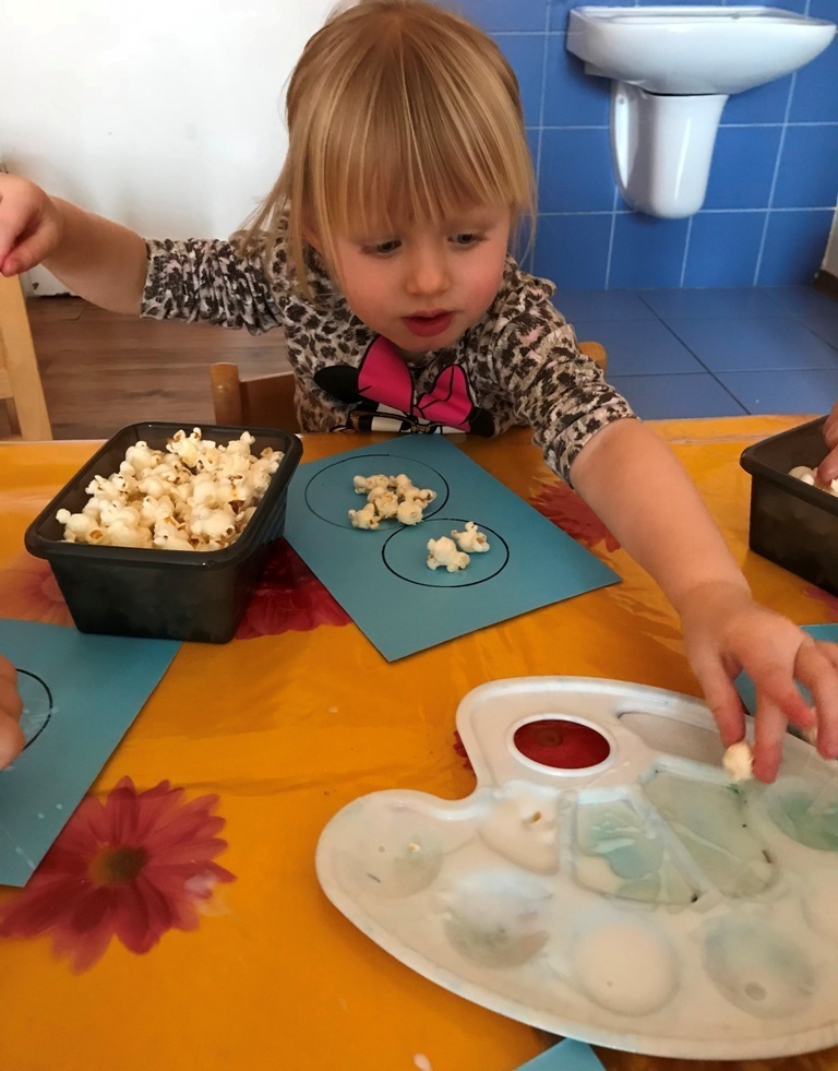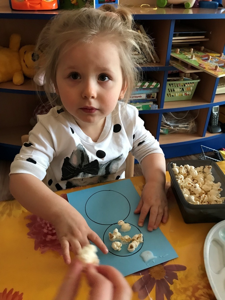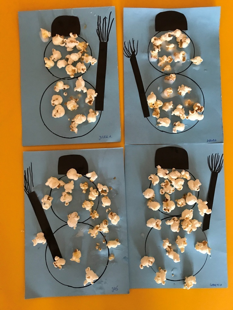 Popkorn wszystkim dzieciom kojarzy się z seansem filmowym w kinie. Grupa Smerfów podjęła wyzwanie, aby sprawdzić do czego jeszcze możemy wykorzystać ten smakołyk. Jednak na samym początku dociekania musieliśmy ustalić skąd wziął się popkorn. Maluchy najpierw dokładnie oglądały ziarenka kukurydzy, później z bezpiecznej odległości obserwowały jak w „magicznej maszynie” powstaje ich ulubiony przysmak. Zaskoczone miny mówiły wiele. Ale to był dopiero początek eksperymentu. Kolejnym etapem było zaspokojenie ciekawości smakowej - czyli kosztowanie popkornu, a na koniec wyklejanie narysowanych konturów bałwanka. Jako, że nasza „magiczna maszyna” wystrzeliła dużą ilość „kukurydzy” każde z obecnych dzieci zabrało jeszcze troszkę do domu.