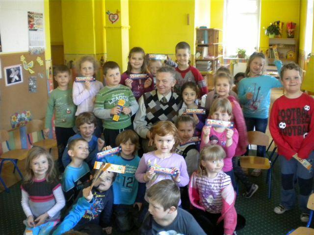 Pan Ryszard odwiedził nas by przeczytać nam kilka swoich ulubionych utworów z kanonu literatury dziecięcej. Świetnie się bawiliśmy słuchając „ Lokomotywy” i „ Rzepki” w jego wykonaniu. Mogliśmy także wysłuchać historii naszego gościa,który opowiedział nam o ceremonii nadania orderu i słynnym soku z cytryny. Każdy z nas był ciekawe czy udało się mu uśmiechnąć po takiej dawce witaminy C. Całe spotkanie zakończyło się serdecznymi życzeniami i obietnicami, że nie tylko będziemy szanować książki, które leżą u nas na półce ale przede wszystkim często będziemy do nich zaglądać – sami i razem z rodzicami.