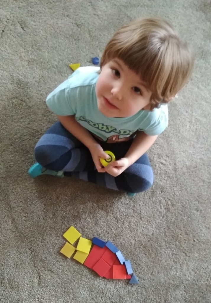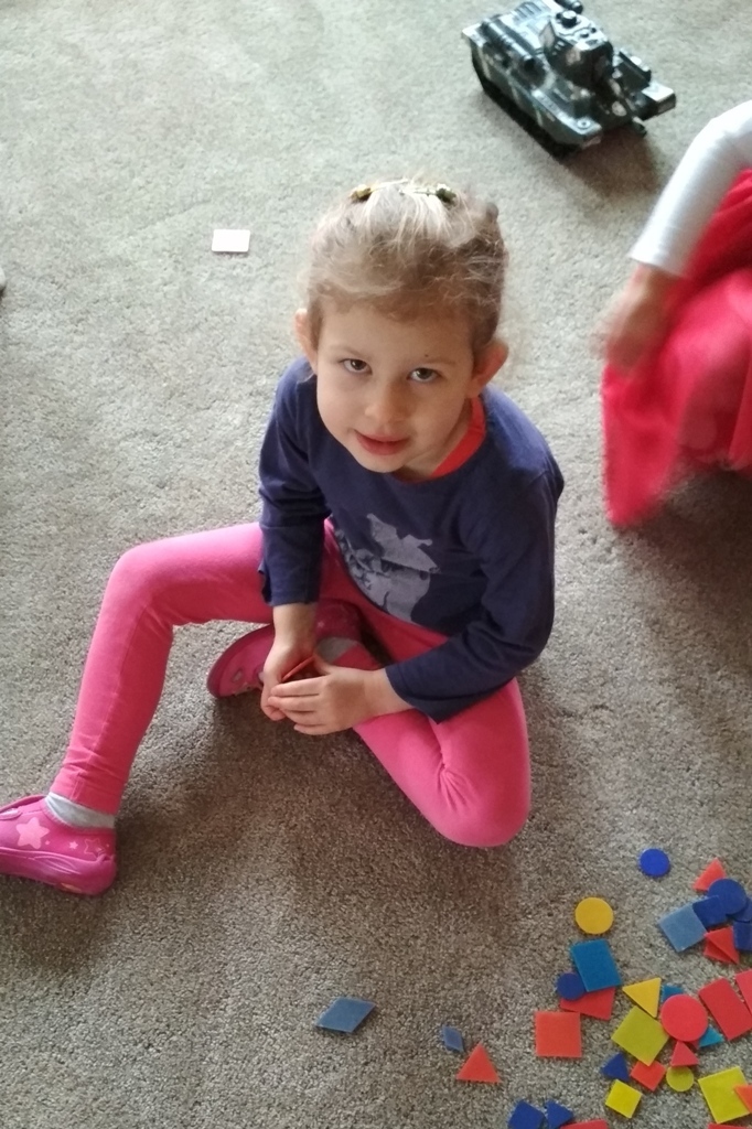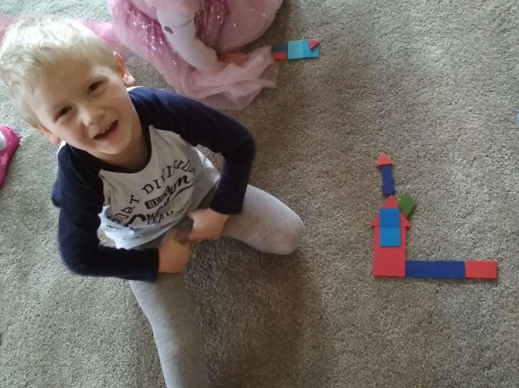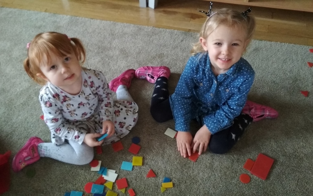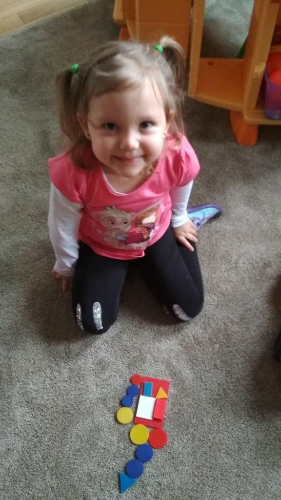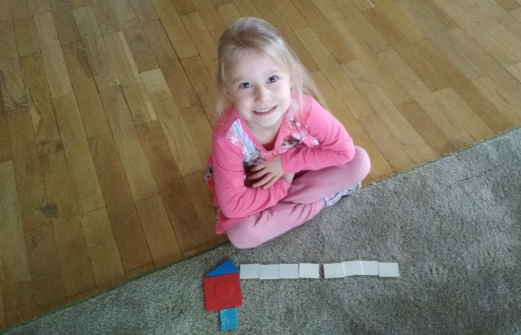 Zabawa w Boba budowniczego bardzo nam się podobała, dlatego wpadliśmy na pomysł, że zbudujemy z figur geometrycznych o różnej wielkości (koło, trójkąt, kwadrat, prostokąt) , wymarzony domek dla naszych Kochanych Dziadków, do którego jeździliśmy spędzić razem miło czas bawiąc się. Podczas zabawy utrwalaliśmy pojęcia matematyczne.