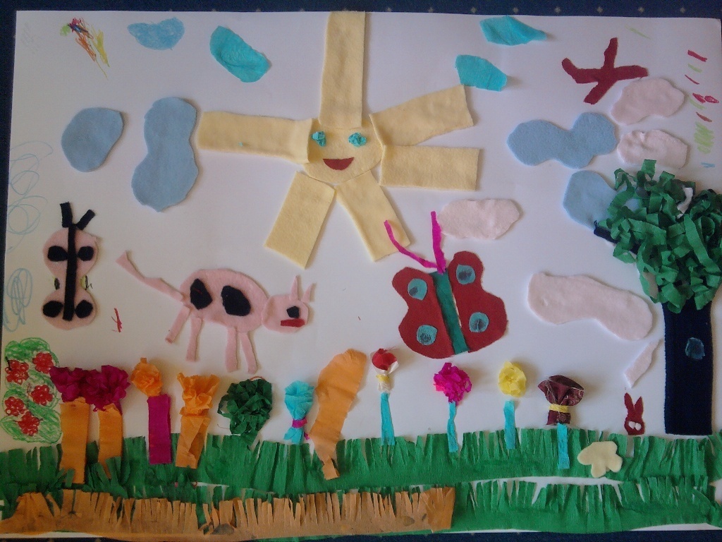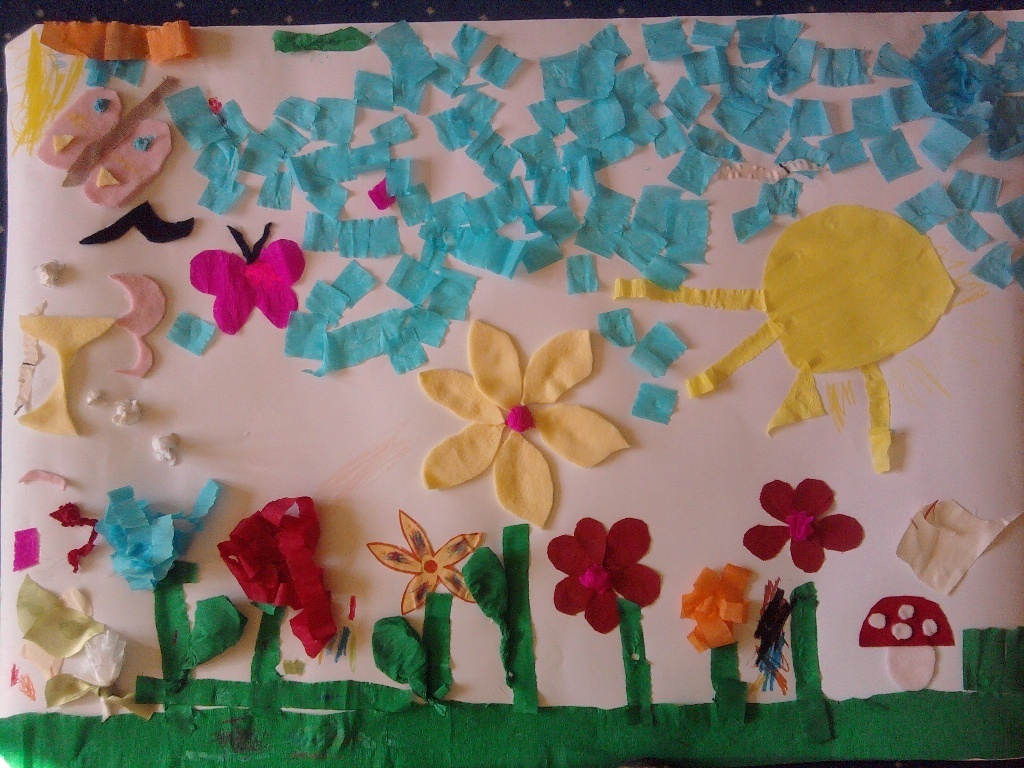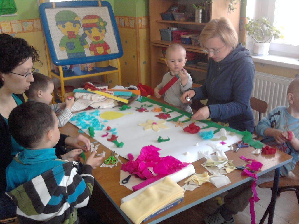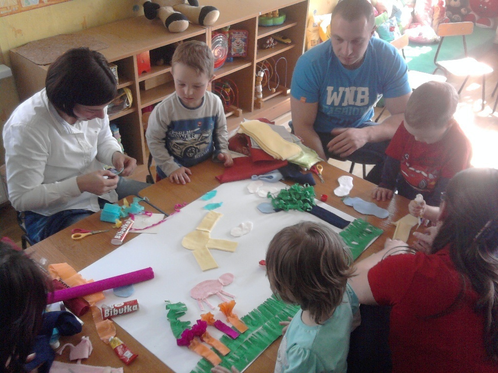 Zadanie nie należało do skomplikowanych, wykazać się trzeba było jedynie niewielkimi zdolnościami plastycznymi. Na zaproszonych gości czekały stanowiska pracy przygotowane przez wychowawczynię maluszków – panią Kasię. Techniką mieszaną wykonaliśmy dwa dzieła sztuki – obrazy przedstawiające wiosenną łąkę. Do naszych tworów użyliśmy skrawki materiałów, bibułę oraz pastele. Maluchy sypały pomysłami, które chętni rodzice pomagali im zrealizować. Dzieci wraz z opiekunami cięli, kleili i układali najróżniejsze kompozycje. Na naszej łące nie zabrakło więc grzybów, drzew, tęcz a nawet świnek i zajączków:).