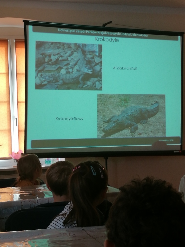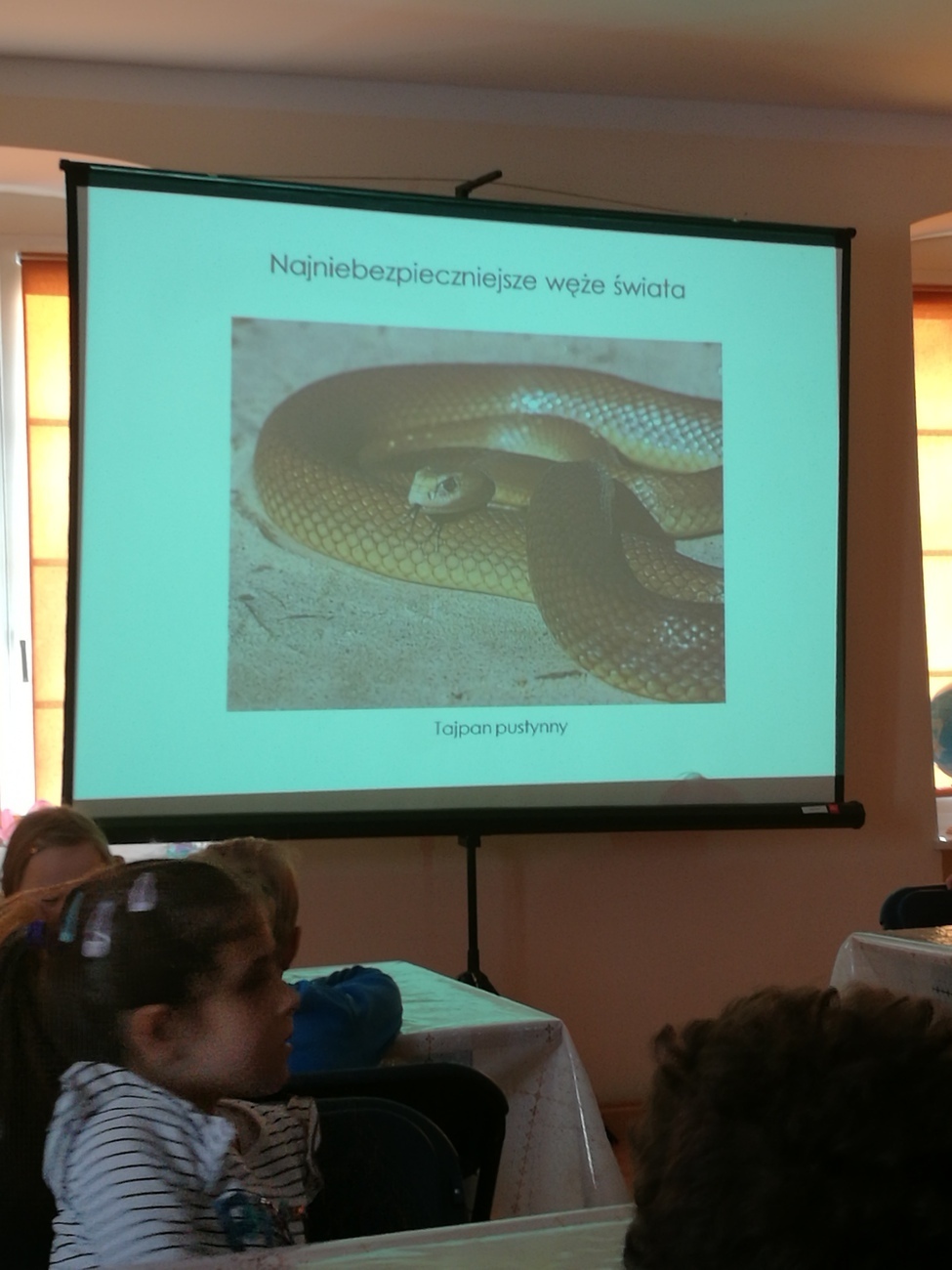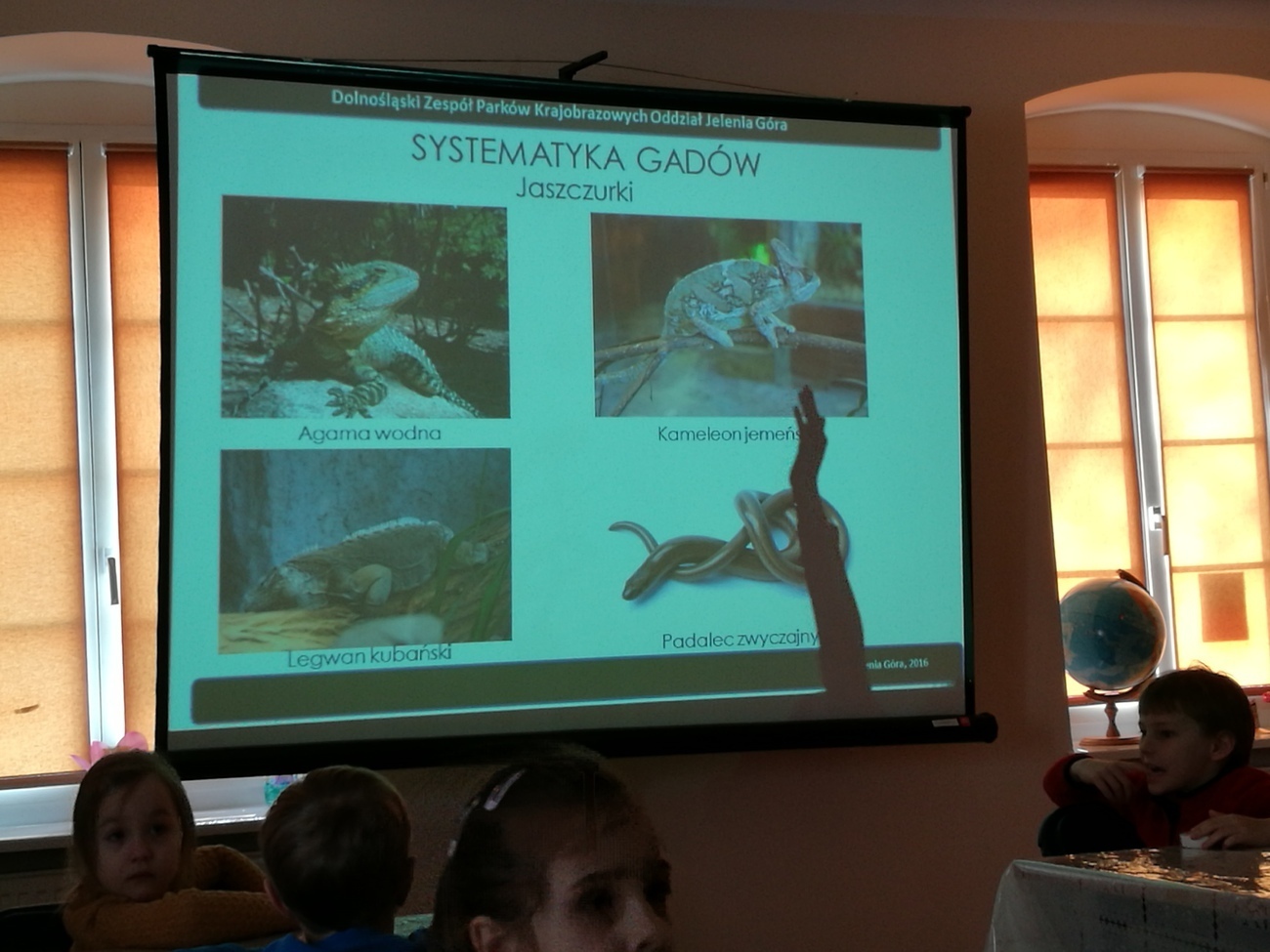 W ostatni piątek dzieci z grupy V brały udział w kolejnych zajęciach w Dolnośląskim Zespole Parków Krajobrazowych. Tematem zajęć były gady i jak przekonywał nas pan Adrian nie takie straszne jak się wydaje. Zajęcia rozpoczęliśmy od omówienia rożnych gatunków żółwi, następnie omówiliśmy: żmije, węże i jaszczurki. Mało kto z nas wiedział jak wiele zdolności mają te małe stworzenia. Gdy skończyliśmy temat gadów żyjących, przenieśliśmy się do tych, które już dawno nie chodzą po świecie. Dinozaury czyli ulubione zwierzęta starszaków, również należą do rodziny gadów i chociaż nikt z ludzi ich nigdy nie spotkał to przedszkolaki je dobrze znają i wiele mogą powiedzieć na ich temat. Na zakończenie zajęć czekała mała niespodzianka. Każdy starszak otrzymał do wykonania model dinozaura. Choć nie było to łatwe zadanie, wszyscy sobie z nim świetnie poradzili. Bardzo się nam te zajęcia podobały i rzeczywiście okazało się, że gad nie taki straszny.
