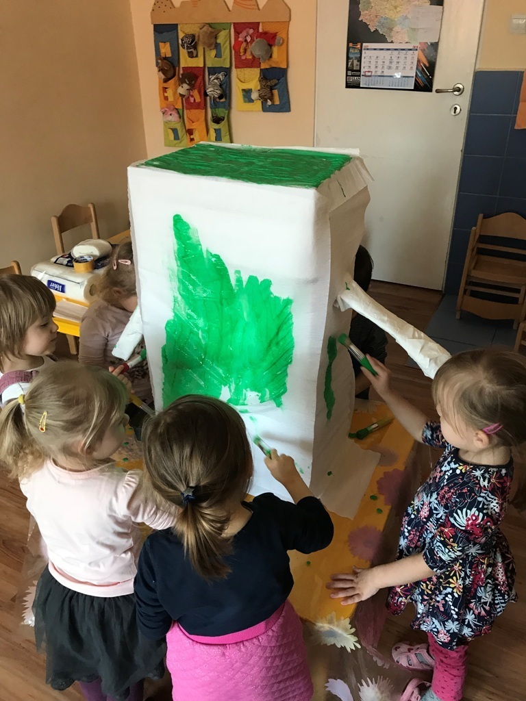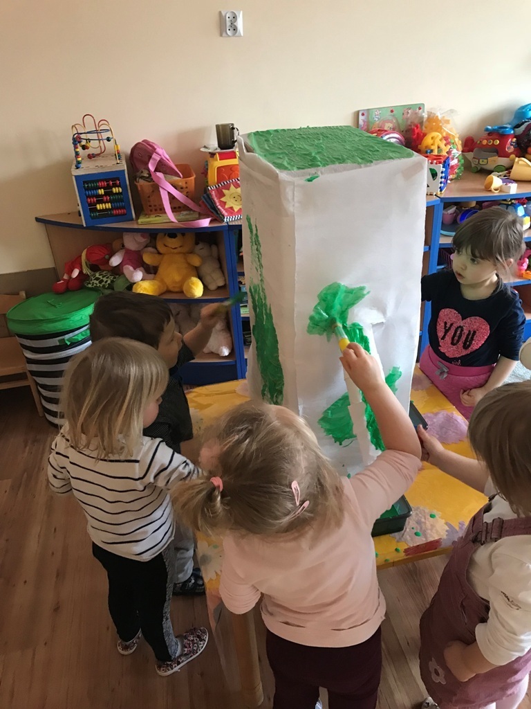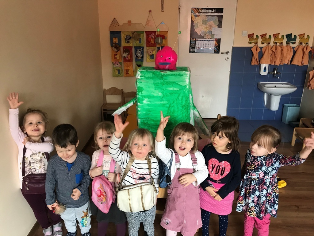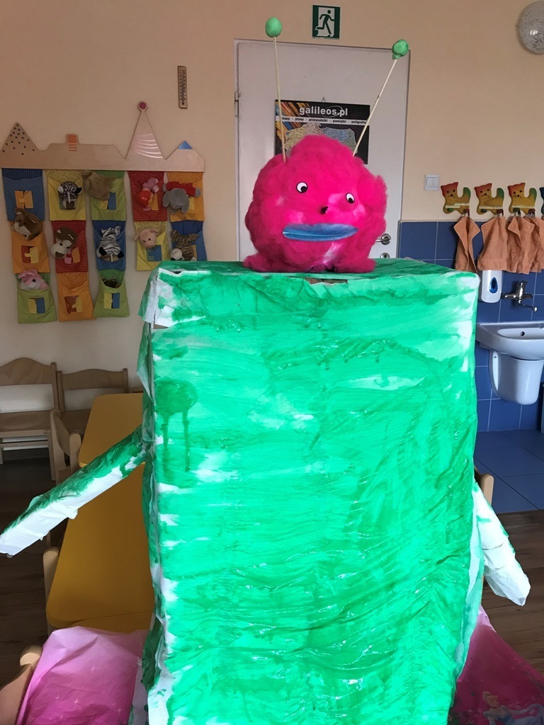 W ostatnim tygodniu grupa Smerfów dość często bujała w obłokach. To wszystko za sprawą tematyki zajęć, która dotyczyła nieba i kosmosu. Maluchy poznały między innymi takie pojęcia jak: kosmos, rakieta kosmiczna, UFO, czy ufoludek. Dzieci mogły rozwijać swoje umiejętności motoryczne w zakresie pracy ręki oraz sprawności całego układu ruchowego, aby na koniec wykonać wspólną pracę plastyczną. Pierwszy raz Smerfy mówiły: „to nasza praca” i każdy w jej wykonanie włożył tyle samo pracy i trudu. Przy okazji maluchy rozwijały umiejętności z zakres udzielania pierwszej pomocy przedmedycznej - owijając ręce naszego Ufoludka papierem imitującym bandaż. Tym razem również nie zawiodła dziecięca wyobraźnia: ciało z kartonu, styropianowa głowa, plastelinowe czułki, nos z drewnianych patyczków, a usta wykonane z niebieskiego piórka. Z tych właśnie materiałów Smerfy wykonały Ufoludka.