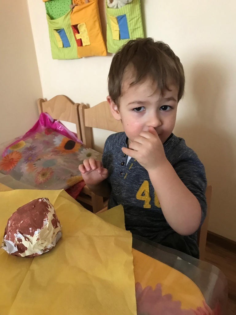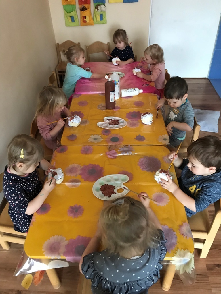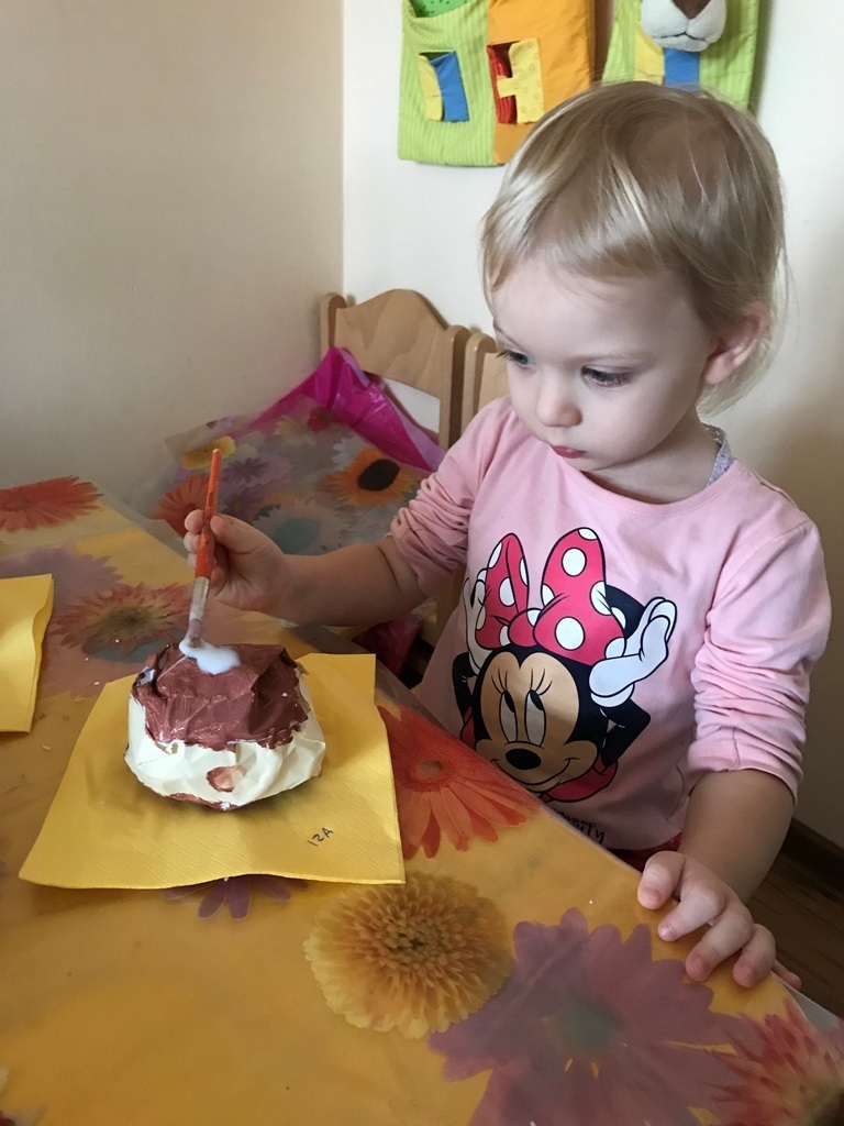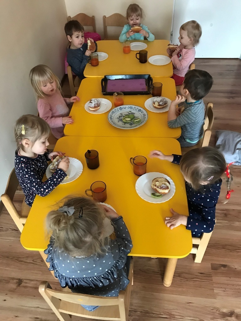 W naszej tradycji tłusty czwartek zajadamy się pączkami. Dlatego grupa Smerfów postanowiła samodzielnie wykonać swoje paczki. Praca była dwuetapowa. Najpierw maluszki musiały wykonać „masę” piankową, pognieść kartki. Następnie pomalować w odpowiednie kolory. Tu zakończymy I etat ponieważ farby musiały wyschnąć. Następnie trzeba było wykonać polewę z kleju i posypać cukrowymi wiórkami. W między czasie był czas II śniadania, na które oczywiście dzieci dostały pączki.