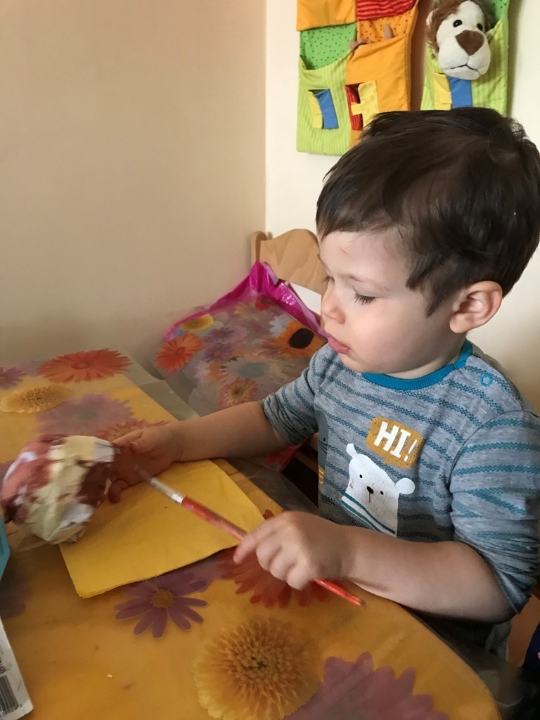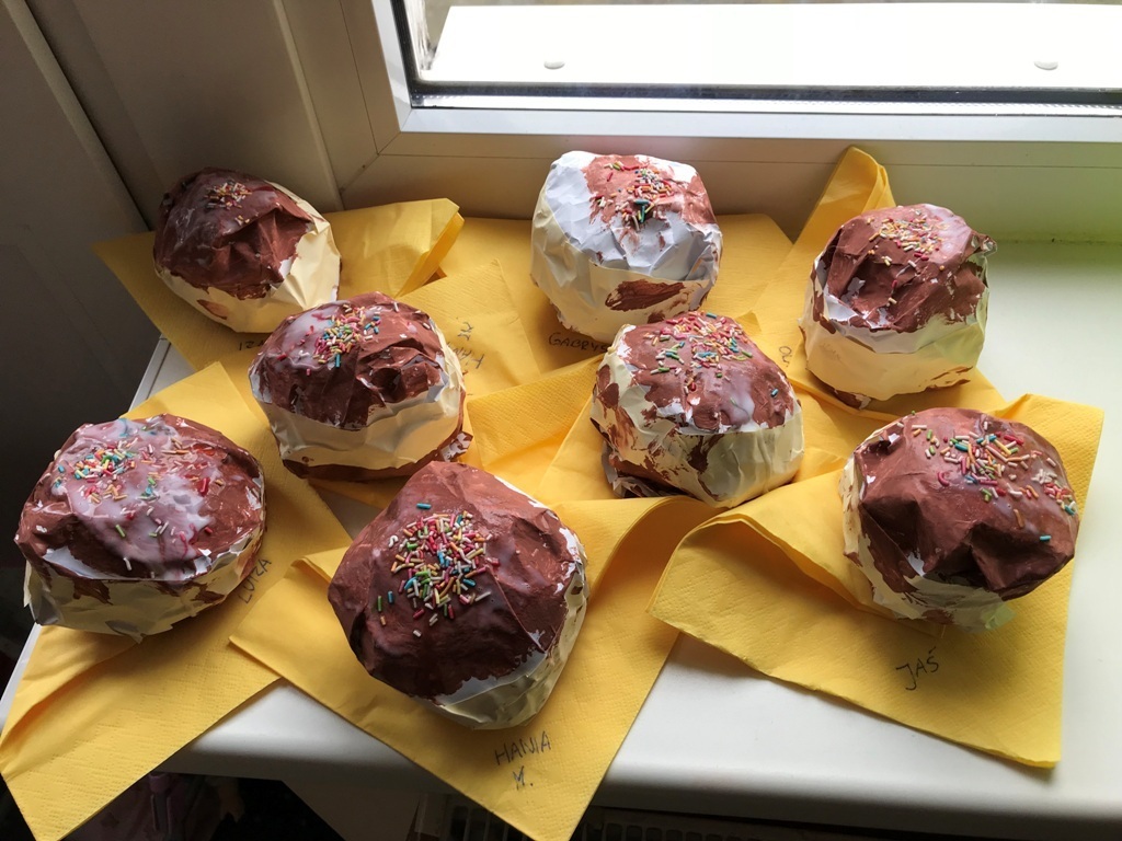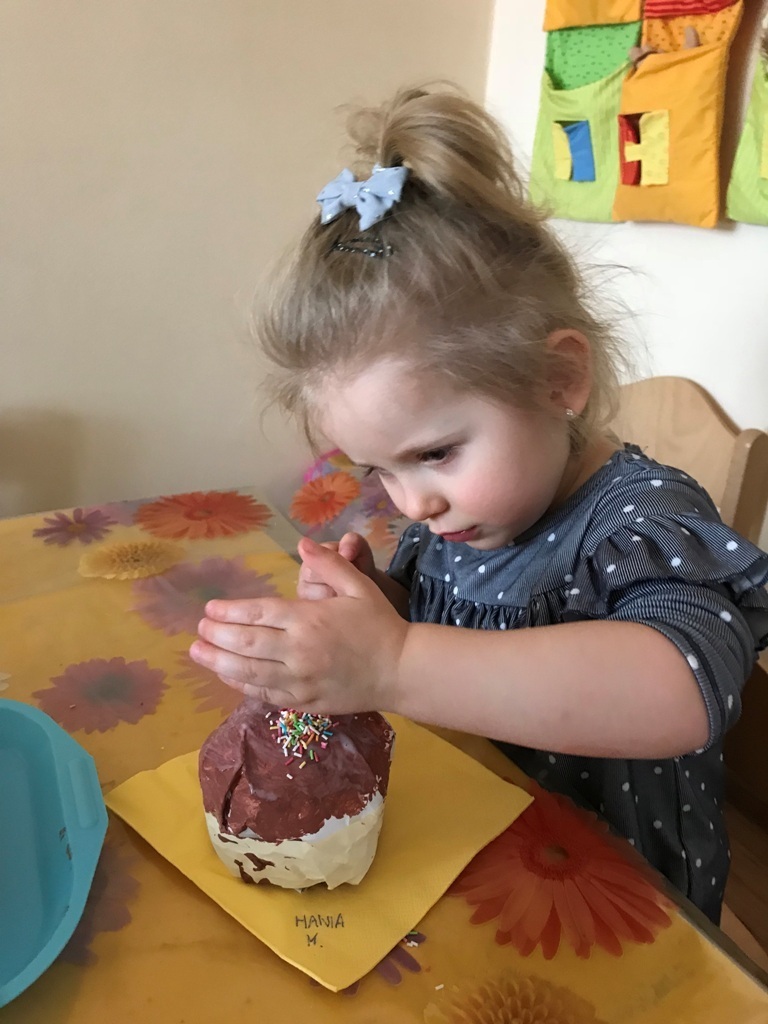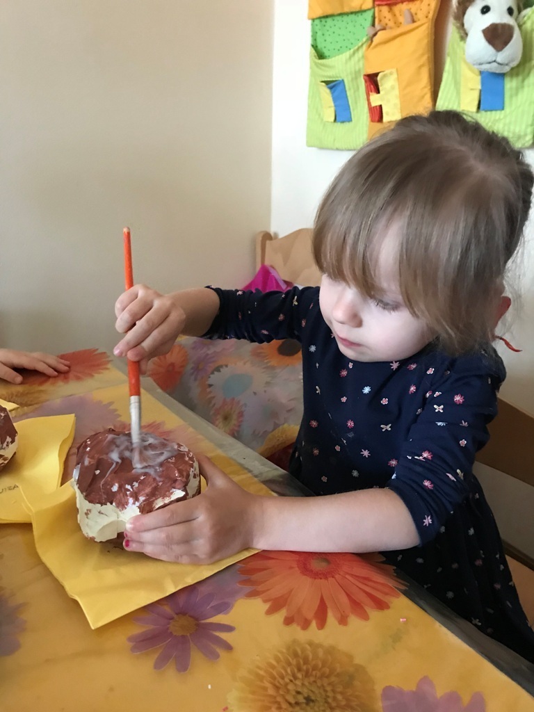 W naszej tradycji tłusty czwartek zajadamy się pączkami. Dlatego grupa Smerfów postanowiła samodzielnie wykonać swoje paczki. Praca była dwuetapowa. Najpierw maluszki musiały wykonać „masę” piankową, pognieść kartki. Następnie pomalować w odpowiednie kolory. Tu zakończymy I etat ponieważ farby musiały wyschnąć. Następnie trzeba było wykonać polewę z kleju i posypać cukrowymi wiórkami. W między czasie był czas II śniadania, na które oczywiście dzieci dostały pączki.
