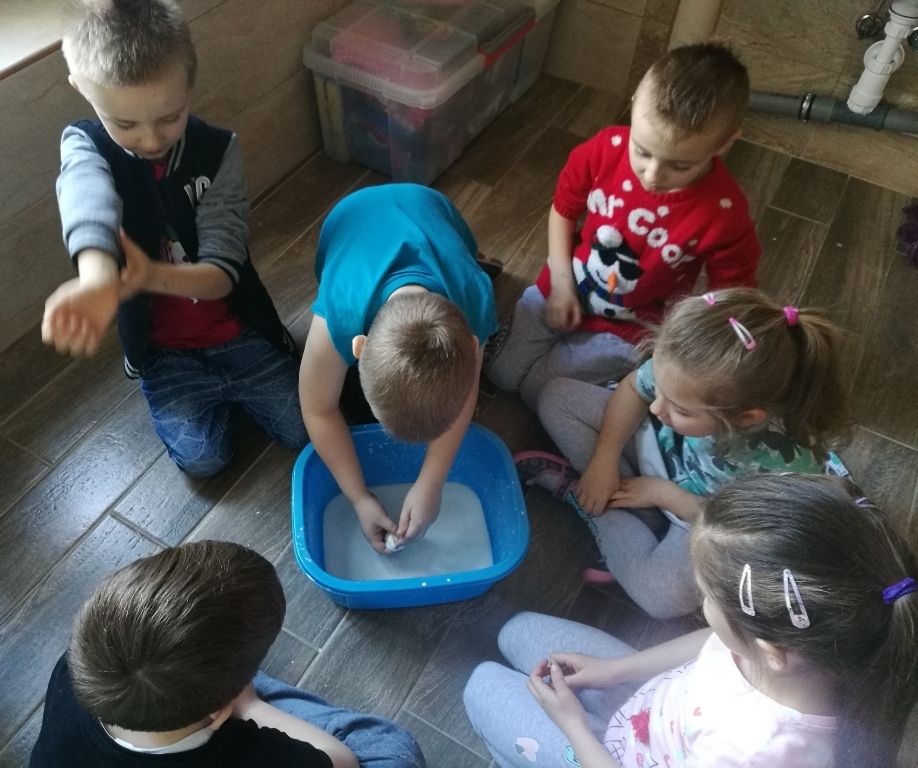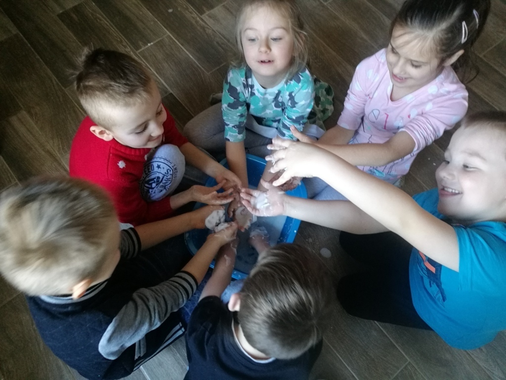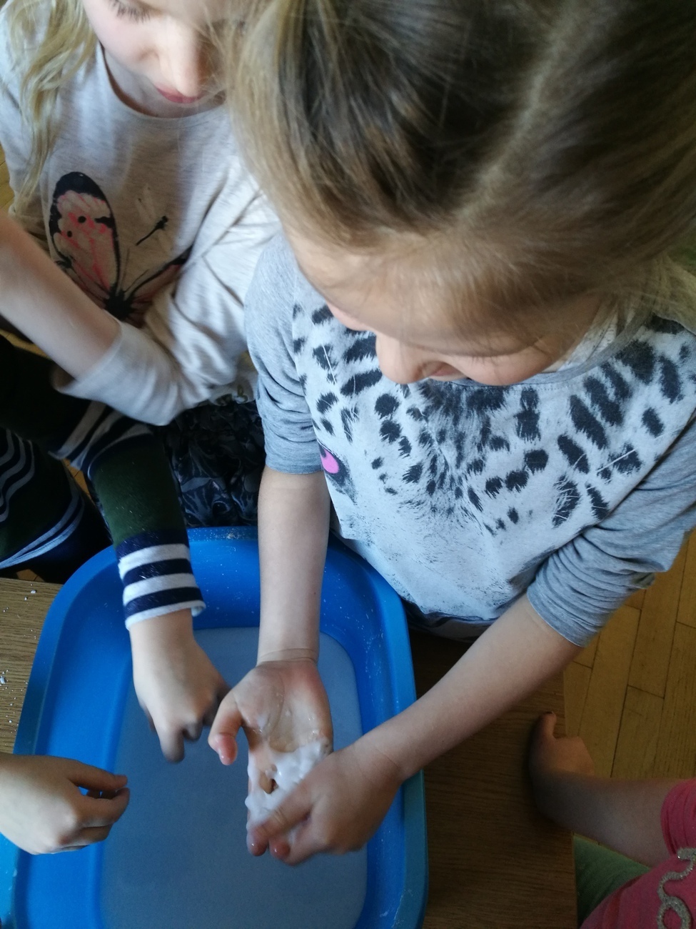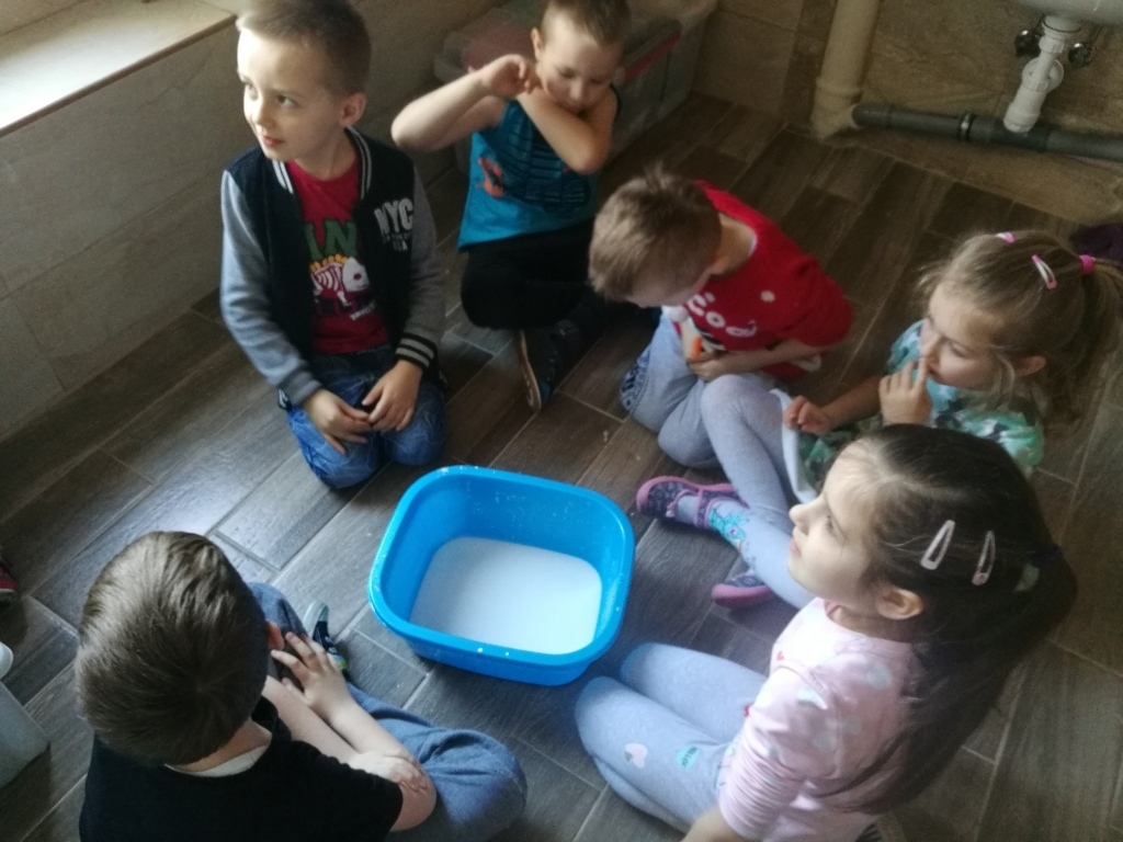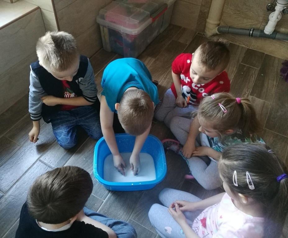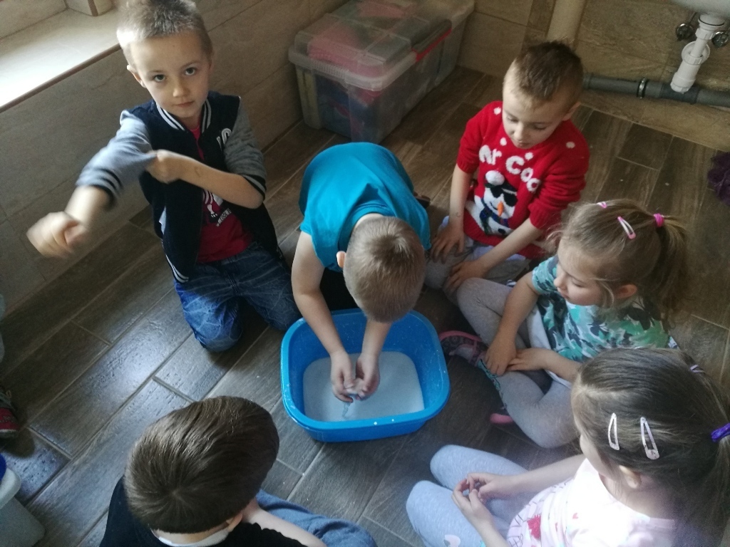 W ostatnim czasie starszaki zaczęły zadawać dużo pytań dotyczących wody. Aura za oknem pokrzyżowała nam plany, gdyż mieliśmy sprawdzić jak roztapia się śnieg i co z niego powstaje. Niestety śniegu prawie „jak na lekarstwo”, w ogóle nie ma. Wspólnie postanowiliśmy więc zbadać inne właściwości wody. Jako pierwszy eksperyment wykonaliśmy ciecz nienewtonowską, czyli płyn, który przeczy prawom fizyki. Po połączeniu wody z mąką ziemniaczana otrzymaliśmy płyn, który gdy nie działa na niego żadna siła pozostaje jak zwykła ciecz, ale gdy dostarczy mu się energii to zachowuje się jak ciało stałe. Starszaki były wręcz zahipnotyzowane i co chwila sprawdzały jak to jest, gdy z całej siły uderzę w wodę. Kolejny eksperyment polegał na obserwowaniu wody i świeczki. Do małego talerzyka nalaliśmy wody, następnie postawiliśmy na talerzu zapaloną świeczkę i przykryliśmy ją szklanką. Nie mogliśmy uwierzyć co stało się zaraz potem. Świeca zgasła a woda wsiąkła i jej poziom podniósł się w szklance. Kilkokrotnie obserwowaliśmy to zjawisko i za każdym razem robiło na nas wielkie wrażenie. Dzieje się tak dlatego, że świeca, żeby się palić nie potrzebuje całego powietrza, ale tylko tlenu i gdy tlen się skończy jego miejsce zajmuje woda, która wsiąka. Jest jeszcze tyle rzeczy do odkrycia, ciekawe co następnym razem będziemy badać.