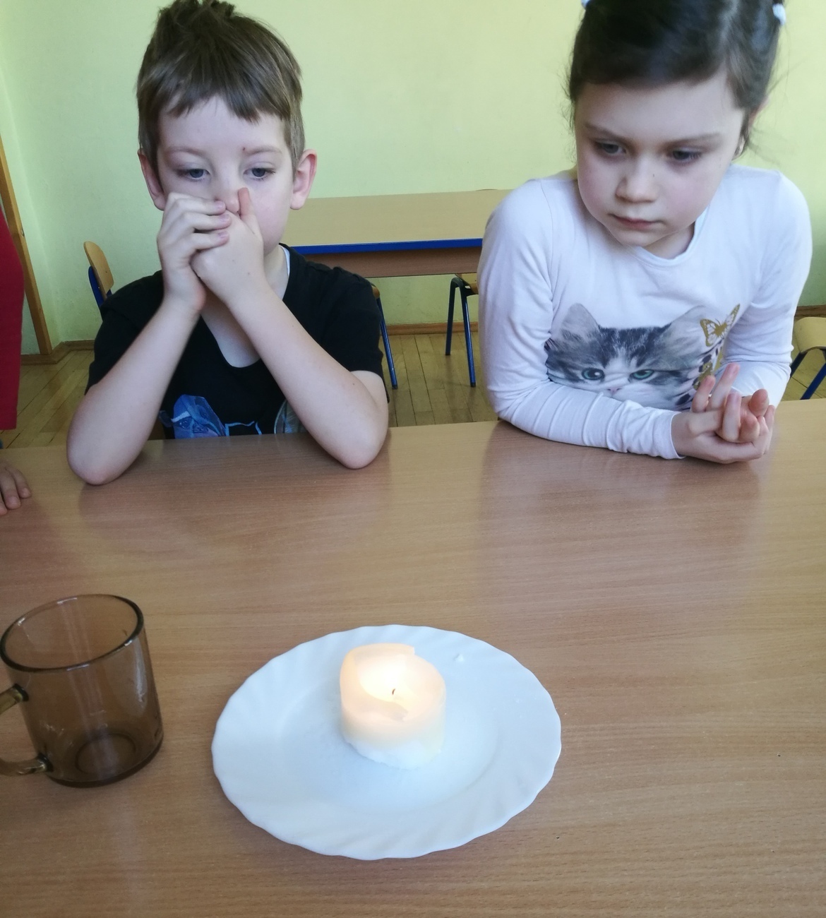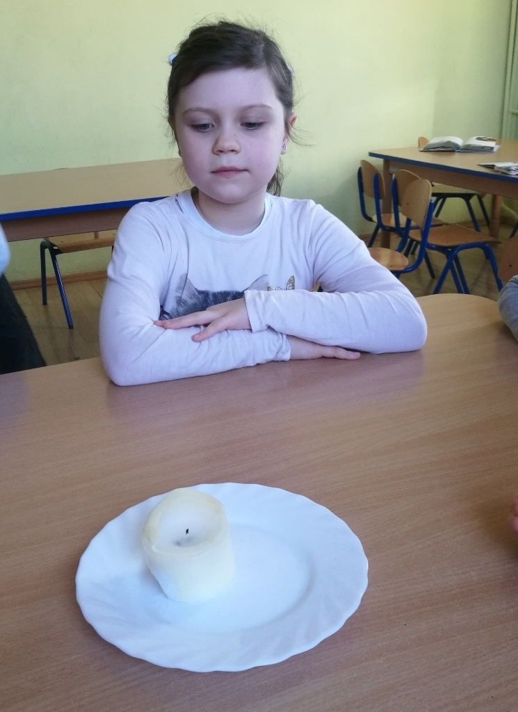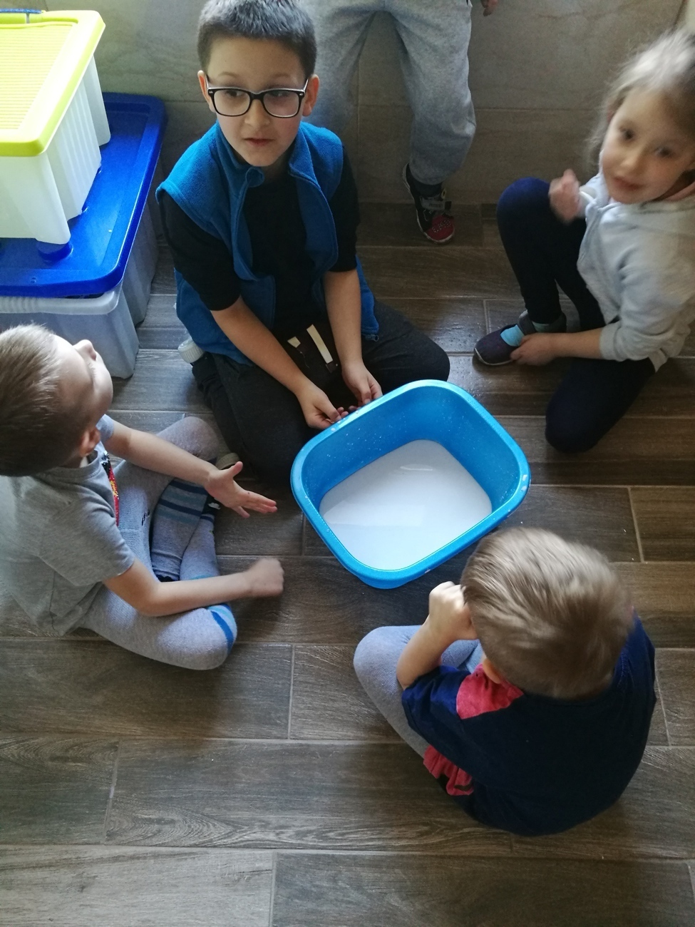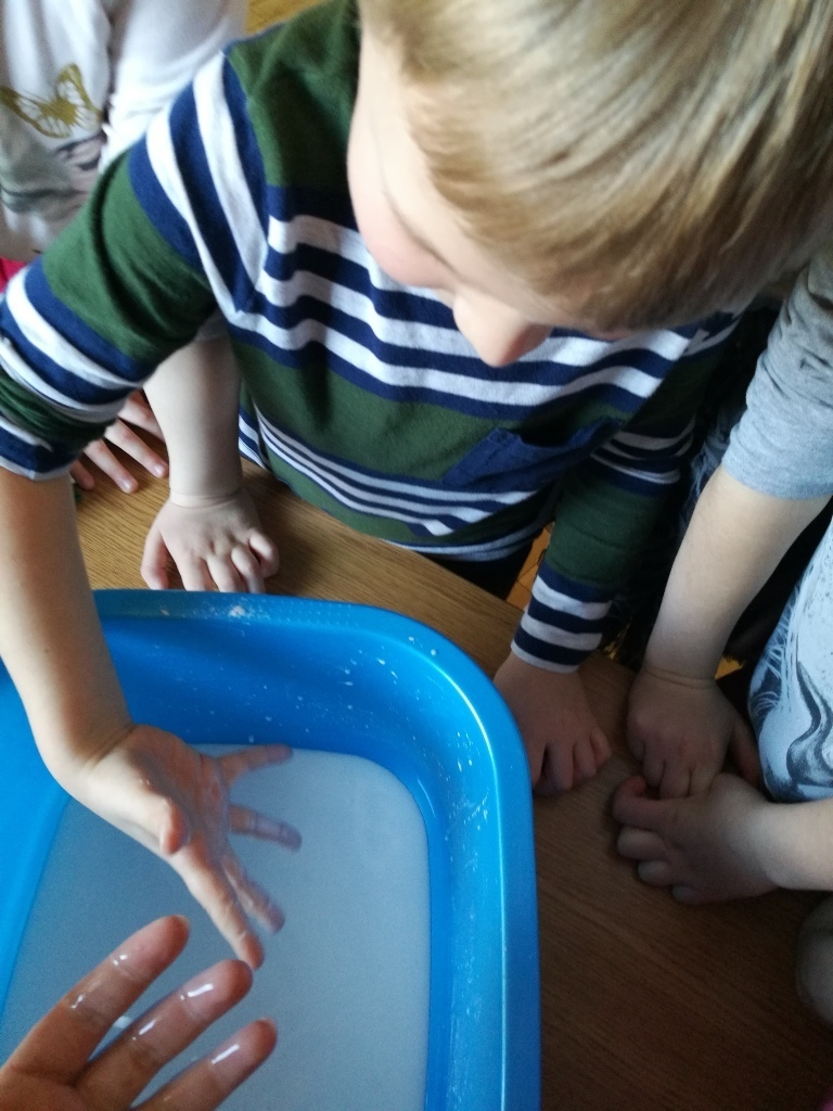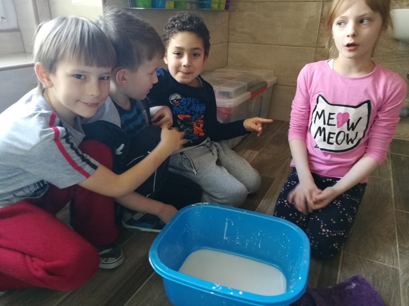 W ostatnim czasie starszaki zaczęły zadawać dużo pytań dotyczących wody. Aura za oknem pokrzyżowała nam plany, gdyż mieliśmy sprawdzić jak roztapia się śnieg i co z niego powstaje. Niestety śniegu prawie „jak na lekarstwo”, w ogóle nie ma. Wspólnie postanowiliśmy więc zbadać inne właściwości wody. Jako pierwszy eksperyment wykonaliśmy ciecz nienewtonowską, czyli płyn, który przeczy prawom fizyki. Po połączeniu wody z mąką ziemniaczana otrzymaliśmy płyn, który gdy nie działa na niego żadna siła pozostaje jak zwykła ciecz, ale gdy dostarczy mu się energii to zachowuje się jak ciało stałe. Starszaki były wręcz zahipnotyzowane i co chwila sprawdzały jak to jest, gdy z całej siły uderzę w wodę. Kolejny eksperyment polegał na obserwowaniu wody i świeczki. Do małego talerzyka nalaliśmy wody, następnie postawiliśmy na talerzu zapaloną świeczkę i przykryliśmy ją szklanką. Nie mogliśmy uwierzyć co stało się zaraz potem. Świeca zgasła a woda wsiąkła i jej poziom podniósł się w szklance. Kilkokrotnie obserwowaliśmy to zjawisko i za każdym razem robiło na nas wielkie wrażenie. Dzieje się tak dlatego, że świeca, żeby się palić nie potrzebuje całego powietrza, ale tylko tlenu i gdy tlen się skończy jego miejsce zajmuje woda, która wsiąka. Jest jeszcze tyle rzeczy do odkrycia, ciekawe co następnym razem będziemy badać.