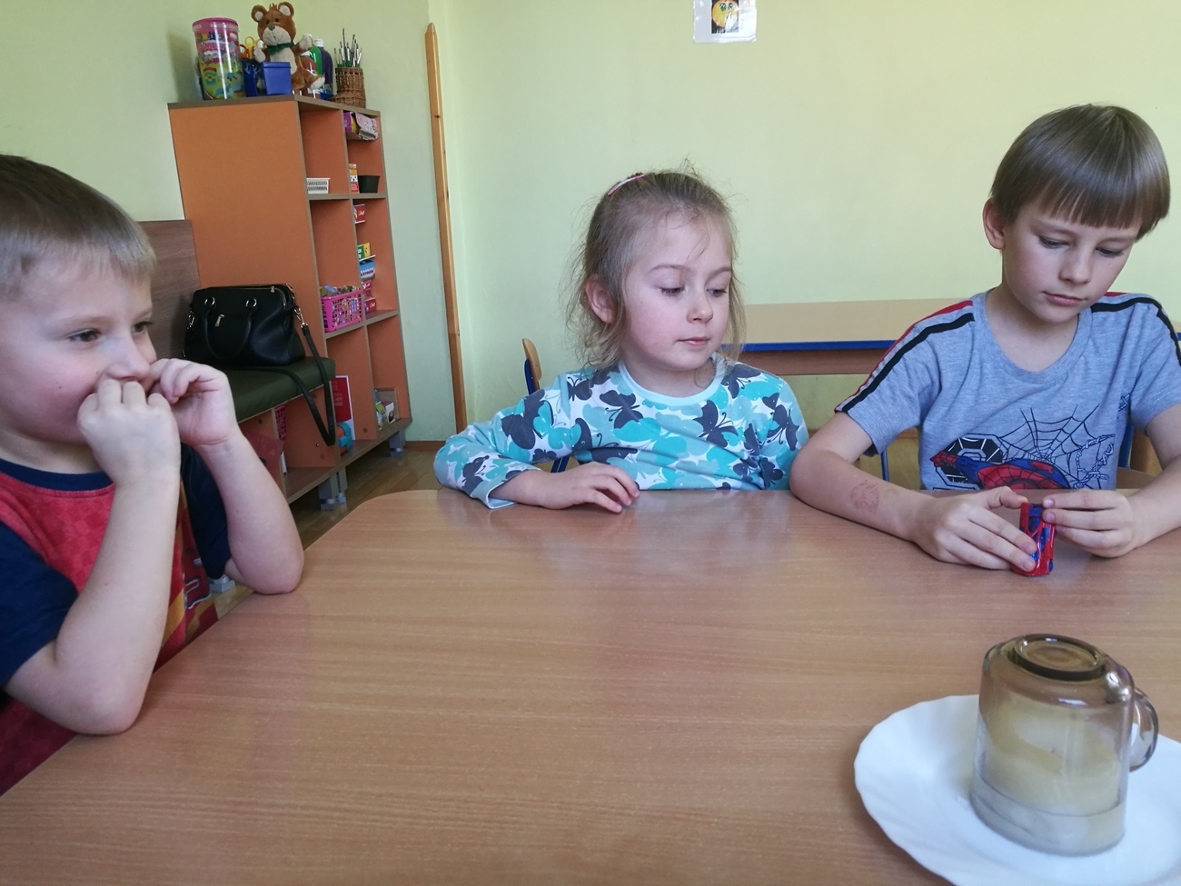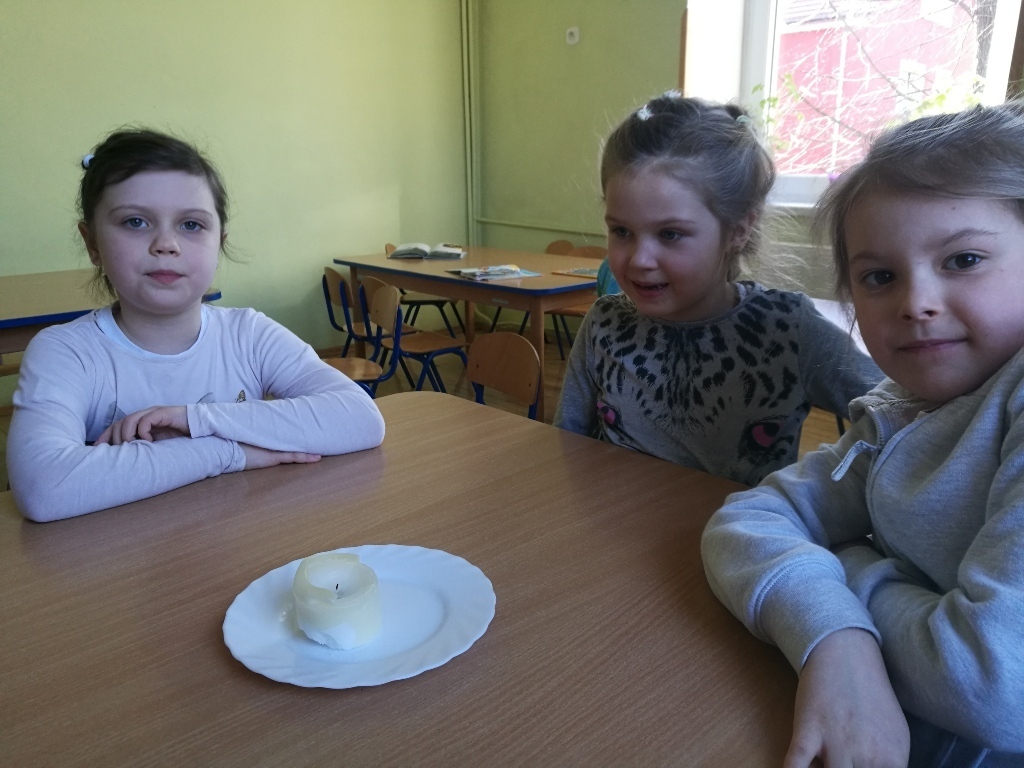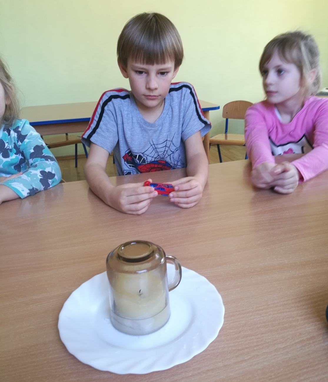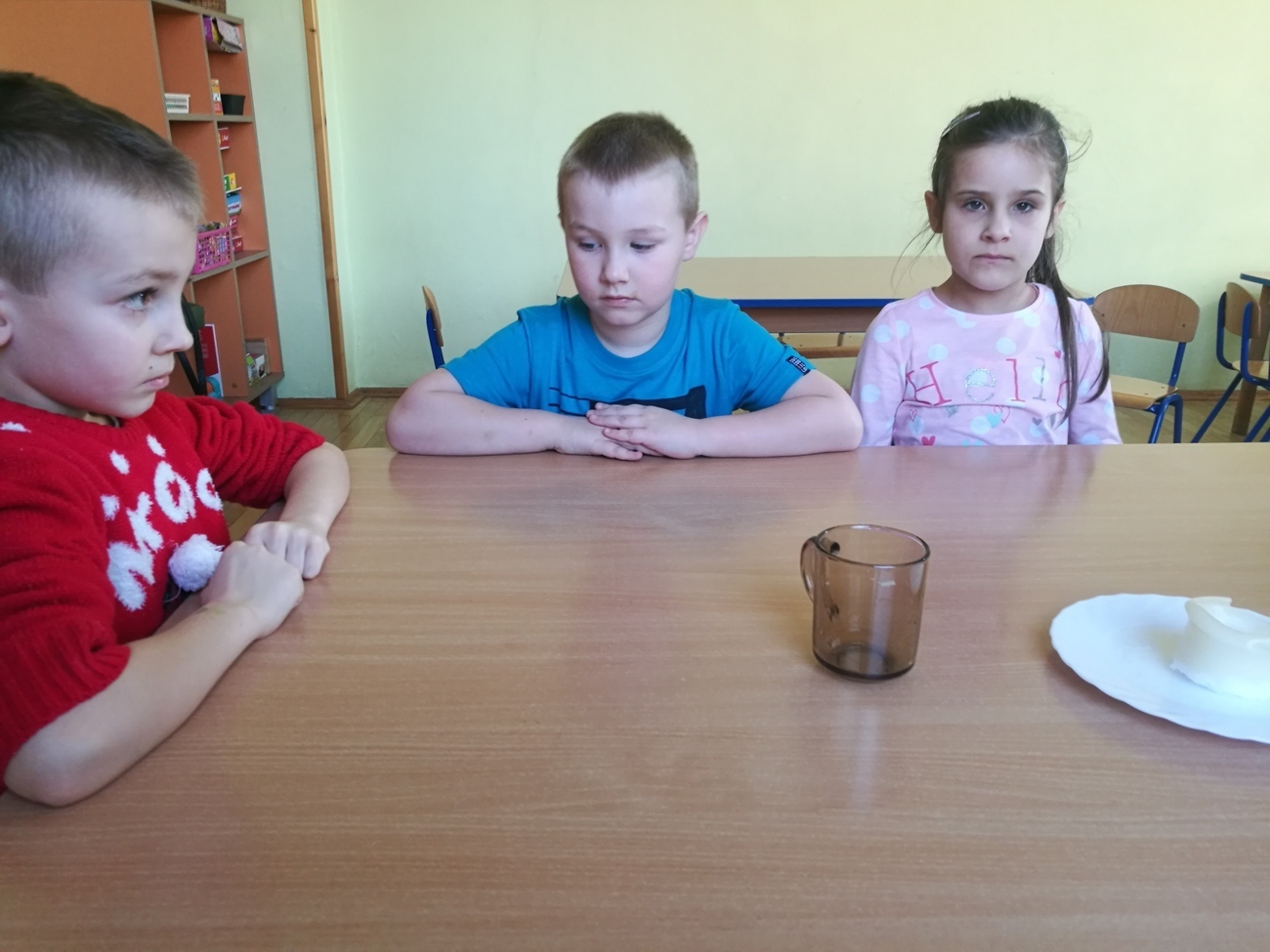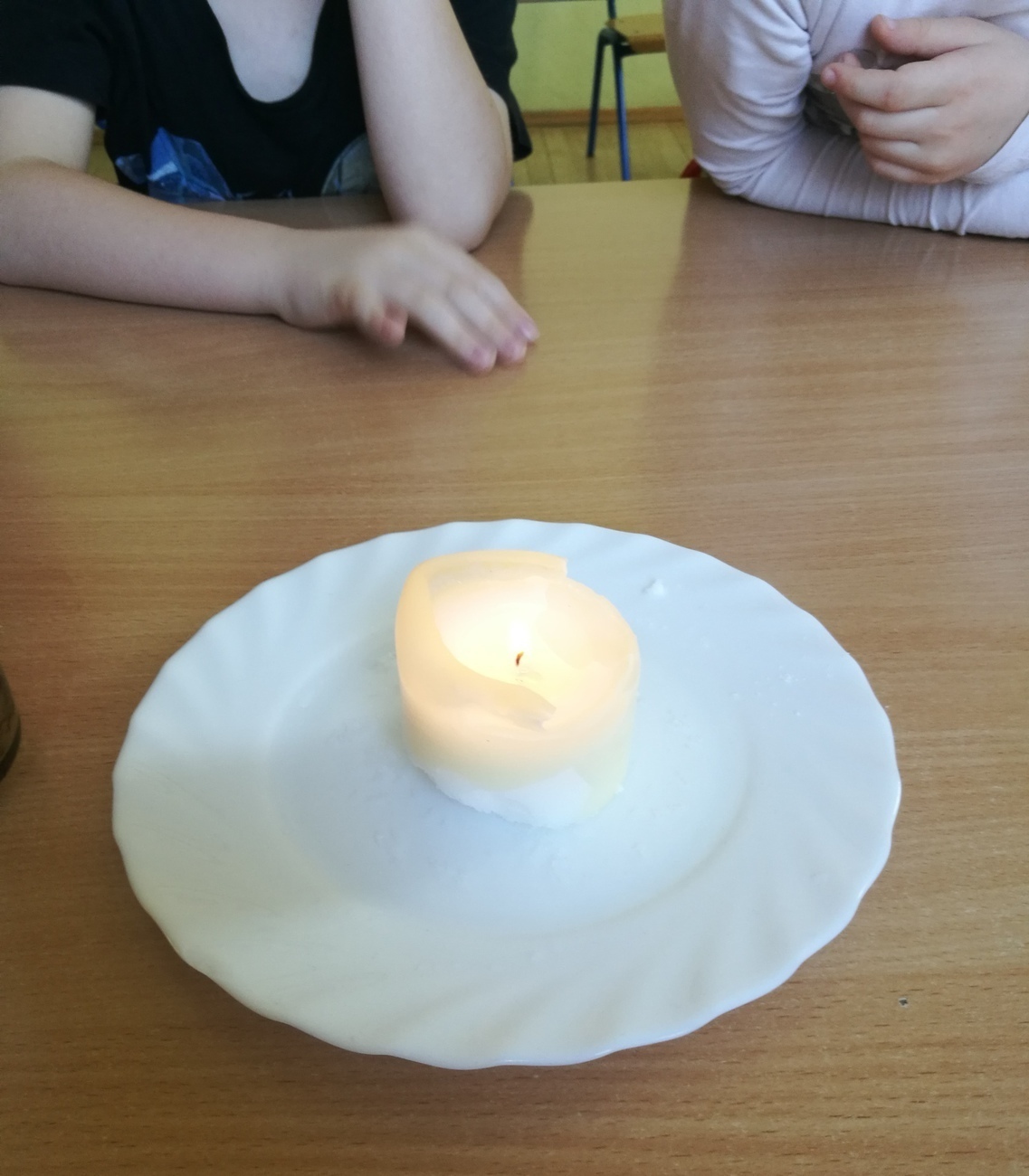 W ostatnim czasie starszaki zaczęły zadawać dużo pytań dotyczących wody. Aura za oknem pokrzyżowała nam plany, gdyż mieliśmy sprawdzić jak roztapia się śnieg i co z niego powstaje. Niestety śniegu prawie „jak na lekarstwo”, w ogóle nie ma. Wspólnie postanowiliśmy więc zbadać inne właściwości wody. Jako pierwszy eksperyment wykonaliśmy ciecz nienewtonowską, czyli płyn, który przeczy prawom fizyki. Po połączeniu wody z mąką ziemniaczana otrzymaliśmy płyn, który gdy nie działa na niego żadna siła pozostaje jak zwykła ciecz, ale gdy dostarczy mu się energii to zachowuje się jak ciało stałe. Starszaki były wręcz zahipnotyzowane i co chwila sprawdzały jak to jest, gdy z całej siły uderzę w wodę. Kolejny eksperyment polegał na obserwowaniu wody i świeczki. Do małego talerzyka nalaliśmy wody, następnie postawiliśmy na talerzu zapaloną świeczkę i przykryliśmy ją szklanką. Nie mogliśmy uwierzyć co stało się zaraz potem. Świeca zgasła a woda wsiąkła i jej poziom podniósł się w szklance. Kilkokrotnie obserwowaliśmy to zjawisko i za każdym razem robiło na nas wielkie wrażenie. Dzieje się tak dlatego, że świeca, żeby się palić nie potrzebuje całego powietrza, ale tylko tlenu i gdy tlen się skończy jego miejsce zajmuje woda, która wsiąka. Jest jeszcze tyle rzeczy do odkrycia, ciekawe co następnym razem będziemy badać.