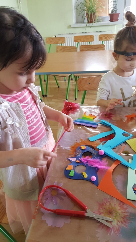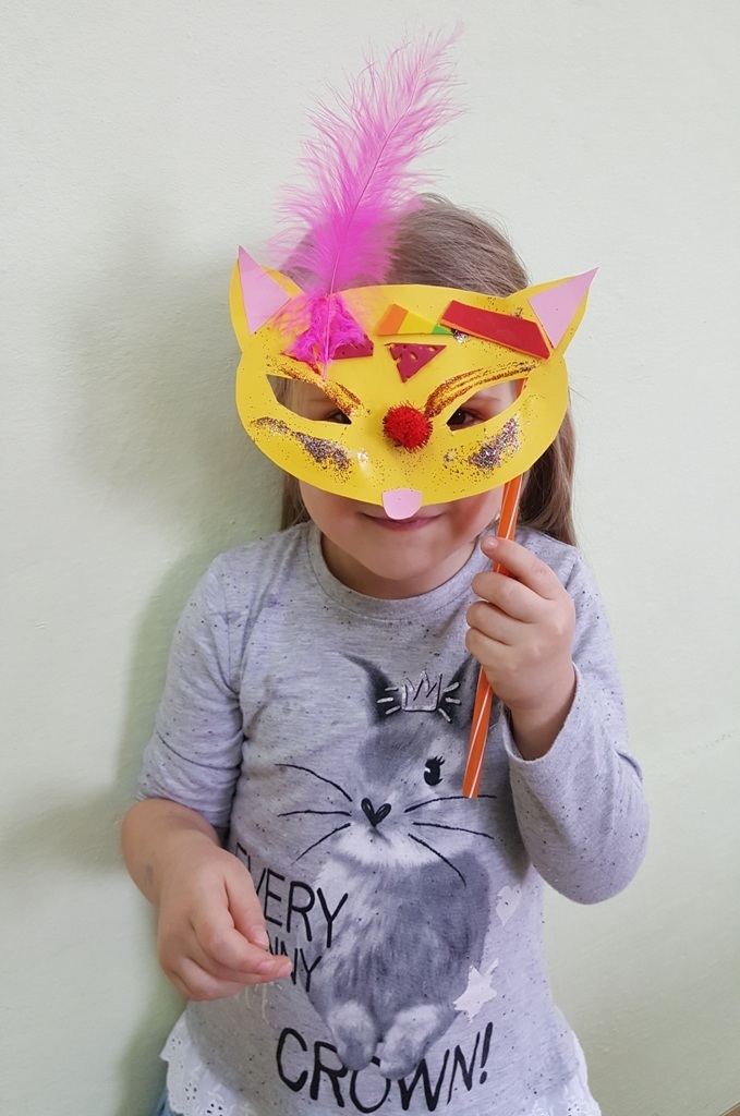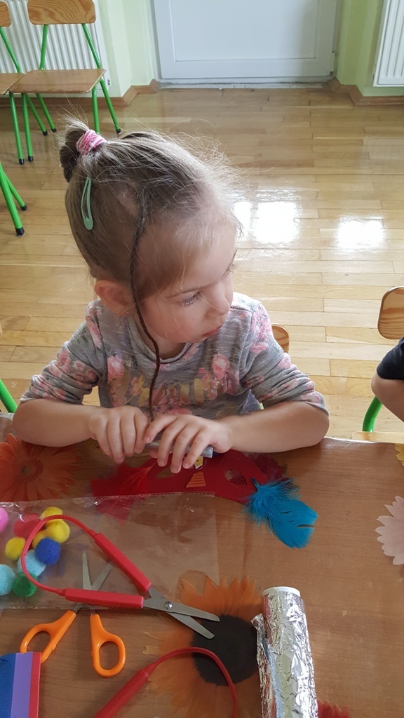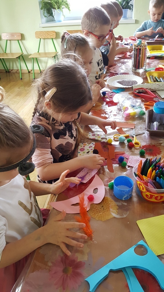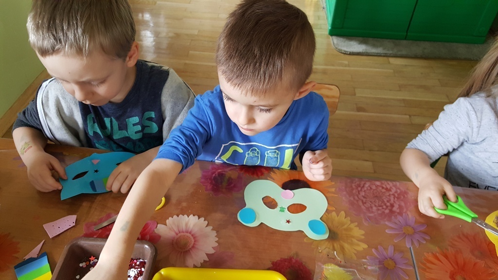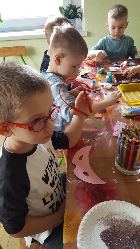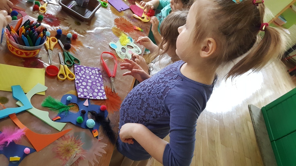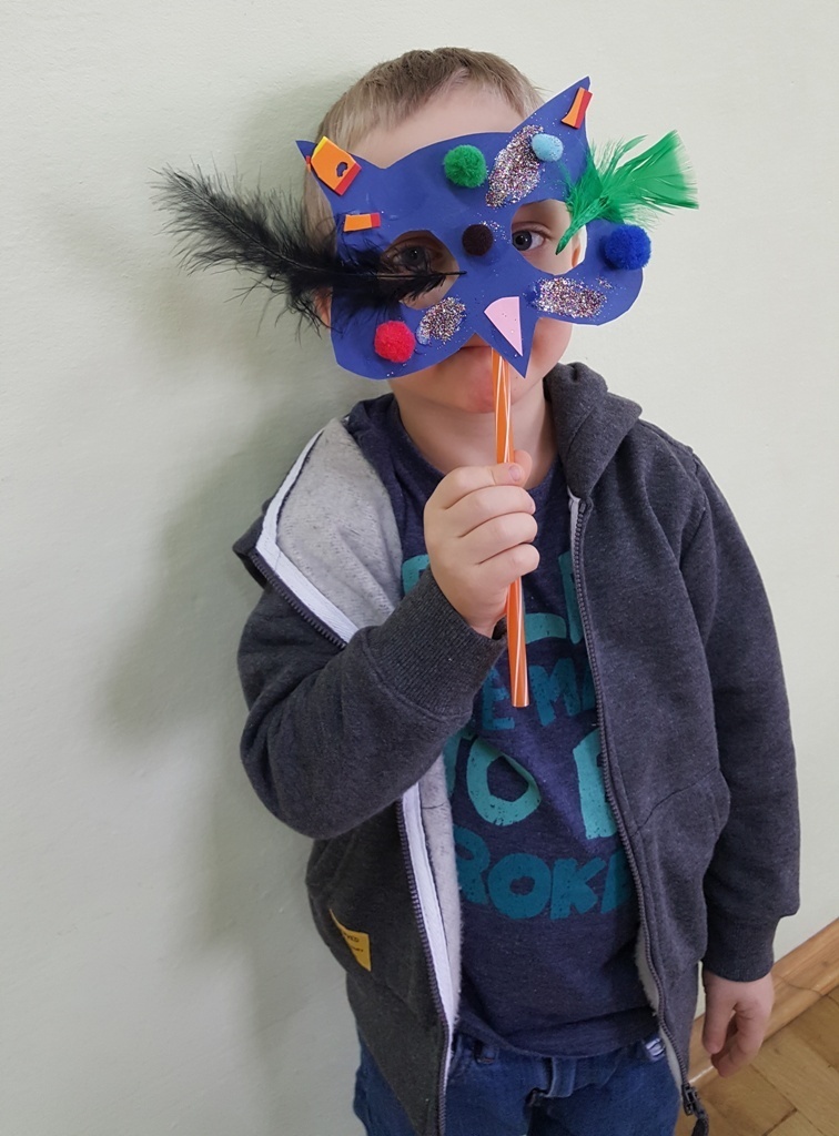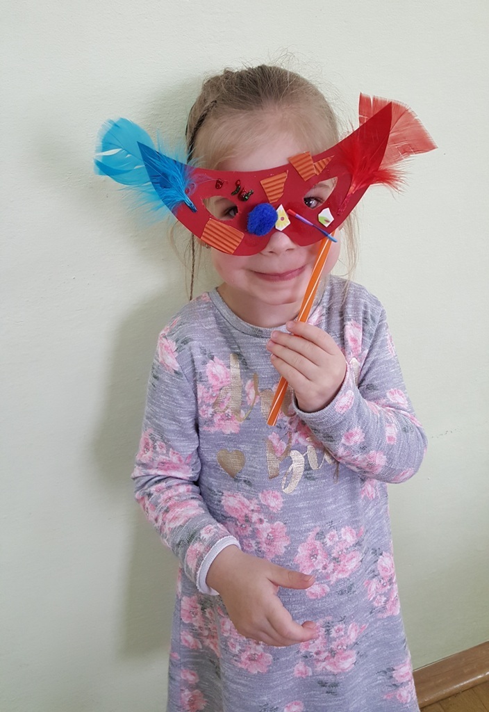 Z wykorzystaniem dostępnych w przedszkolu materiałów plastycznych dzięki pomocy naszej Pani wykonaliśmy niezwykle i fantazyjne maski. Nie były to maski zwykłe, codzienne lecz karnawałowe - upstrzone błyszczącym rekinami, piórami, brokatem i przycięte w fantazyjne wzory.