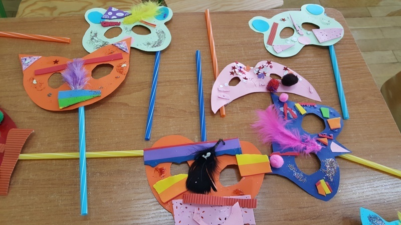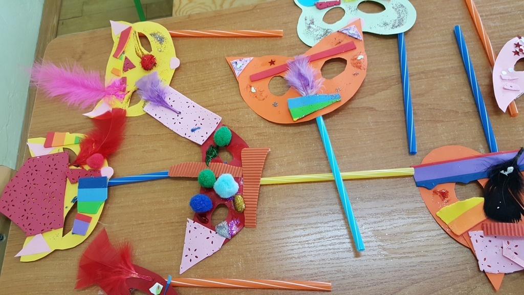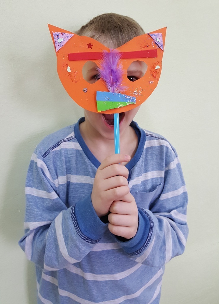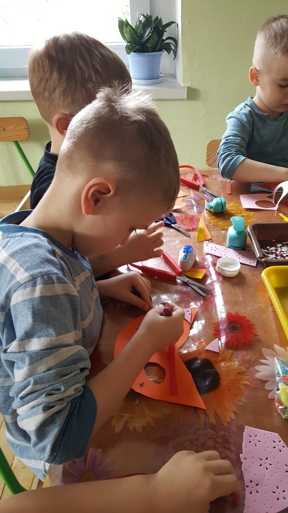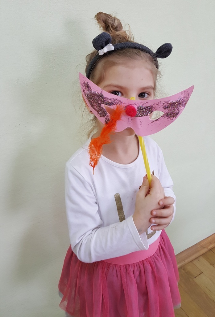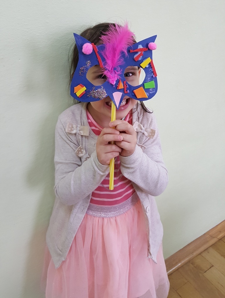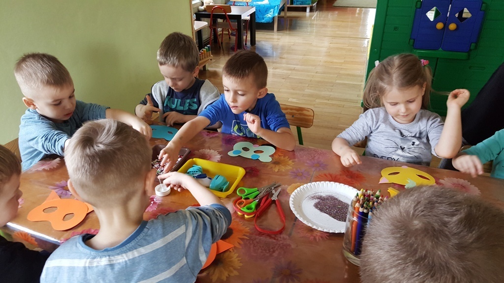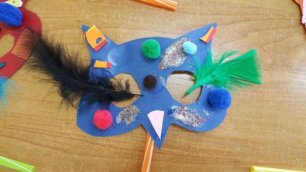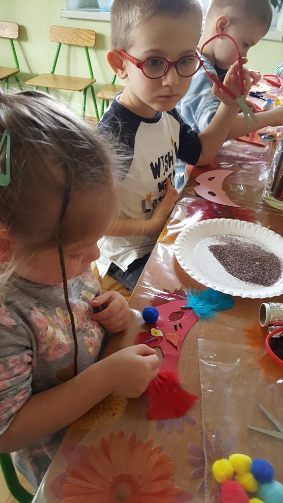 Z wykorzystaniem dostępnych w przedszkolu materiałów plastycznych dzięki pomocy naszej Pani wykonaliśmy niezwykle i fantazyjne maski. Nie były to maski zwykłe, codzienne lecz karnawałowe - upstrzone błyszczącym rekinami, piórami, brokatem i przycięte w fantazyjne wzory.