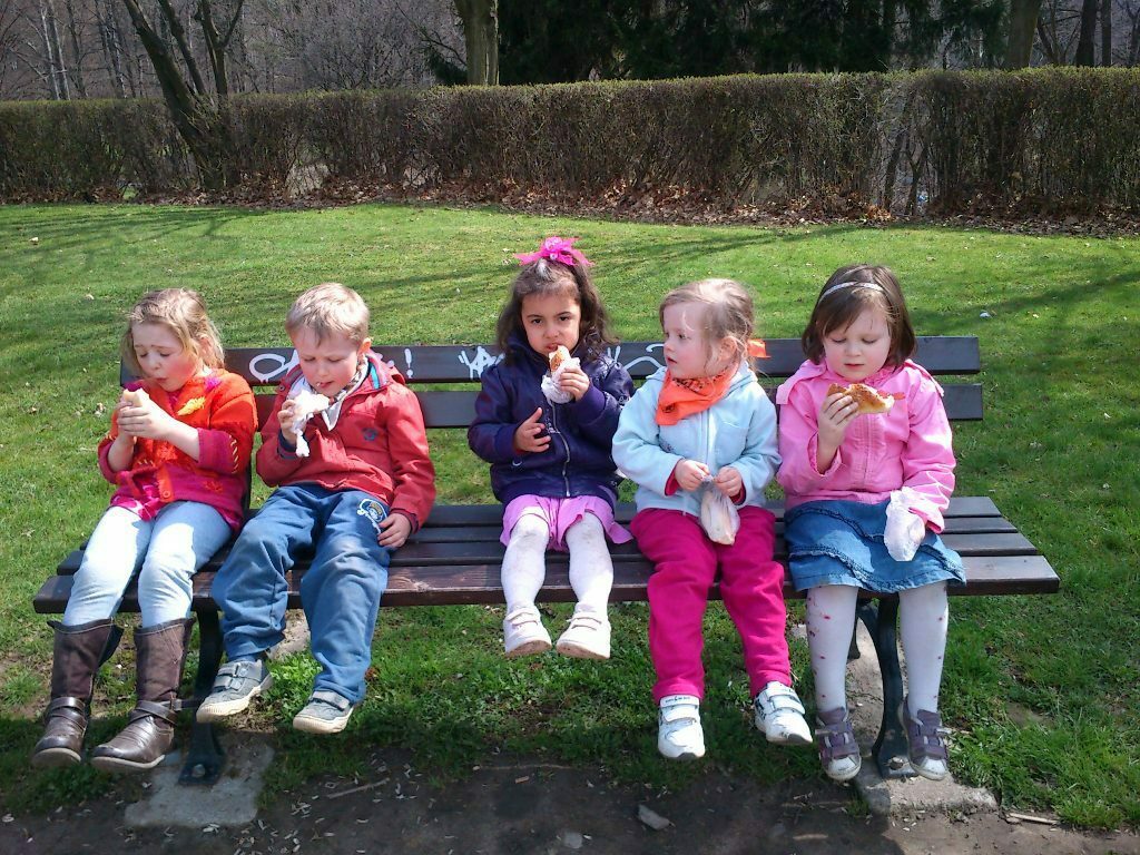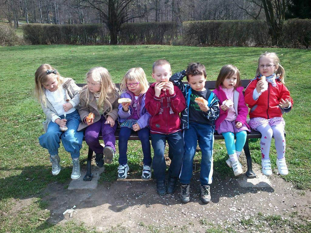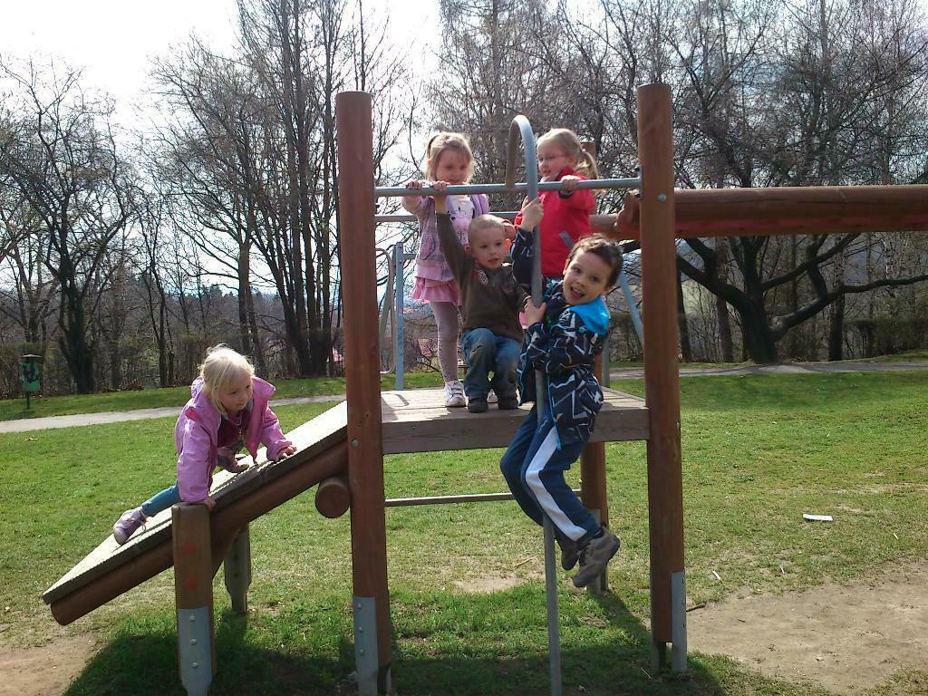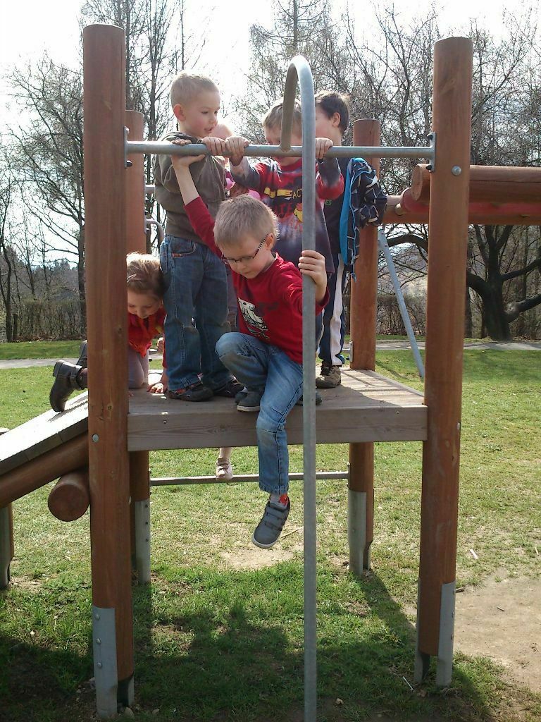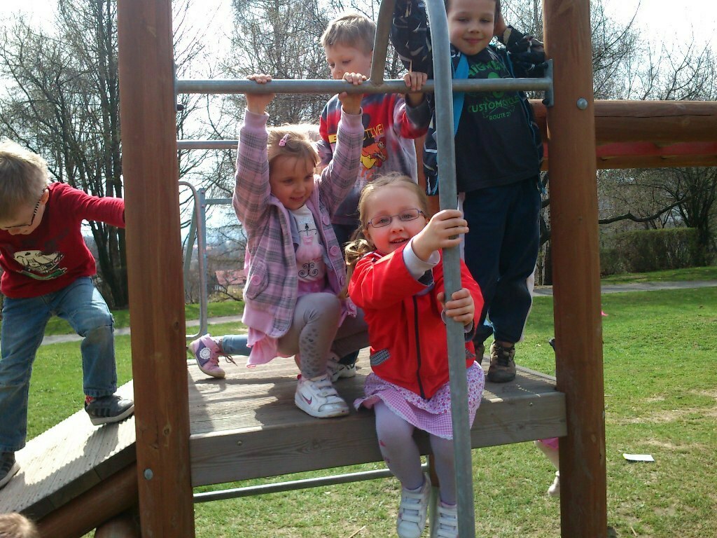 Zaraz po zajęciach zabraliśmy ze sobą drugie śniadanie i poszliśmy na plac zabaw mieszczący się na Wzgórzu Kościuszki. Zabawa jak zawsze udana, mnóstwo urządzeń - ślizgawki, karuzela, huśtawk - to wszystko było tylko i wyłącznie dla nas, ponieważ na placu nie było żywego ducha. Ale długo na młodszych towarzyszy zabaw nie musieliśmy czekać, poznaliśmy małą Hanię i o dwa lata od nas młodszego Pawełka. Wspinaliśmy się wszędzie! Nie wiedzieliśmy, że czas tak szybko ucieka i musieliśmy wracać do przedszkola na obiad. Mamy tylko nadzieję, że niedługo tam wrócimy.