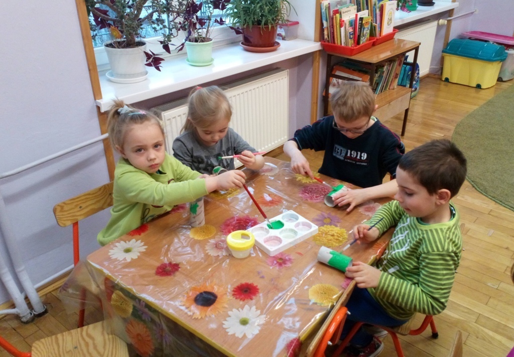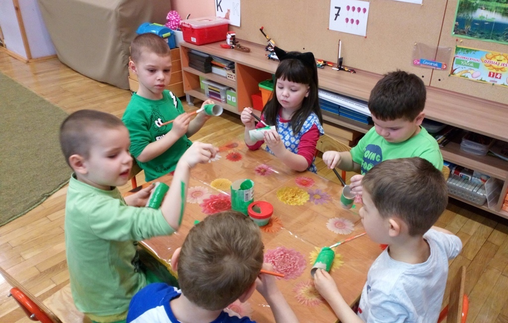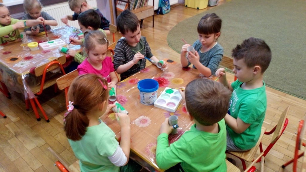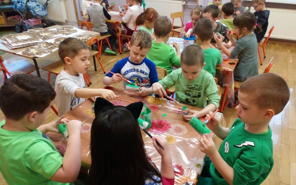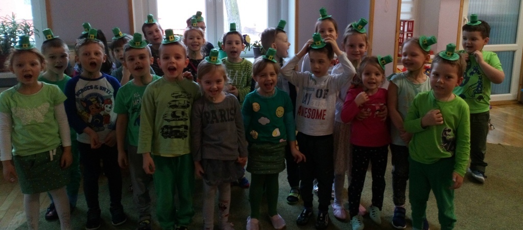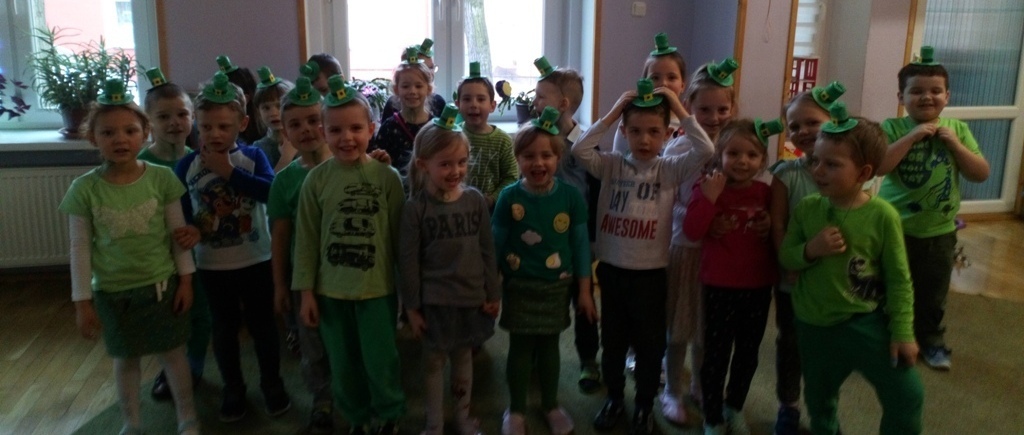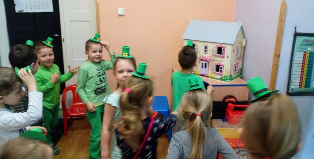 Dziś w naszej grupie obchodziliśmy F-Dzień Św. Patryka, dlatego przyszliśmy wszyscy ubrani na zielono. Pani powiedziała nam, że w naszej sali był leprechaun i zostawił w niej jakiś skarb. Jednak nie mogliśmy go znaleźć. Potrzebne nam były specjalne kapelusze - oczywiście w kolorze zielonym. Kiedy je ubraliśmy znalezienie skarbu poszło nam bardzo szybko.