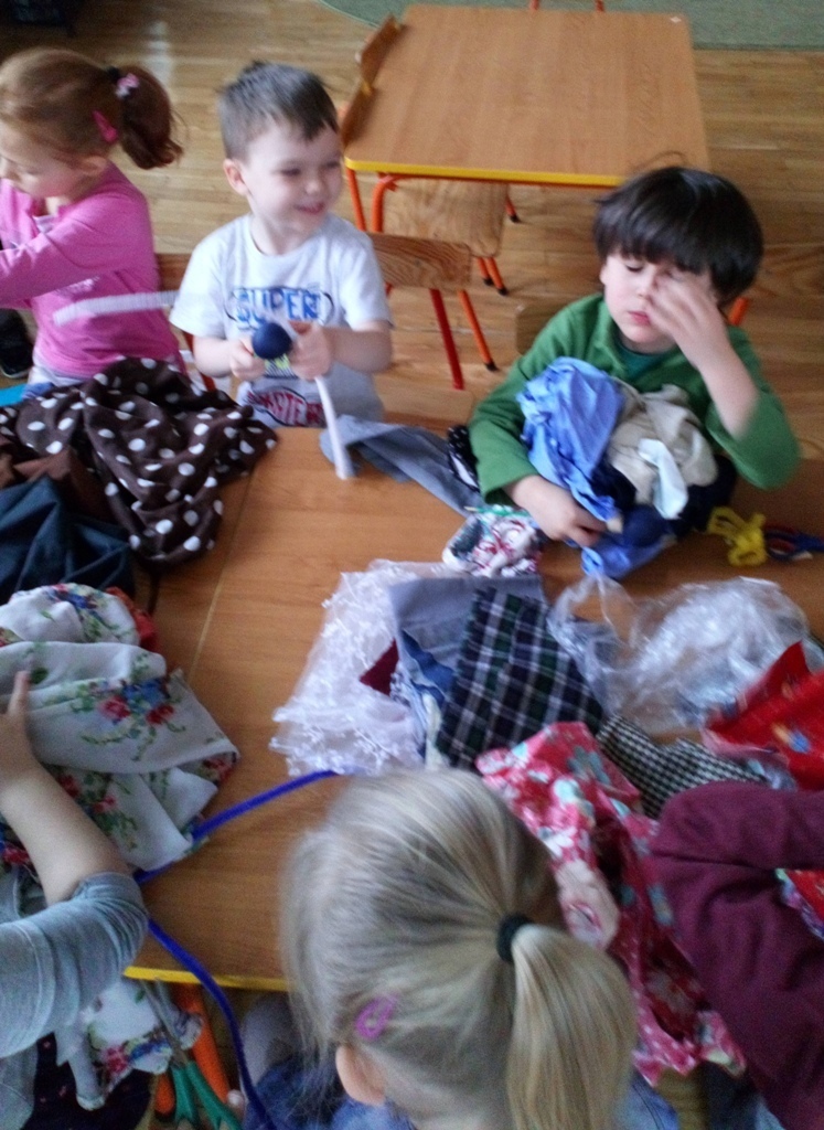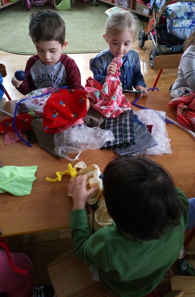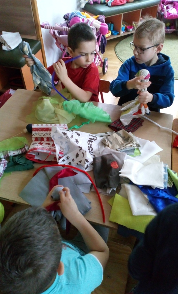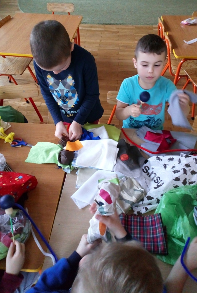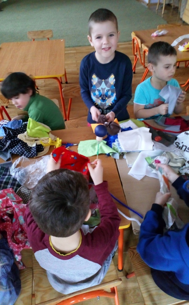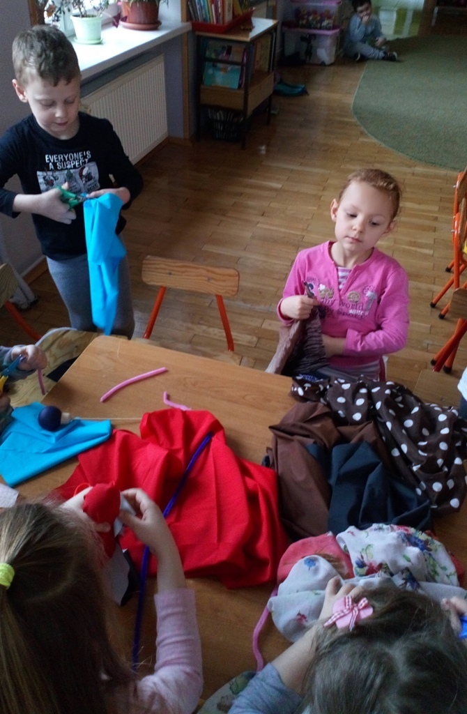 Podczas dzisiejszych zajęć robótkowa wykonaliśmy kukiełki do naszego grupowego teatrzyku. Pracowaliśmy wszyscy razem przy jednym stole. Każdy z nas przyniósł z domu różne kawałki kolorowych materiałów. Praca poszła nam bardzo szybko i kiedy nasze kukiełki były gotowe mogliśmy rozpocząć nasze grupowe teatrzykowanie.
