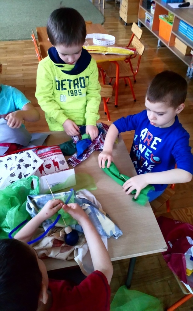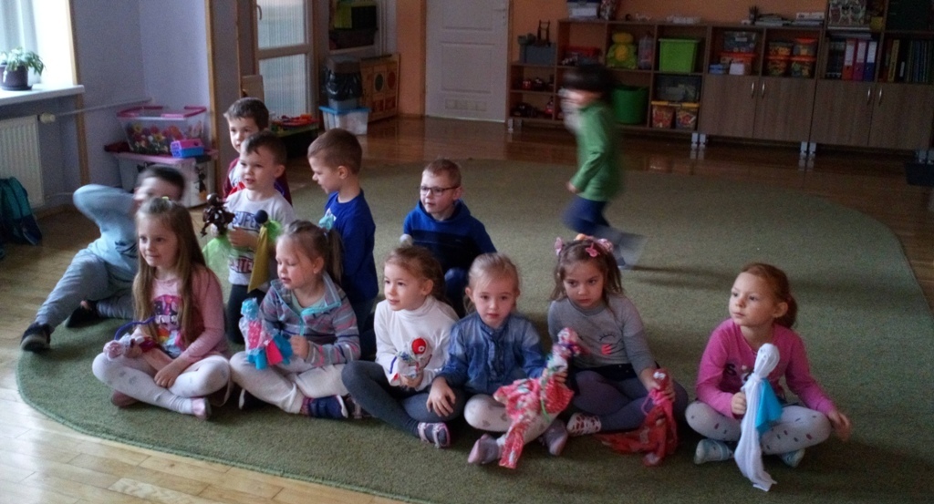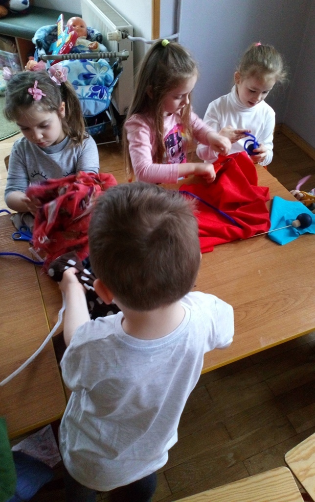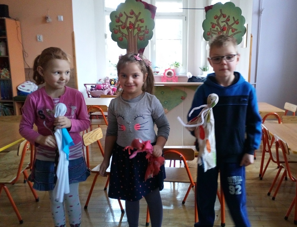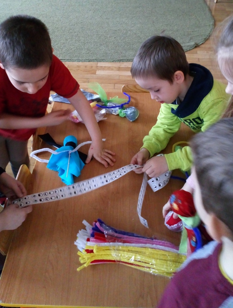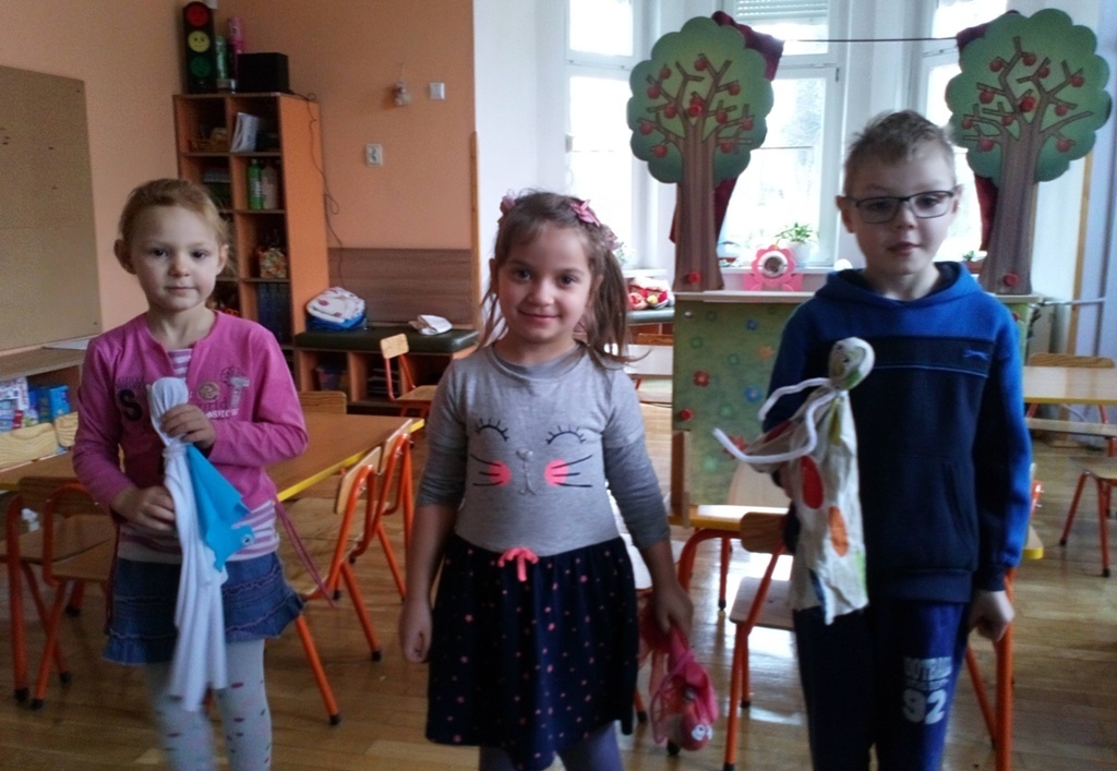 Podczas dzisiejszych zajęć robótkowa wykonaliśmy kukiełki do naszego grupowego teatrzyku. Pracowaliśmy wszyscy razem przy jednym stole. Każdy z nas przyniósł z domu różne kawałki kolorowych materiałów. Praca poszła nam bardzo szybko i kiedy nasze kukiełki były gotowe mogliśmy rozpocząć nasze grupowe teatrzykowanie.