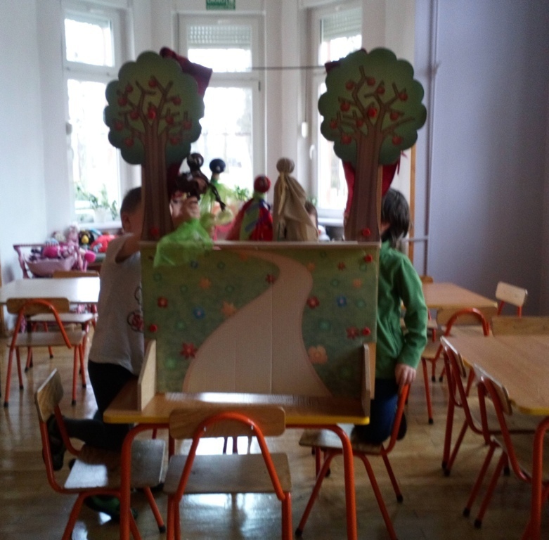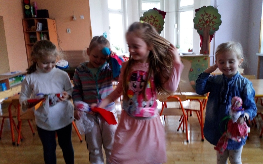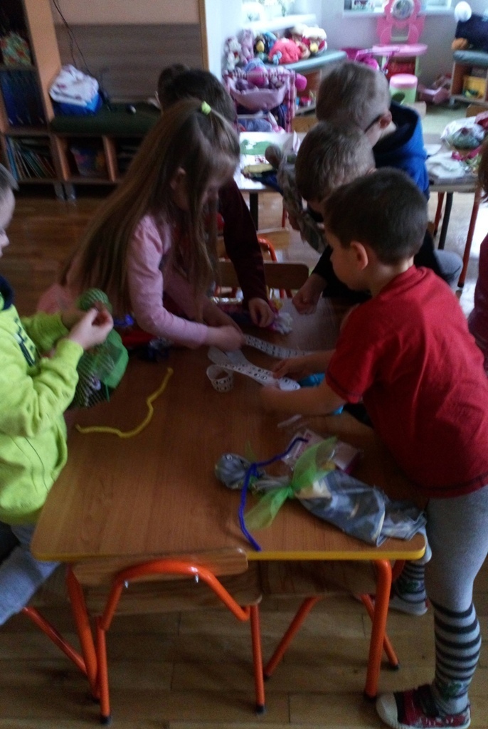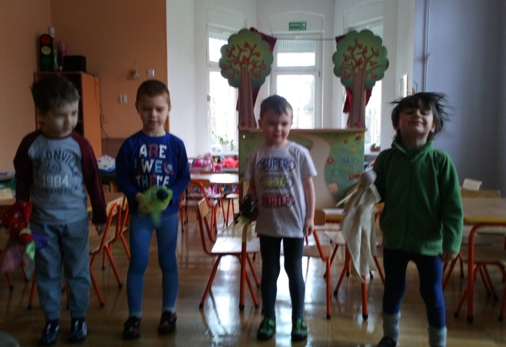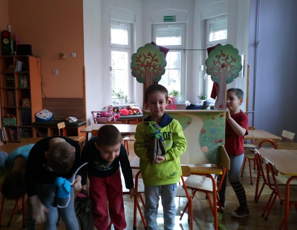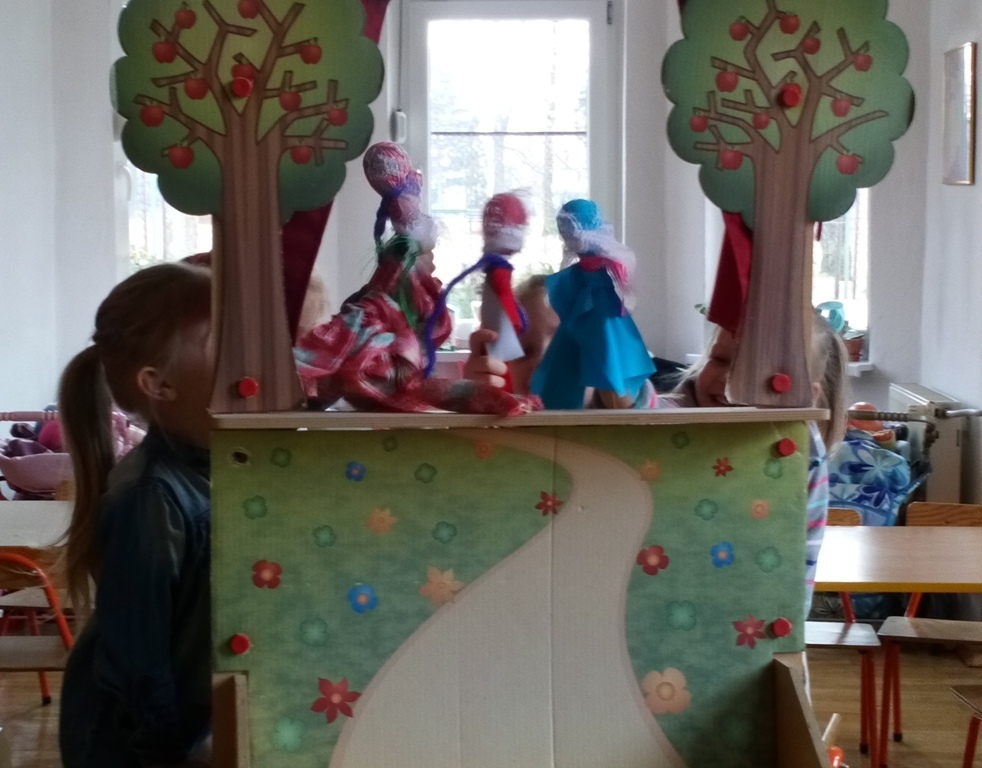 Podczas dzisiejszych zajęć robótkowa wykonaliśmy kukiełki do naszego grupowego teatrzyku. Pracowaliśmy wszyscy razem przy jednym stole. Każdy z nas przyniósł z domu różne kawałki kolorowych materiałów. Praca poszła nam bardzo szybko i kiedy nasze kukiełki były gotowe mogliśmy rozpocząć nasze grupowe teatrzykowanie.