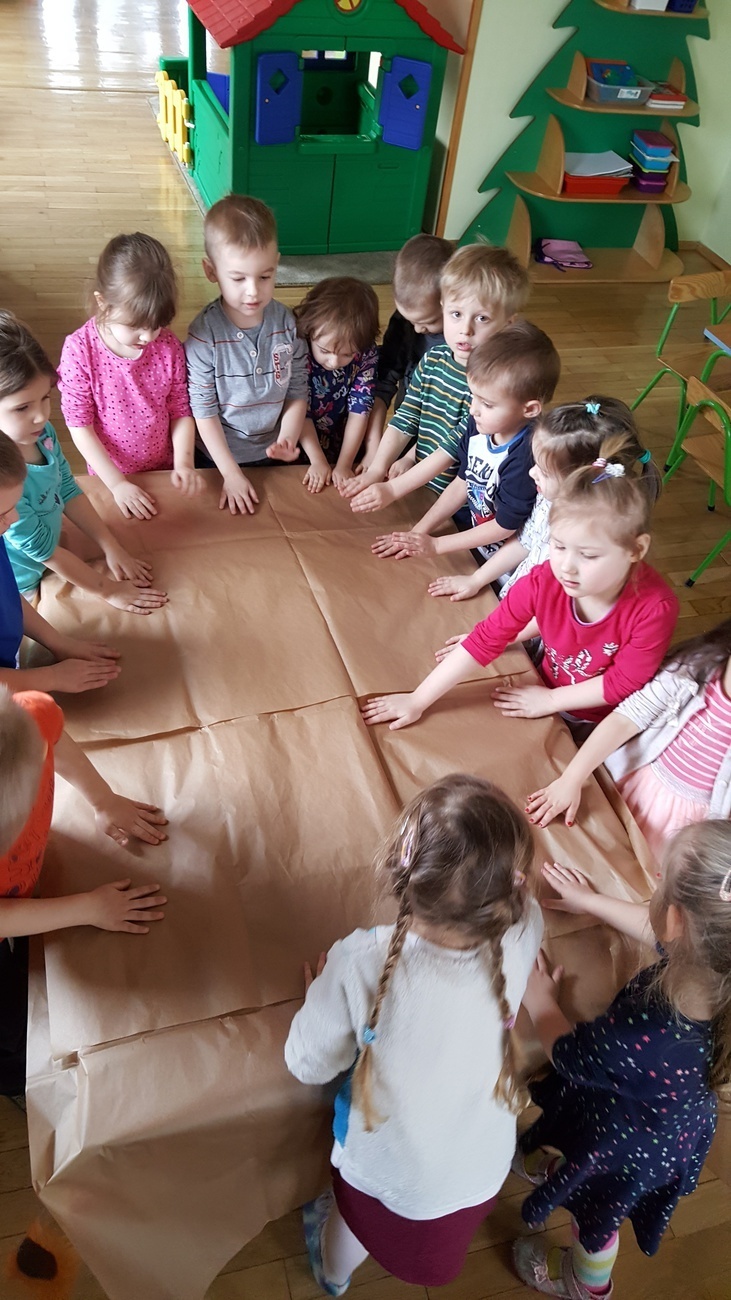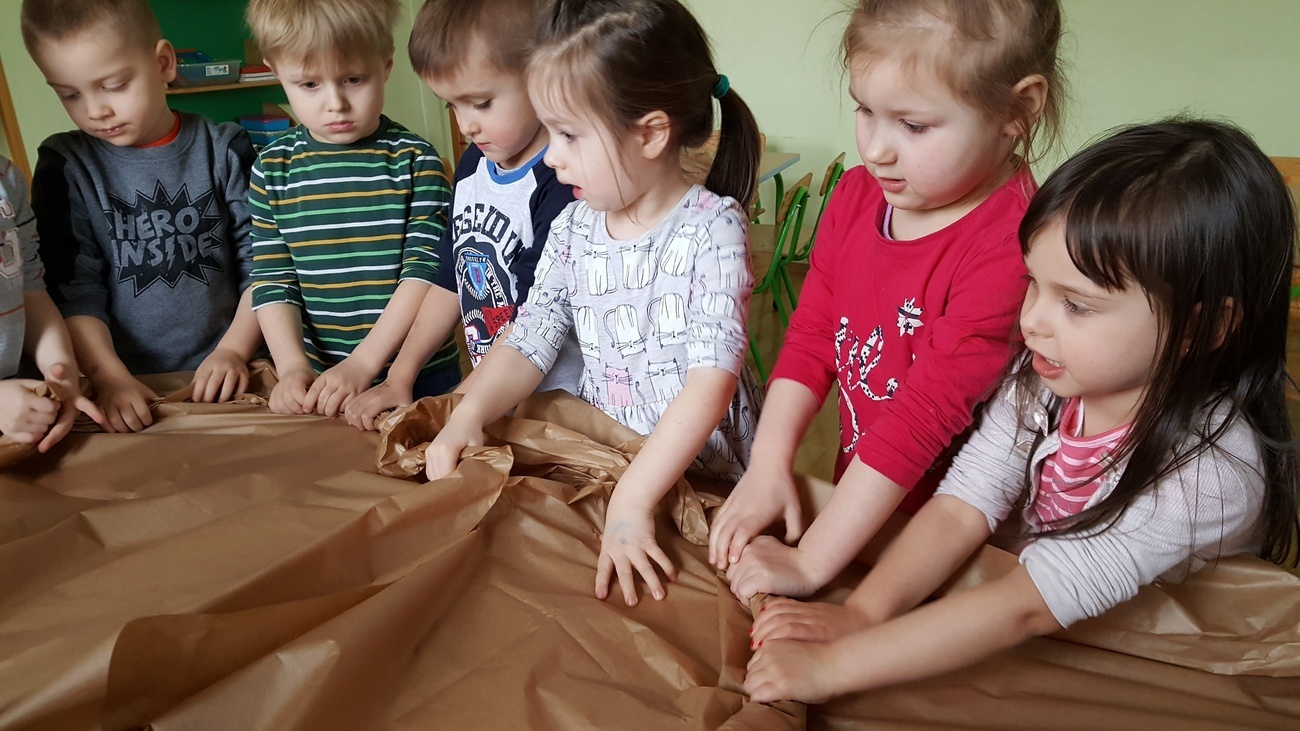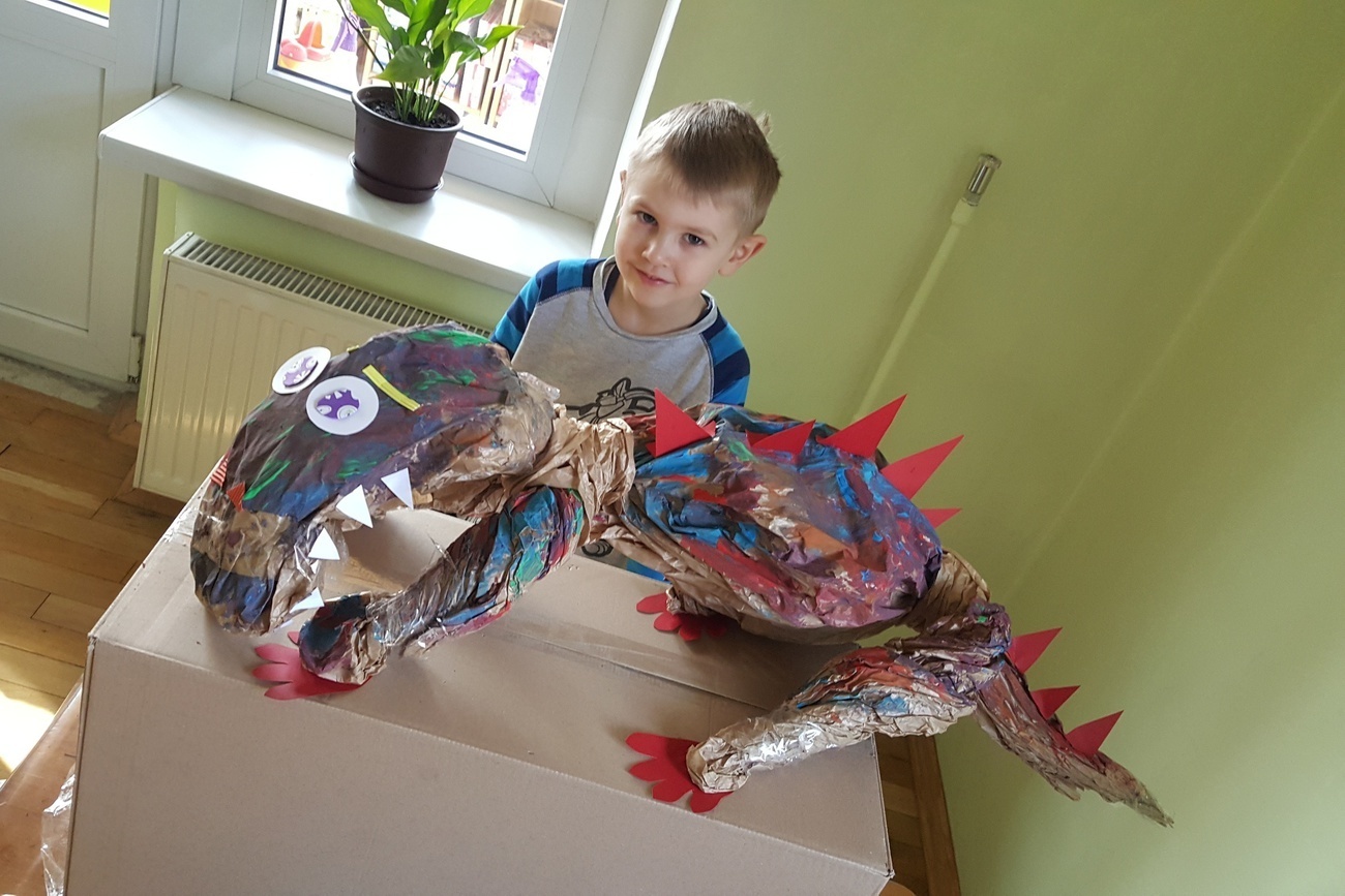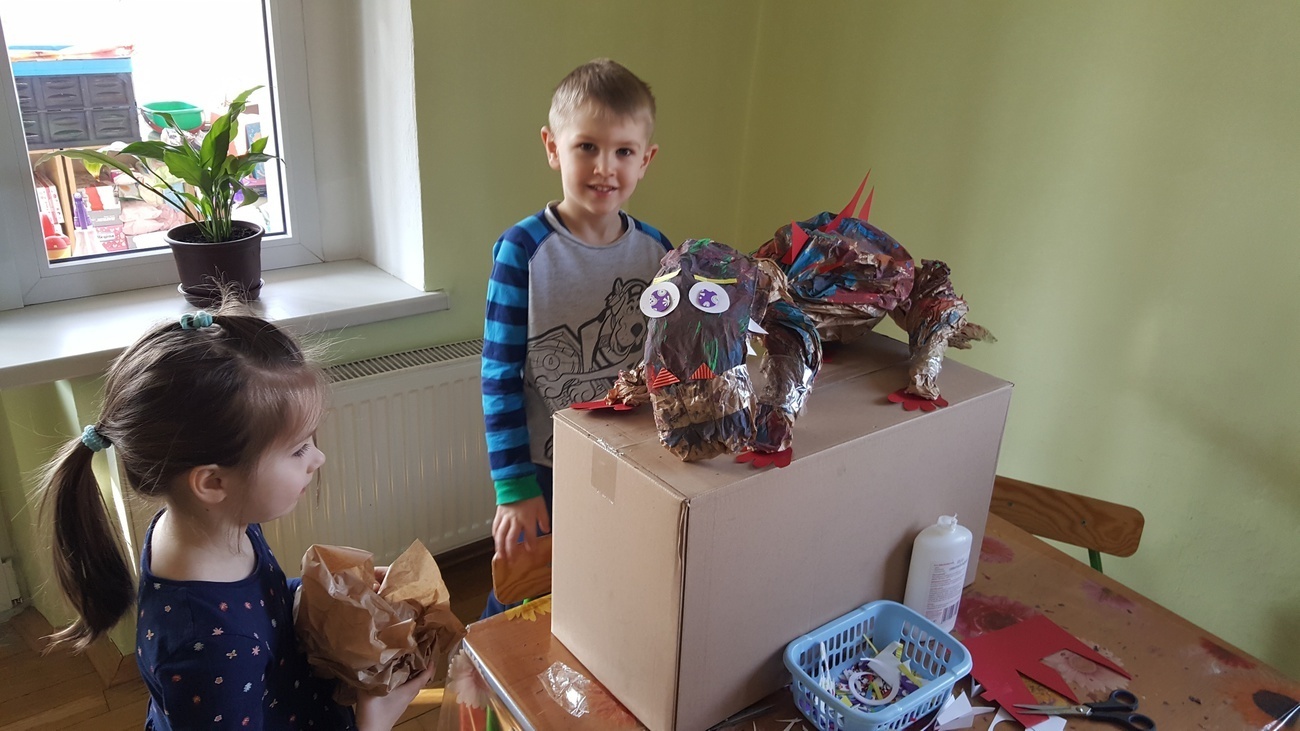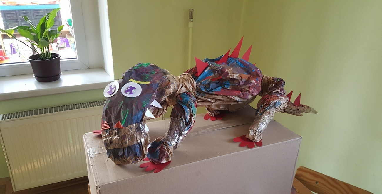 Dinozaury to stwory, które wyginęły przed wiekami i ślad po nich zaginął. Były groźne i źle wychowane, szczerzyły kły i deptały wszystko co napotkały na swojej drodze. Dziś z użyciem ogromnej ilości mokrego papieru wspólnymi siłami ugnietliśmy jednego z tych strasznych potworów. Paskuda, którą stworzyliśmy była tak przerażająca, że aż pani Ania bała się wejść do sali z obiadem. Dopiero, gdy wyjaśniliśmy, że dinozaur nie jest prawdziwy, tylko z papieru i że nie zje wszystkiego sam, dała się przekonać i uraczyła nas posiłkiem. A czas był najwyższy, bo ta prehistoryczno ekologiczna praca zmęczyła nas okrutnie.