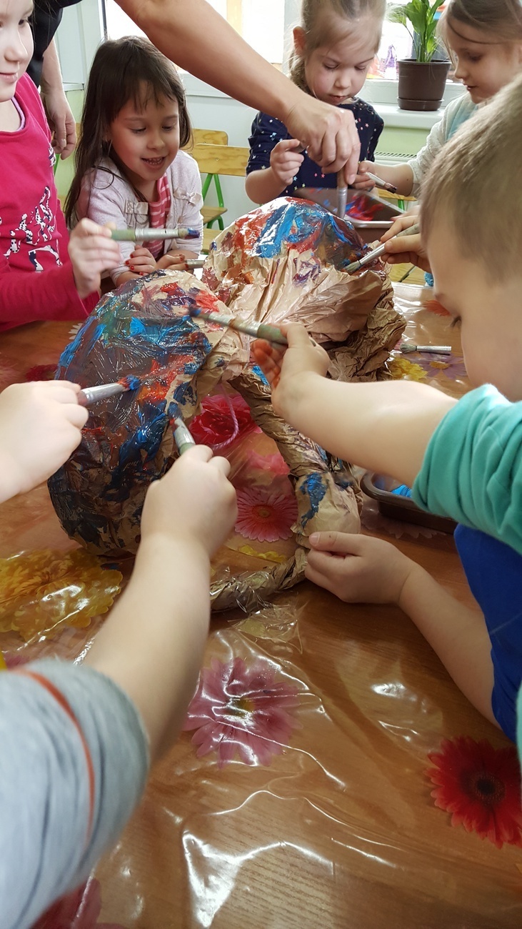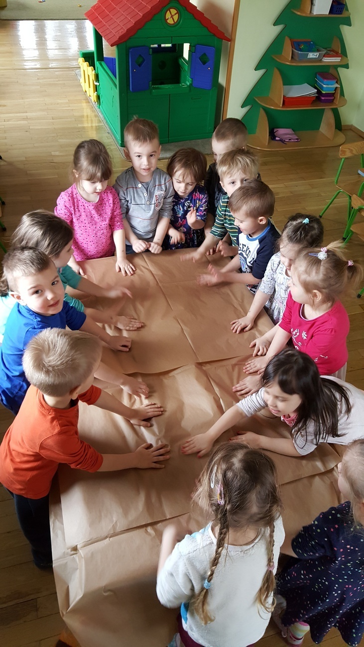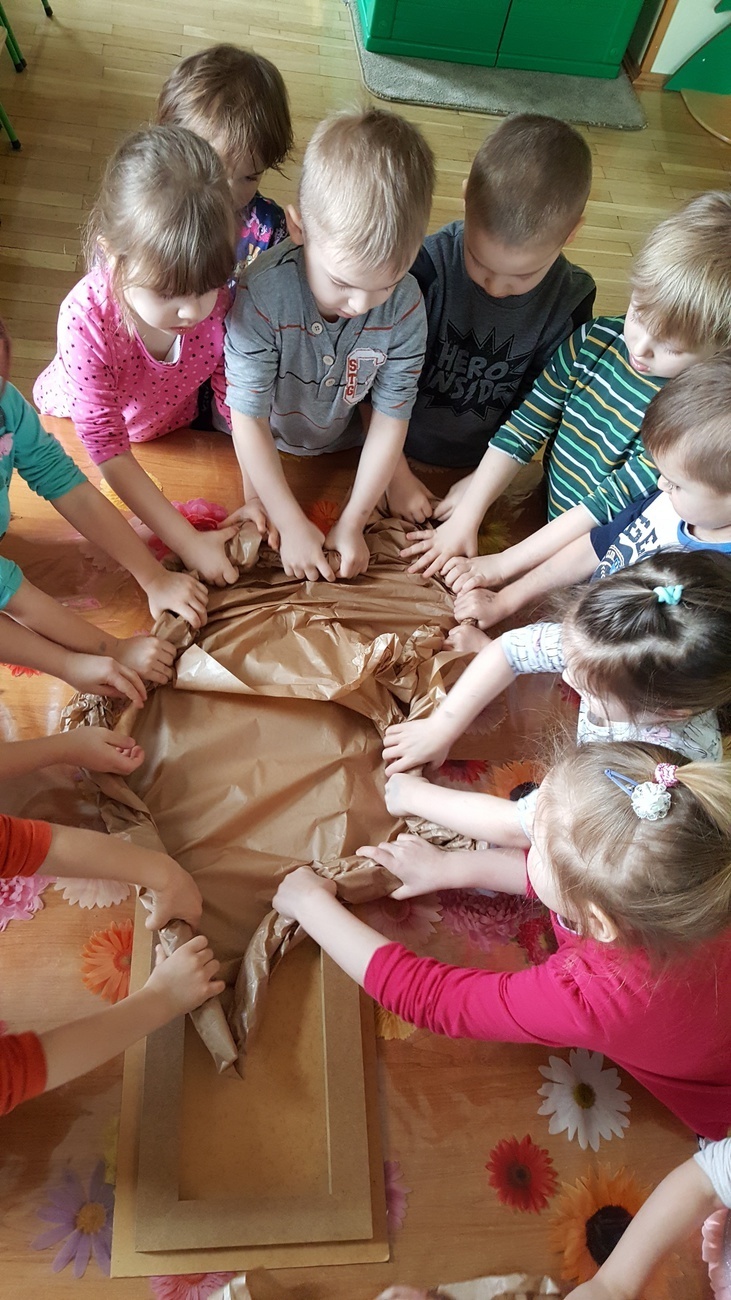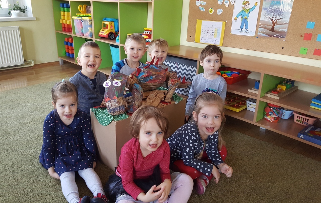 Dinozaury to stwory, które wyginęły przed wiekami i ślad po nich zaginął. Były groźne i źle wychowane, szczerzyły kły i deptały wszystko co napotkały na swojej drodze. Dziś z użyciem ogromnej ilości mokrego papieru wspólnymi siłami ugnietliśmy jednego z tych strasznych potworów. Paskuda, którą stworzyliśmy była tak przerażająca, że aż pani Ania bała się wejść do sali z obiadem. Dopiero, gdy wyjaśniliśmy, że dinozaur nie jest prawdziwy, tylko z papieru i że nie zje wszystkiego sam, dała się przekonać i uraczyła nas posiłkiem. A czas był najwyższy, bo ta prehistoryczno ekologiczna praca zmęczyła nas okrutnie.
