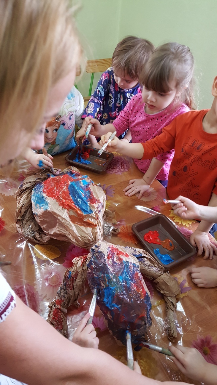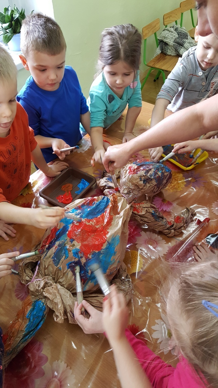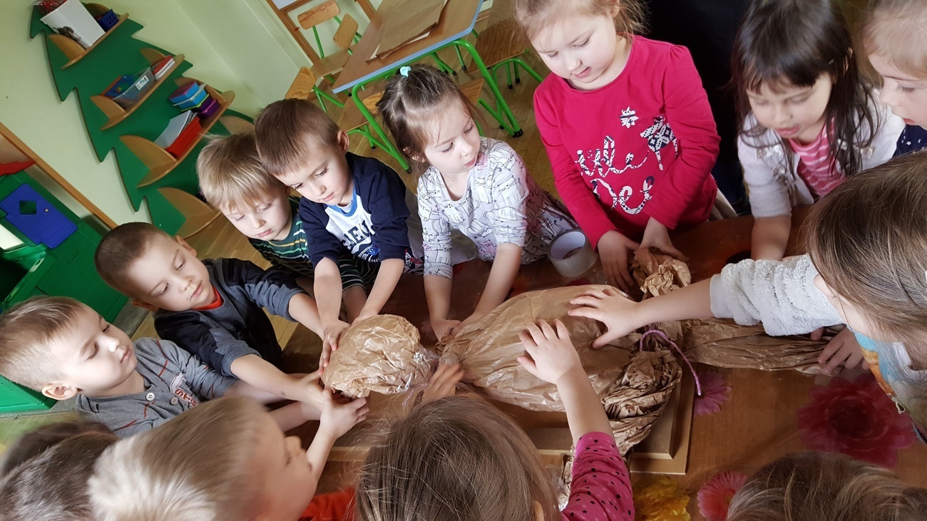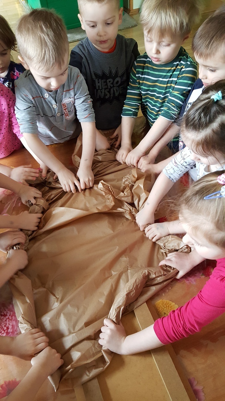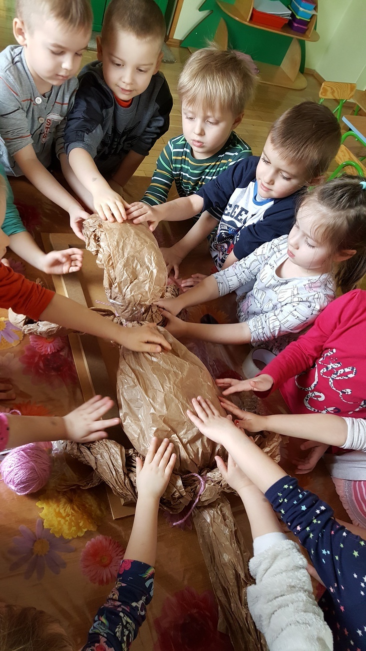 Dinozaury to stwory, które wyginęły przed wiekami i ślad po nich zaginął. Były groźne i źle wychowane, szczerzyły kły i deptały wszystko co napotkały na swojej drodze. Dziś z użyciem ogromnej ilości mokrego papieru wspólnymi siłami ugnietliśmy jednego z tych strasznych potworów. Paskuda, którą stworzyliśmy była tak przerażająca, że aż pani Ania bała się wejść do sali z obiadem. Dopiero, gdy wyjaśniliśmy, że dinozaur nie jest prawdziwy, tylko z papieru i że nie zje wszystkiego sam, dała się przekonać i uraczyła nas posiłkiem. A czas był najwyższy, bo ta prehistoryczno ekologiczna praca zmęczyła nas okrutnie.