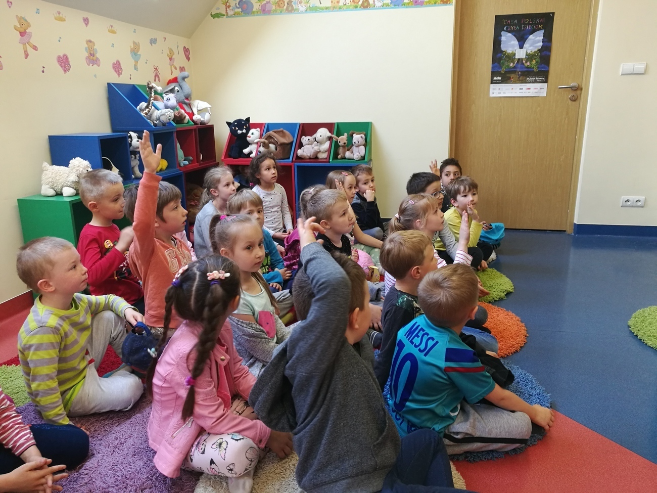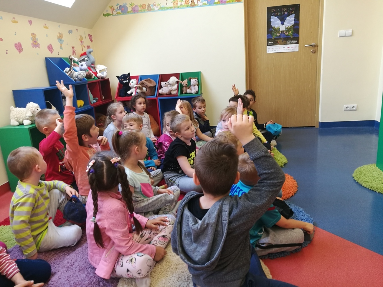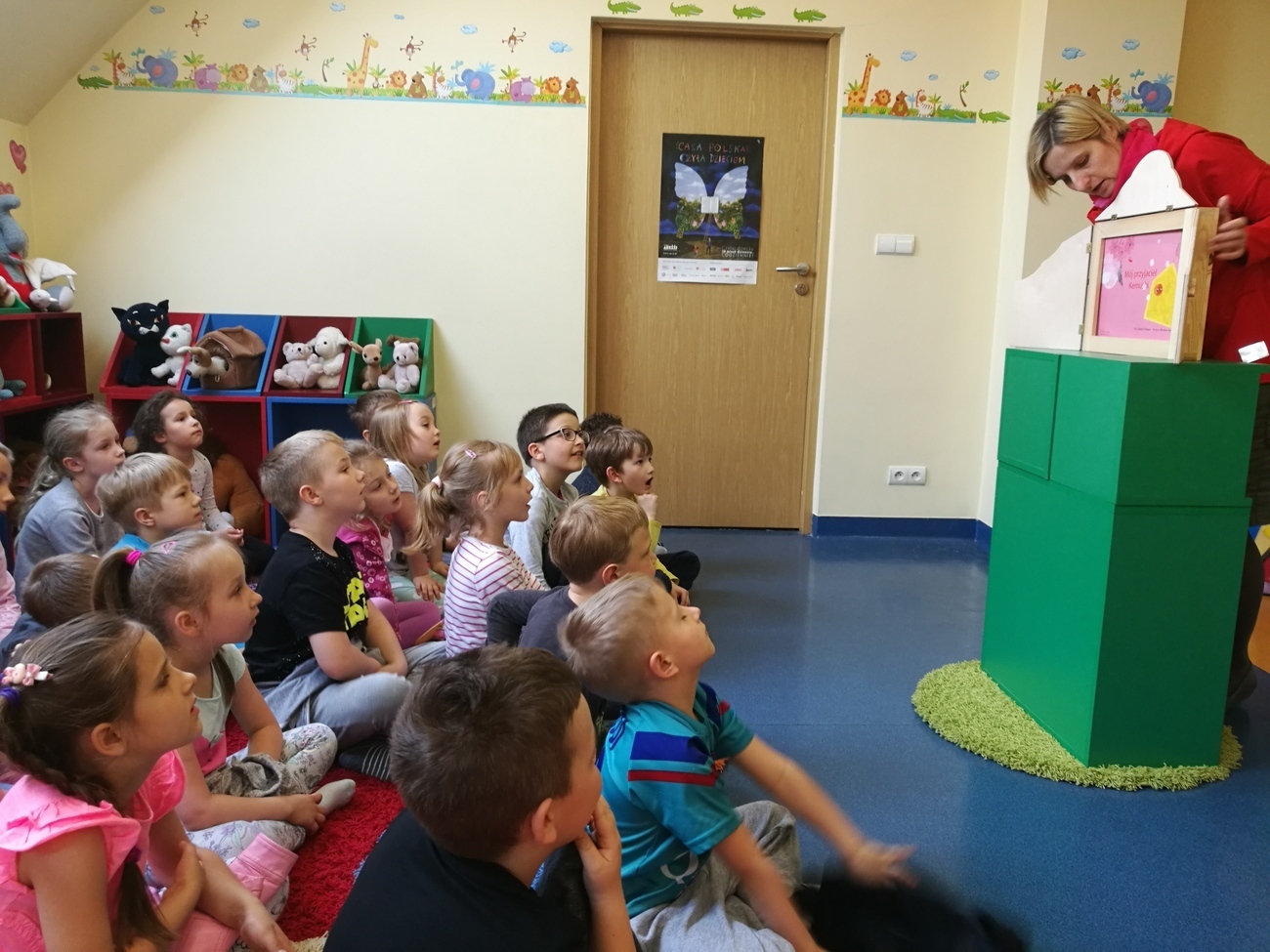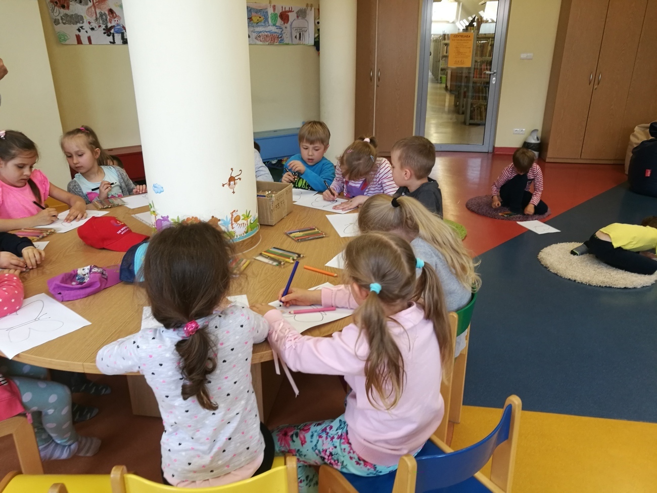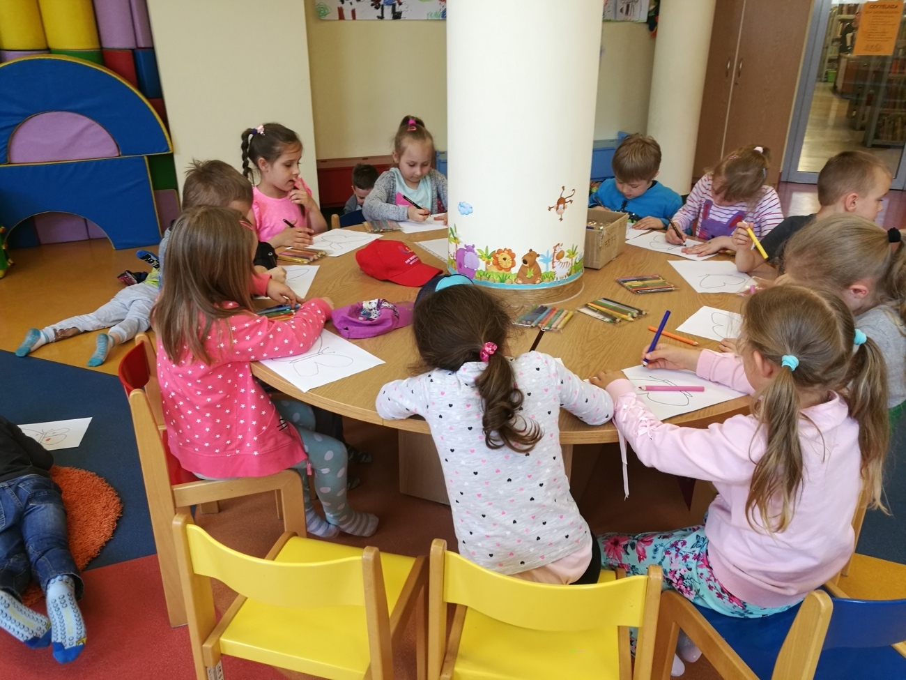 23 kwietnia jest obchodzony jako Światowy Dzień Książki - z tej okazji starszaki znalazły się w miejscu, które gromadzi książki rożnych gatunków i rodzajów, jest to biblioteka. W dziale dziecięco - młodzieżowym spotkaliśmy się z panią bibliotekarką, która oprowadziła nas po bibliotece. Od tej ilości książek aż kręci się nam w głowie. Każda z nich kolorowa, z ciekawymi obrazkami i jeszcze ciekawszymi tytułami. Gdybyśmy mieli zdecydować się na obejrzenie tylko jednej wybranej pozycji, byłoby to chyba niemożliwe. Następnie udaliśmy się do sali, w której czekała na nas niespodzianka. Otóż oprócz książek w bibliotece obejrzeliśmy wyjątkowy teatrzyk Kamisihibai. Wysłuchaliśmy ciekawej historii o gąsienicy, która później stała się motylem. Na zakończenie zajęć dostaliśmy do pokolorowania motyle, z których powstała później wspaniała wystawa. Dzieci z głową pełną wrażeń wróciły do przedszkola i jeszcze długo rozmawiały o tym kto jaką książkę by wypożyczył.