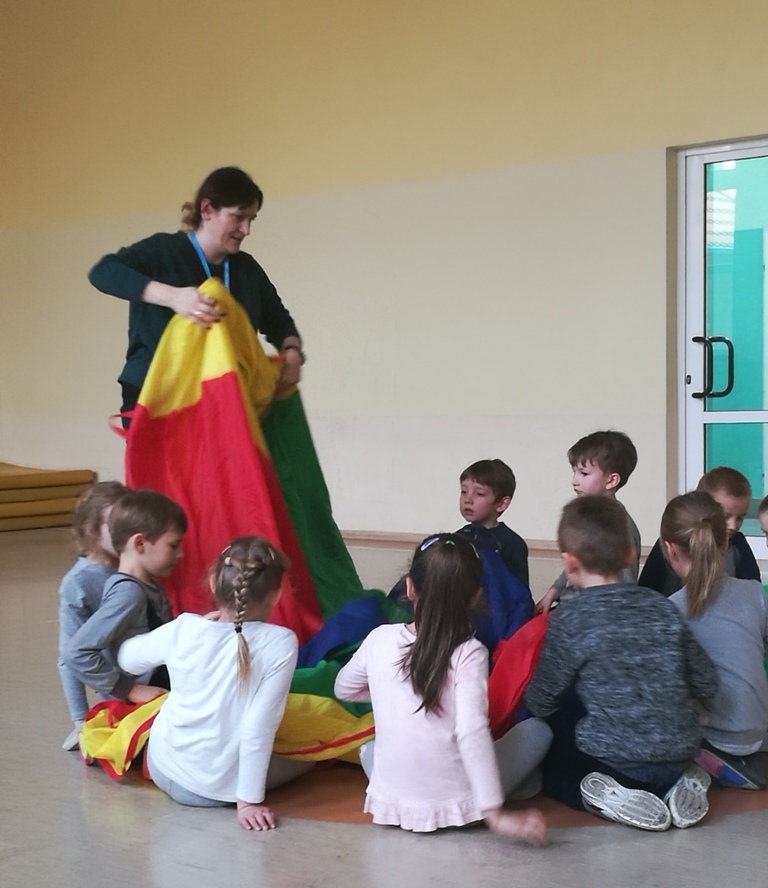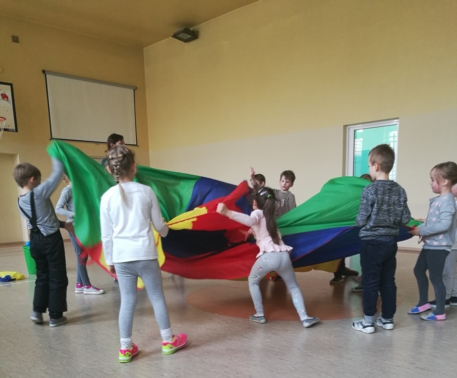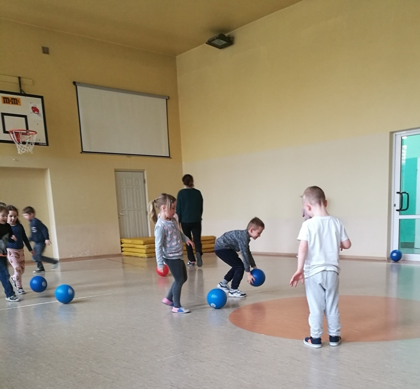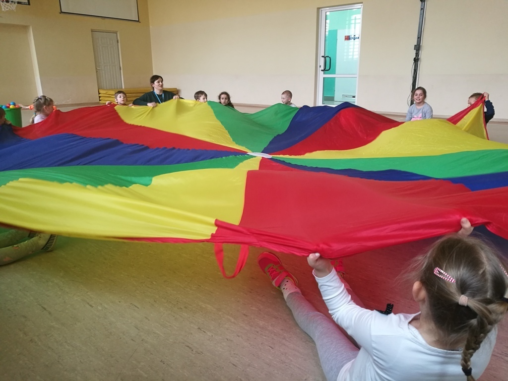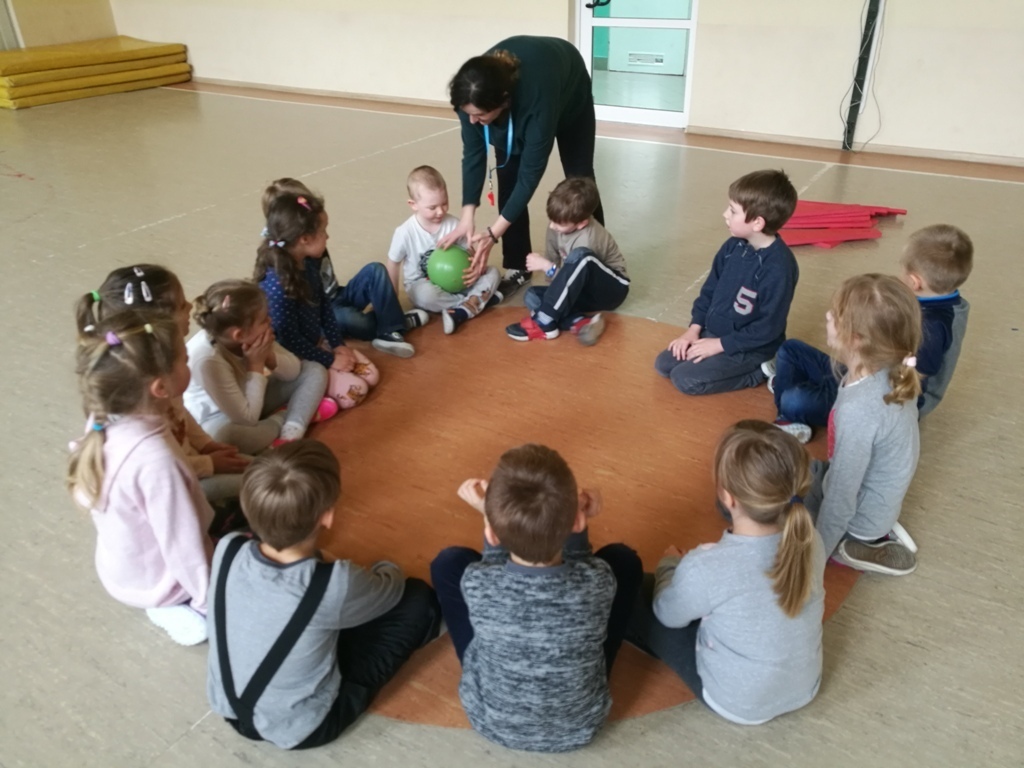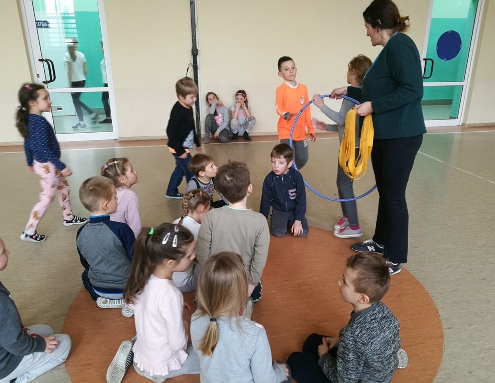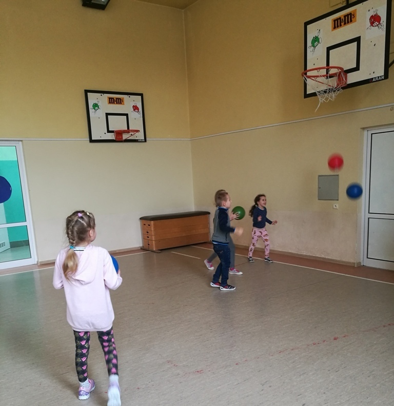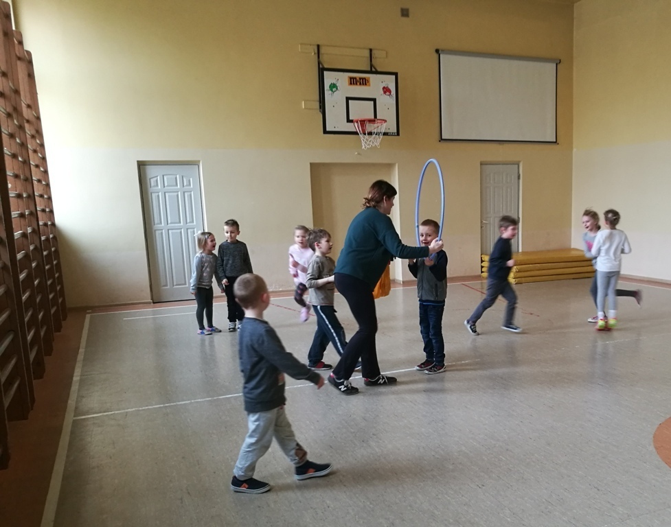 Pod koniec miesiąca marca znowu byliśmy w Szkole Podstawowej nr 10, na zajęciach sportowych. Po przyjściu powitała nas pani Natalia i zaprosiła do sali gimnastycznej. W sali czekali już koledzy i koleżanki z kl. IIId, z którymi rozpoczęliśmy zabawę: Berek z ogonkiem, zabawy z piłką, zabawy z chustą animacyjną. To tylko niektóre z zajęć, które tam się odbyły. Przedszkolakom bardzo podobało się, że swobodnie mogły biegać i bawić się w sali gimnastycznej. Wszyscy aktywnie uczestniczyli w zajęciach, sprawnie wykonywali polecenia pani nauczycielki. Przygotowany tor przeszkód sprawił nam wiele radości, chociaż niektórzy mieli drobny problem, by go pokonać. Dzieci nie po raz pierwszy odwiedzają szkołę, lecz za każdym razem wychodzą zadowolone i trochę ze smutkiem, że tak szybko się kończą zajęcia. Dzięki tym spotkaniom szkoła przestaje być miejscem nieznanym a staje się ciekawą przygodą.