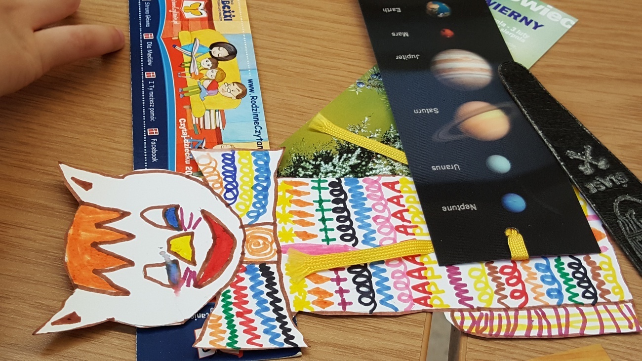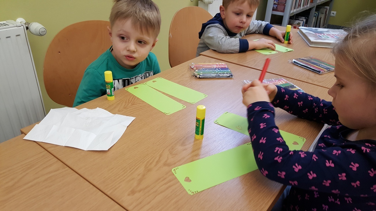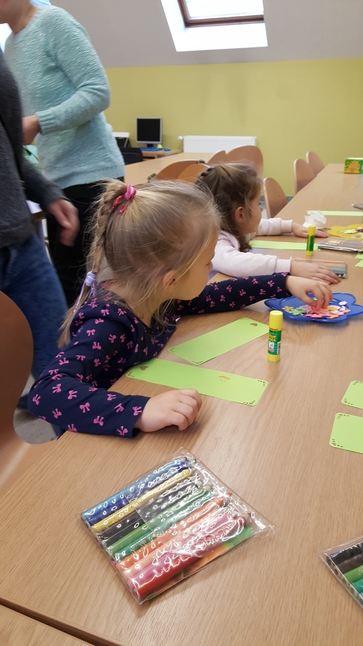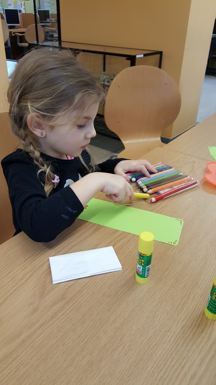 Gdy coś niespodzianie przerwie czytanie książki, wcale nie trzeba pamiętać, na której stronie przestało się czytać. Wystarczy mieć zakładkę. Ale skąd wziąć taką zakładkę... Dla nas to nie problem! Potrafimy zrobić ją sami. Wystarczy kawałek kolorowego kartonu, kredki, klej, sznurek i kolorowe pisaki. Dziś wspólnie z panią bibliotekarką każdy z nas wykonał taką zakładkę jako prezent dla swojej mamy.