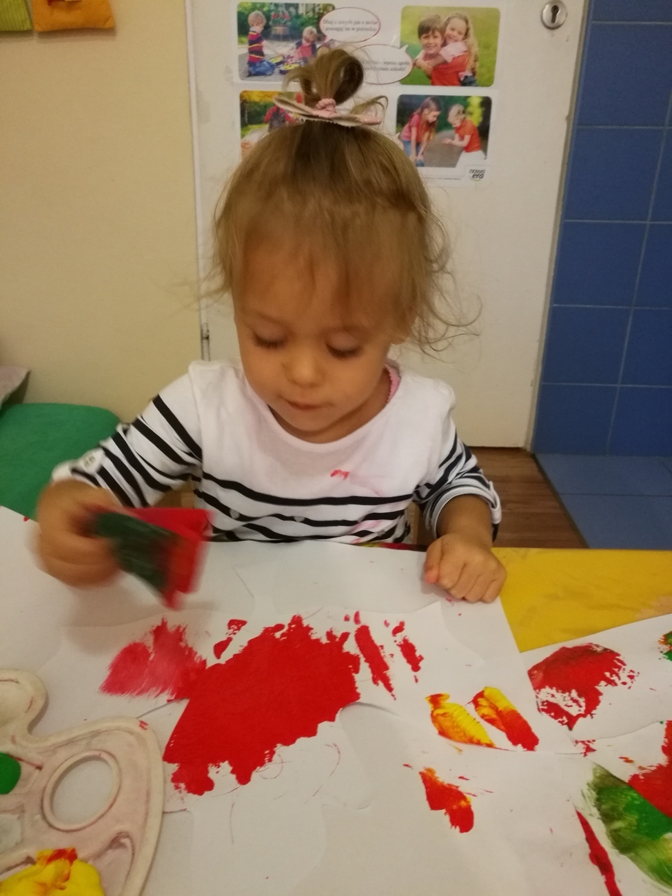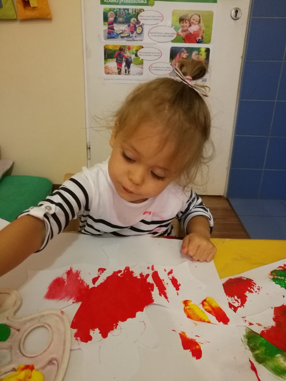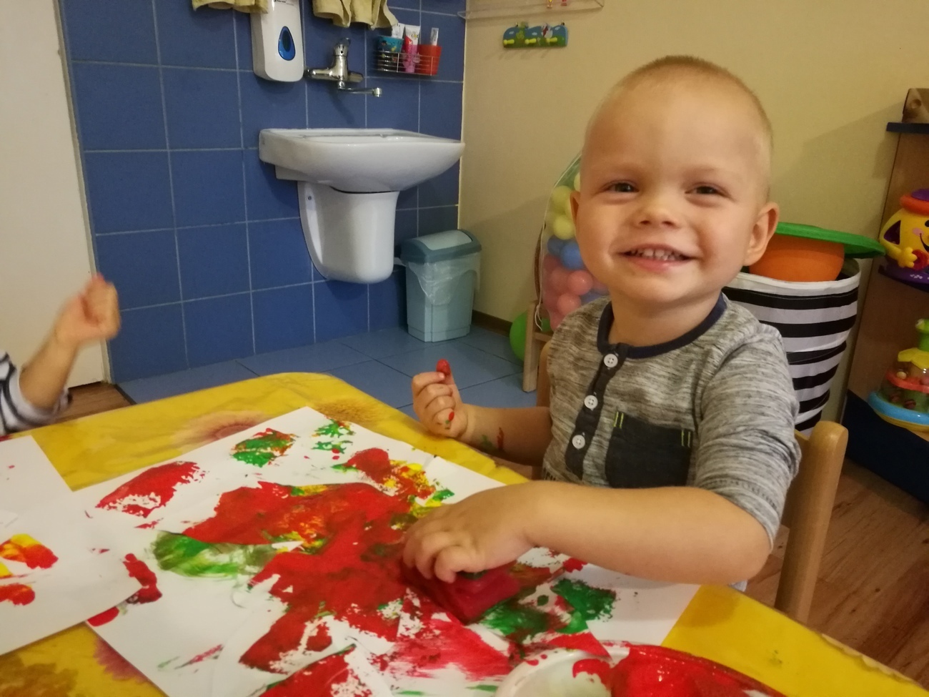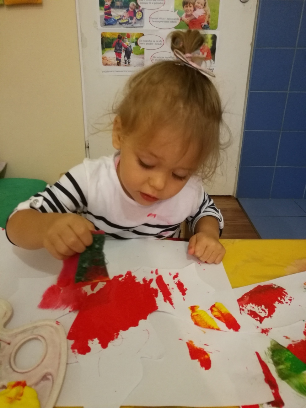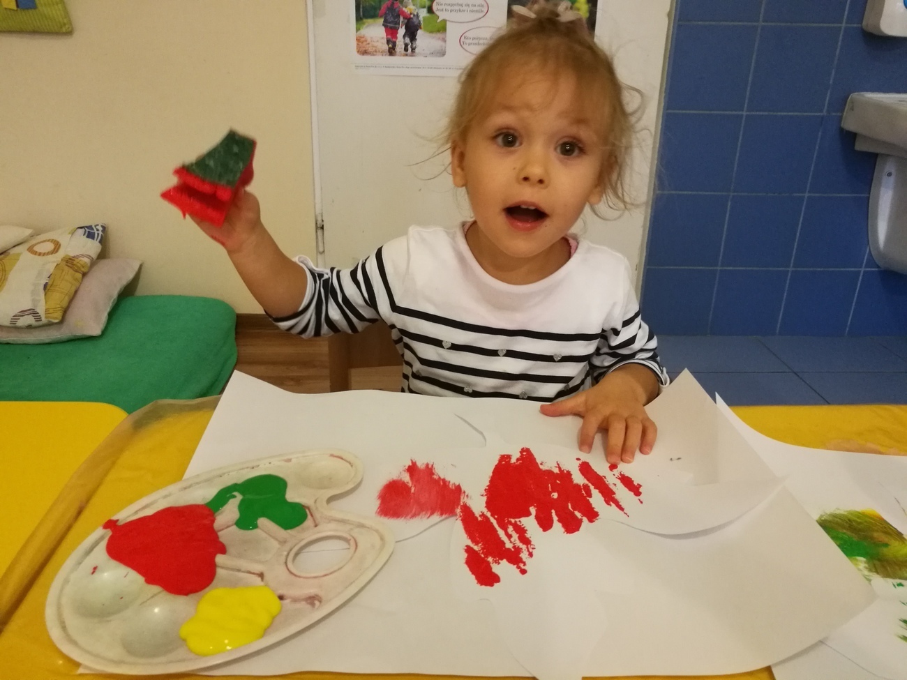 Dzisiejszy dzień jest kolorowy. Bawimy się i rozmawiamy o trzech kolorach żółtym, czerwonym i zielonym. W pierwszej zabawie segregowaliśmy kolorowe kulki z naszego basenu do trzech pojemników. W jednym były same kulki czerwone, w drugim żółte z w trzecim zielone. Później bawiliśmy się chustą animacyjną i tam też szukaliśmy naszych trzech kolorów. Uważnie przyglądaliśmy się przedmiotom w naszej sali i pokazywaliśmy te, które mają poszukiwane przez nas barwy. Najlepsza zabawa była jednak na koniec. Pani przygotowała trzy duże liście, które malowaliśmy za pomocą gąbek na typowo jesienne kolory: czerwony, żółty i zielony. Gdy listki wyschną ozdobimy nimi naszą salę. Po takim dniu mamy kolorowy zawrót głowy, a na pewno: czerwony, żółty i zielony.