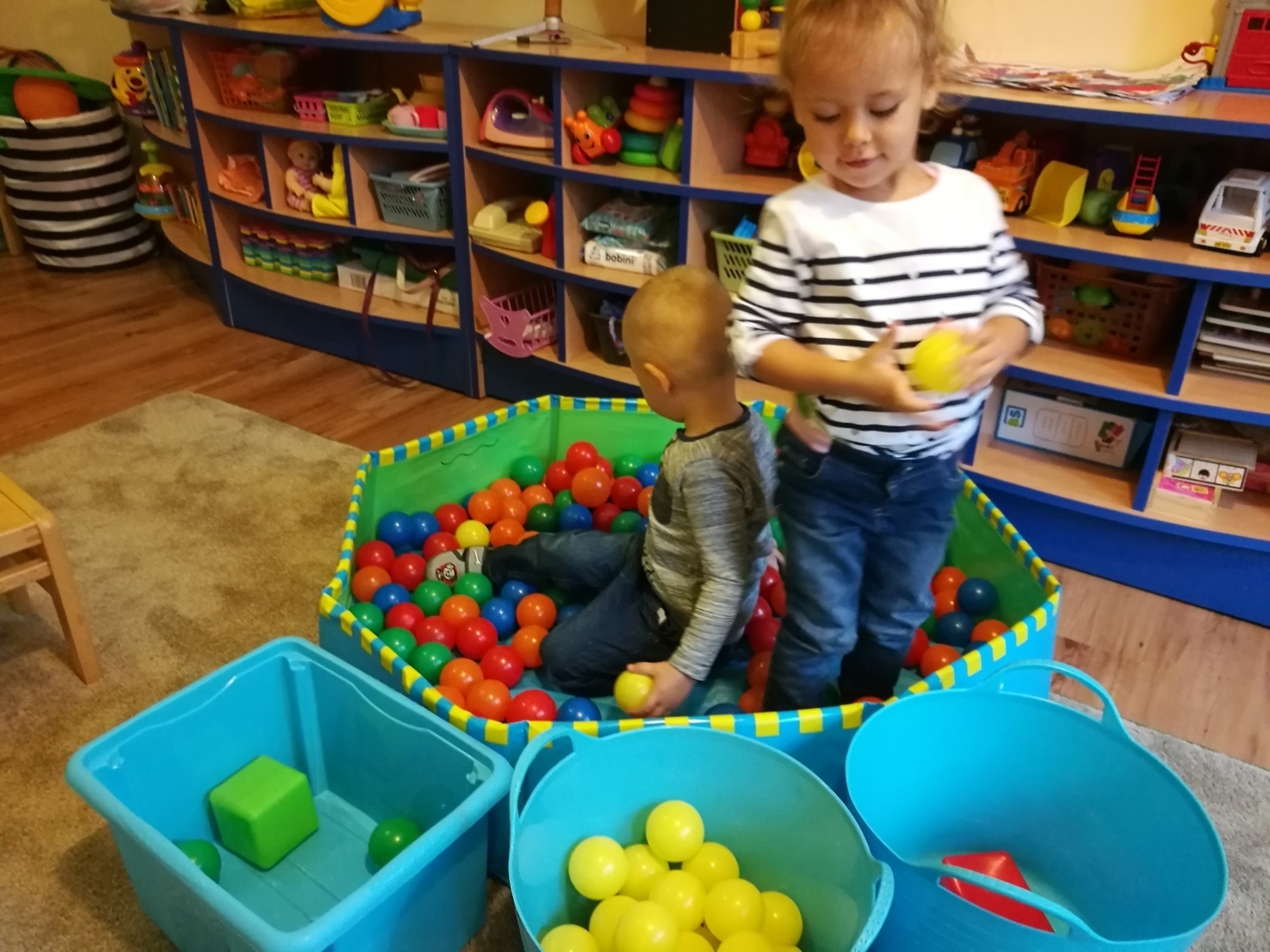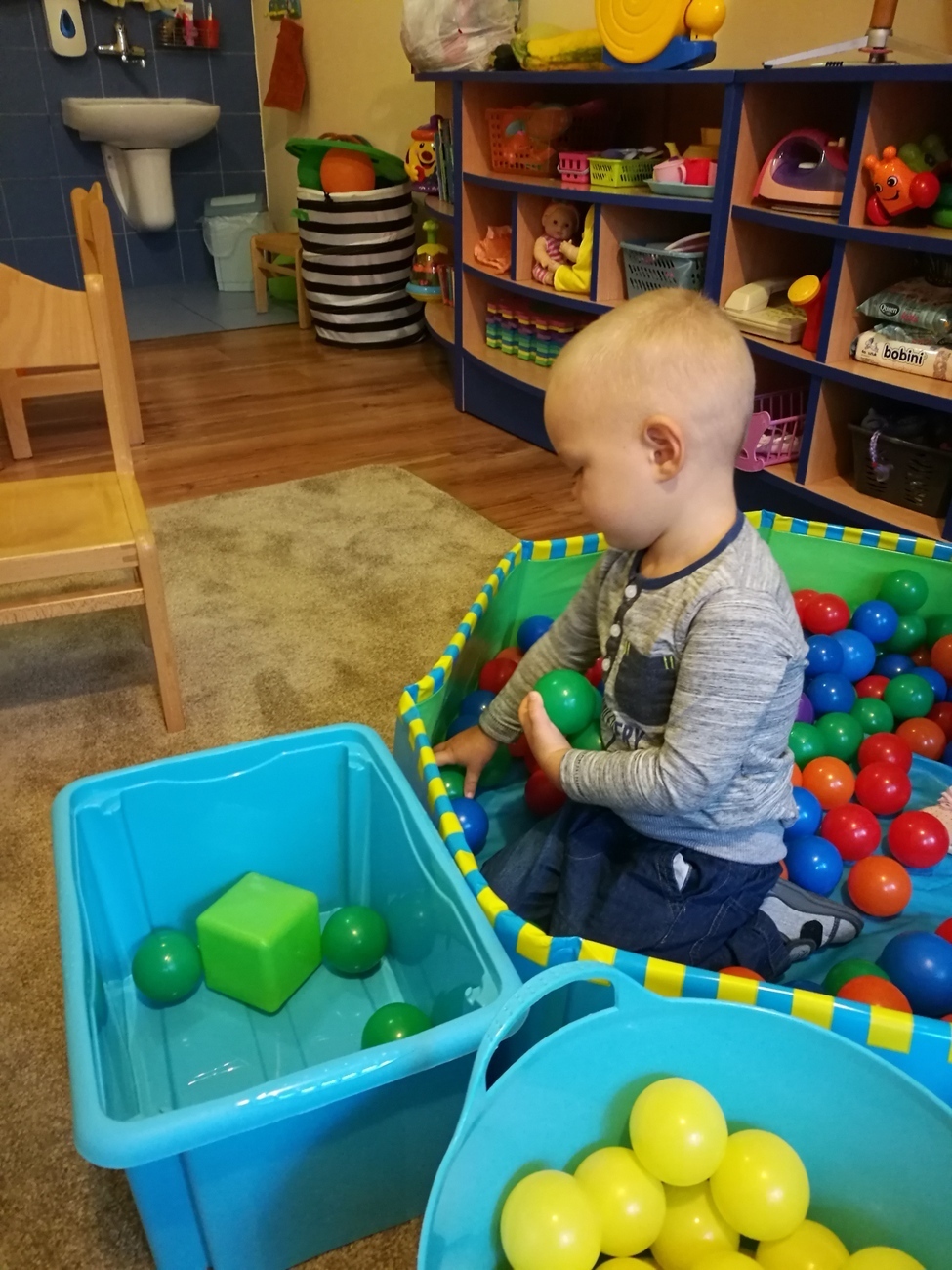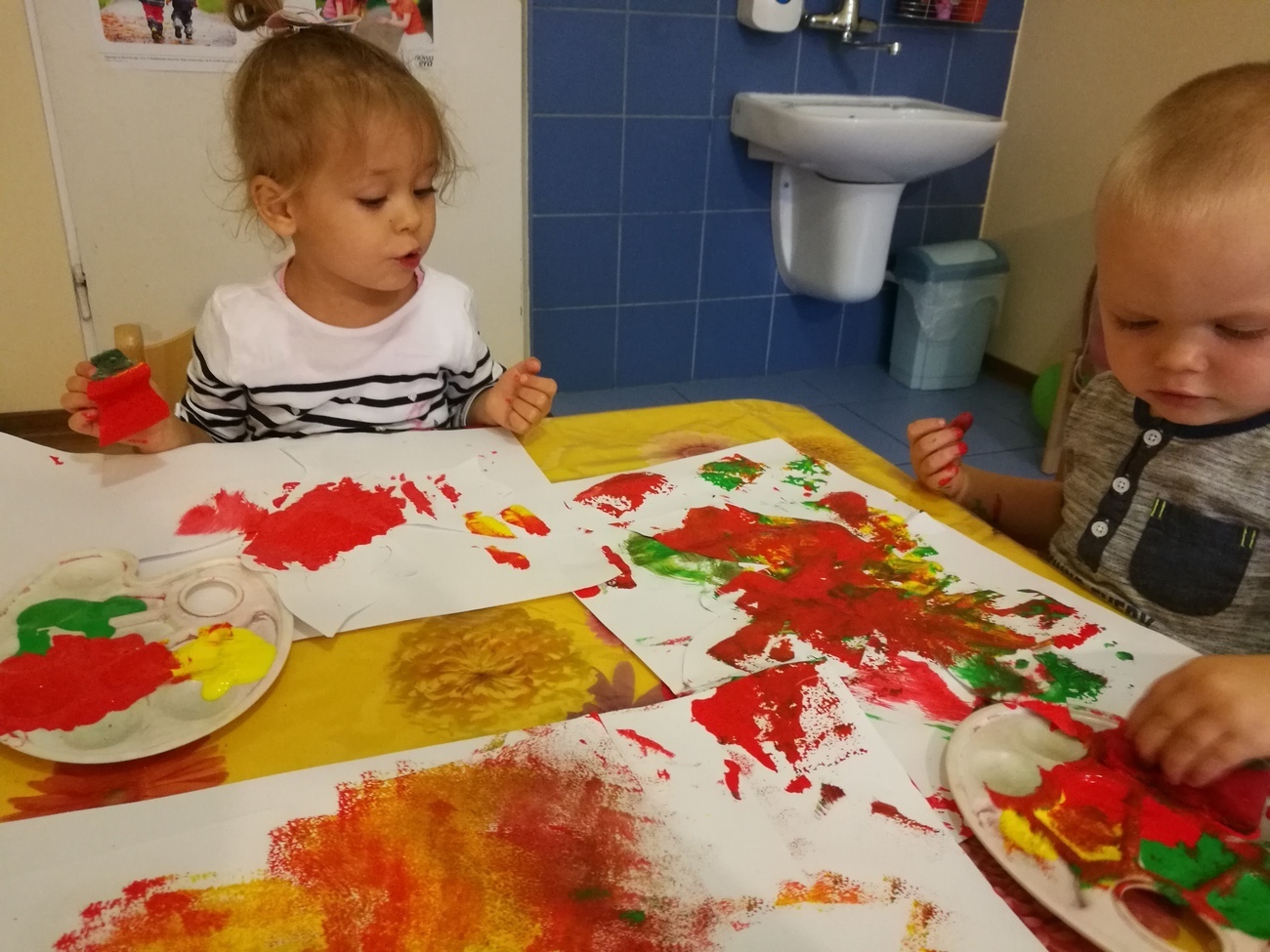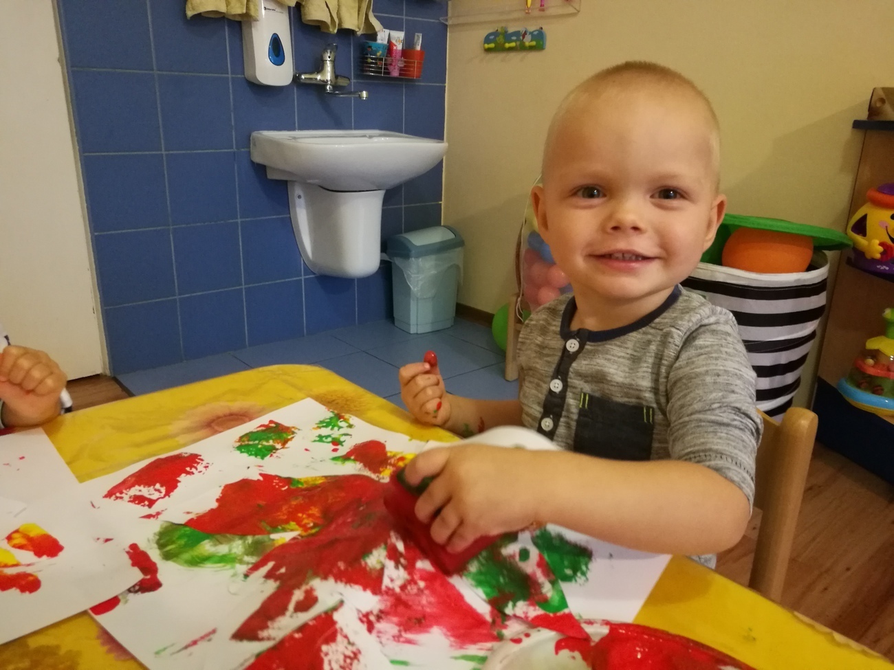 Dzisiejszy dzień jest kolorowy. Bawimy się i rozmawiamy o trzech kolorach żółtym, czerwonym i zielonym. W pierwszej zabawie segregowaliśmy kolorowe kulki z naszego basenu do trzech pojemników. W jednym były same kulki czerwone, w drugim żółte z w trzecim zielone. Później bawiliśmy się chustą animacyjną i tam też szukaliśmy naszych trzech kolorów. Uważnie przyglądaliśmy się przedmiotom w naszej sali i pokazywaliśmy te, które mają poszukiwane przez nas barwy. Najlepsza zabawa była jednak na koniec. Pani przygotowała trzy duże liście, które malowaliśmy za pomocą gąbek na typowo jesienne kolory: czerwony, żółty i zielony. Gdy listki wyschną ozdobimy nimi naszą salę. Po takim dniu mamy kolorowy zawrót głowy, a na pewno: czerwony, żółty i zielony.