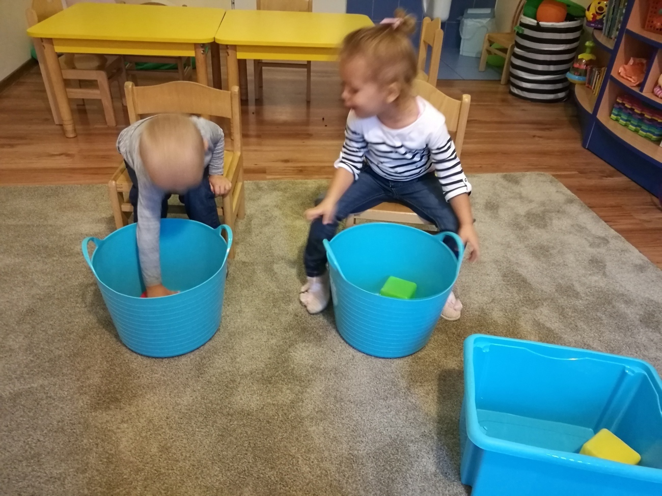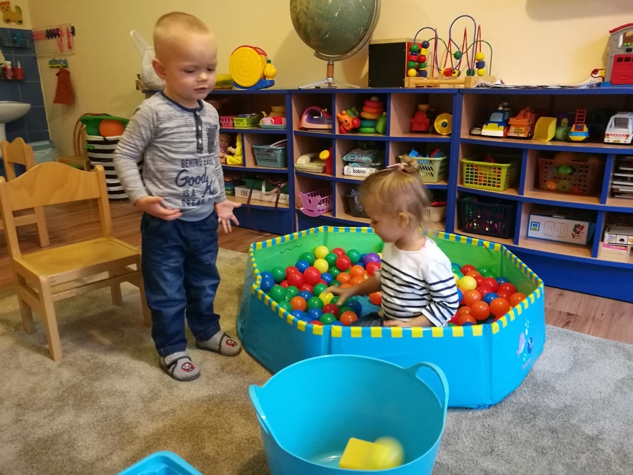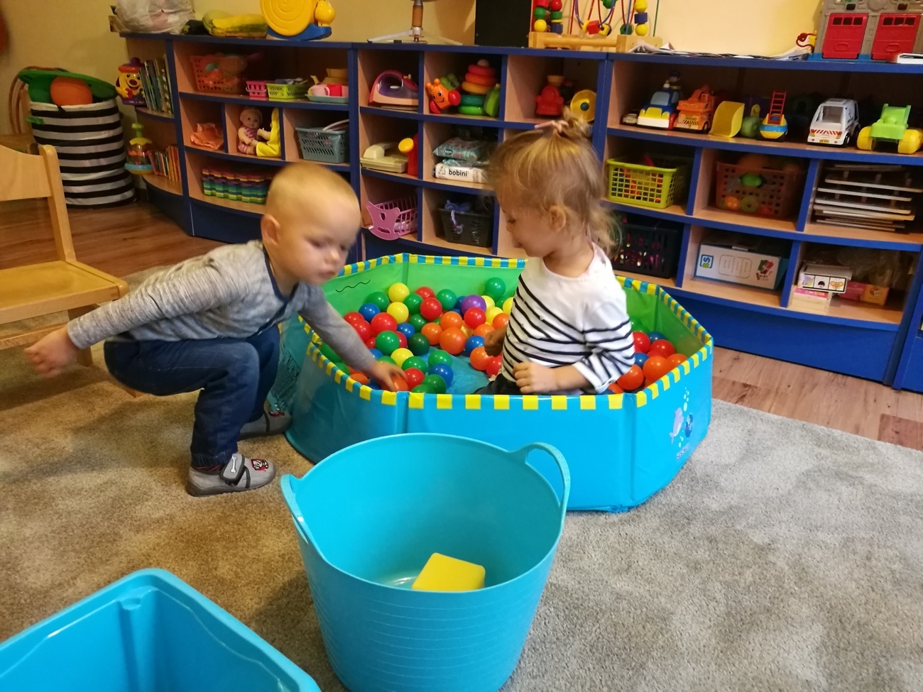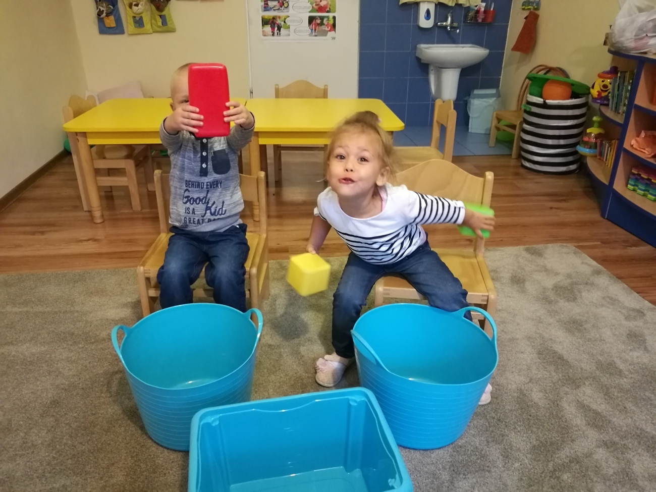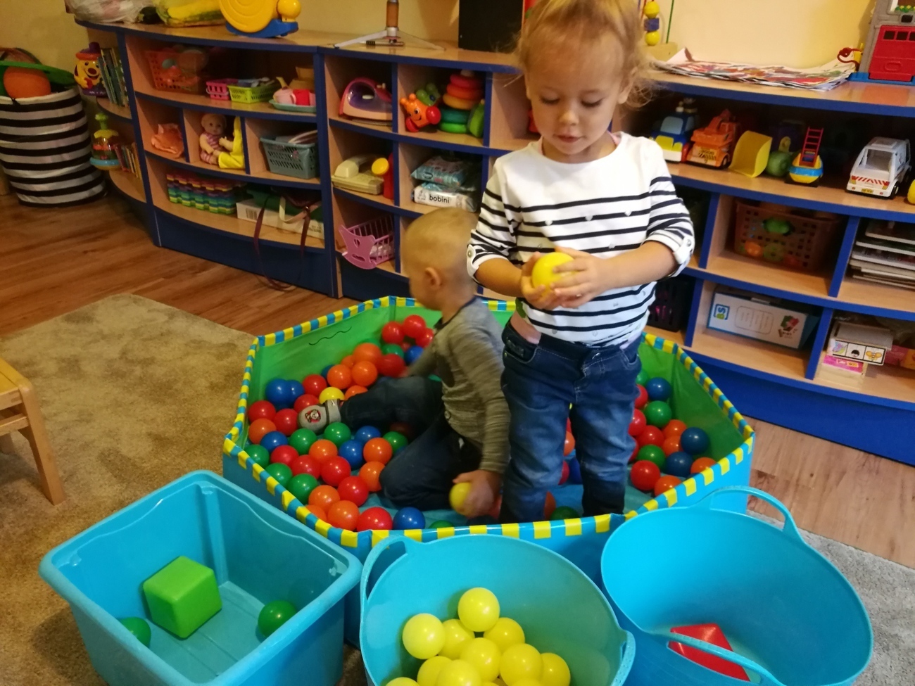 Dzisiejszy dzień jest kolorowy. Bawimy się i rozmawiamy o trzech kolorach żółtym, czerwonym i zielonym. W pierwszej zabawie segregowaliśmy kolorowe kulki z naszego basenu do trzech pojemników. W jednym były same kulki czerwone, w drugim żółte z w trzecim zielone. Później bawiliśmy się chustą animacyjną i tam też szukaliśmy naszych trzech kolorów. Uważnie przyglądaliśmy się przedmiotom w naszej sali i pokazywaliśmy te, które mają poszukiwane przez nas barwy. Najlepsza zabawa była jednak na koniec. Pani przygotowała trzy duże liście, które malowaliśmy za pomocą gąbek na typowo jesienne kolory: czerwony, żółty i zielony. Gdy listki wyschną ozdobimy nimi naszą salę. Po takim dniu mamy kolorowy zawrót głowy, a na pewno: czerwony, żółty i zielony.