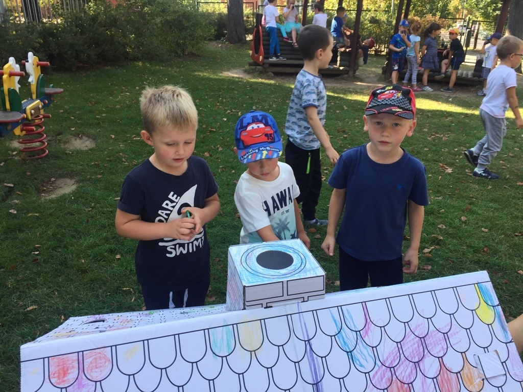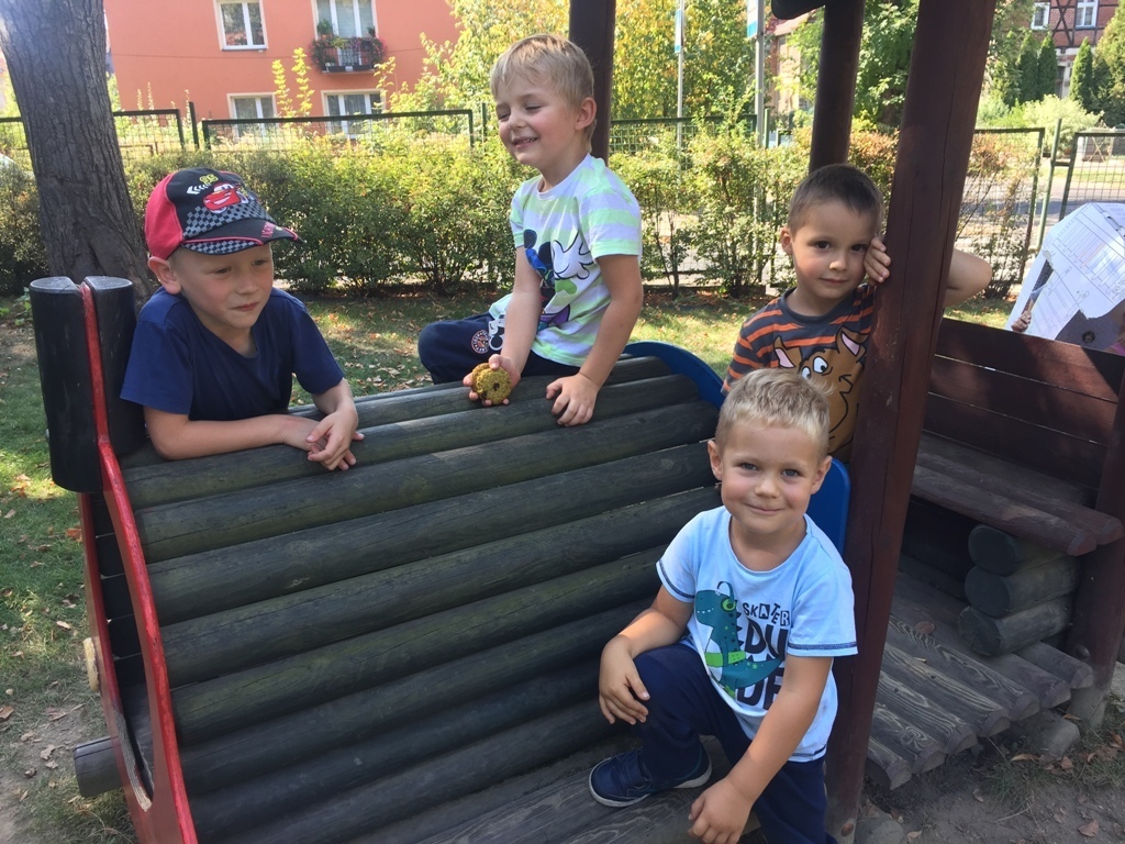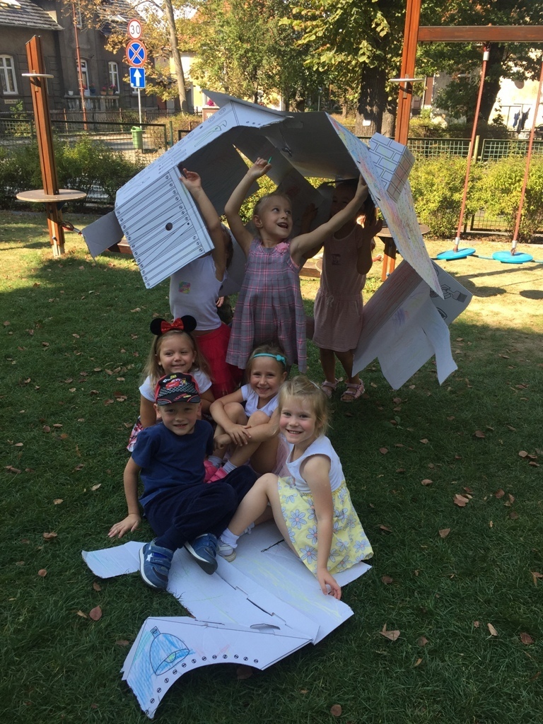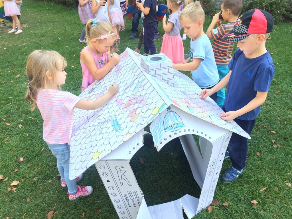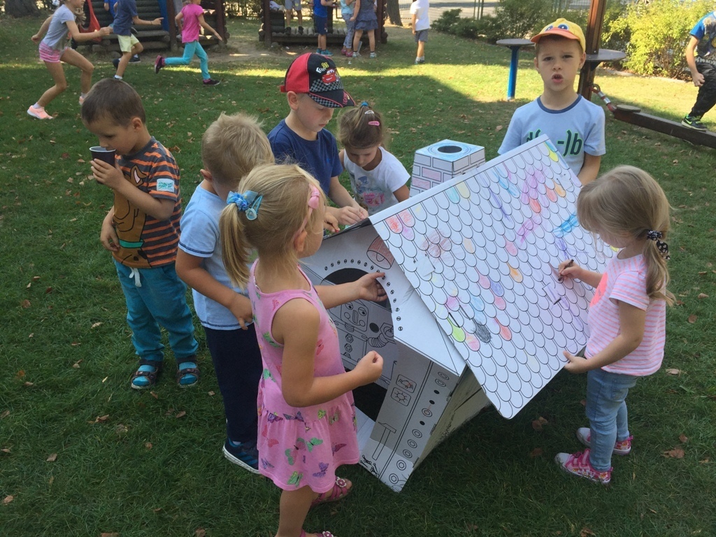 We wrzesniu pogoda nas bardzo rozpieszczaa, a my wykorzystalismy kazdy dzień bawiąc sie na przedszkolnym podwórku lub wychodząc na spcery i poznając nasza okolicę. Wspaniałą zabawa było wspolne kolorowabnie duzego papierowego dopmku, który przyniósł dla nas Filip. Uwielbiamy takie zabawy.