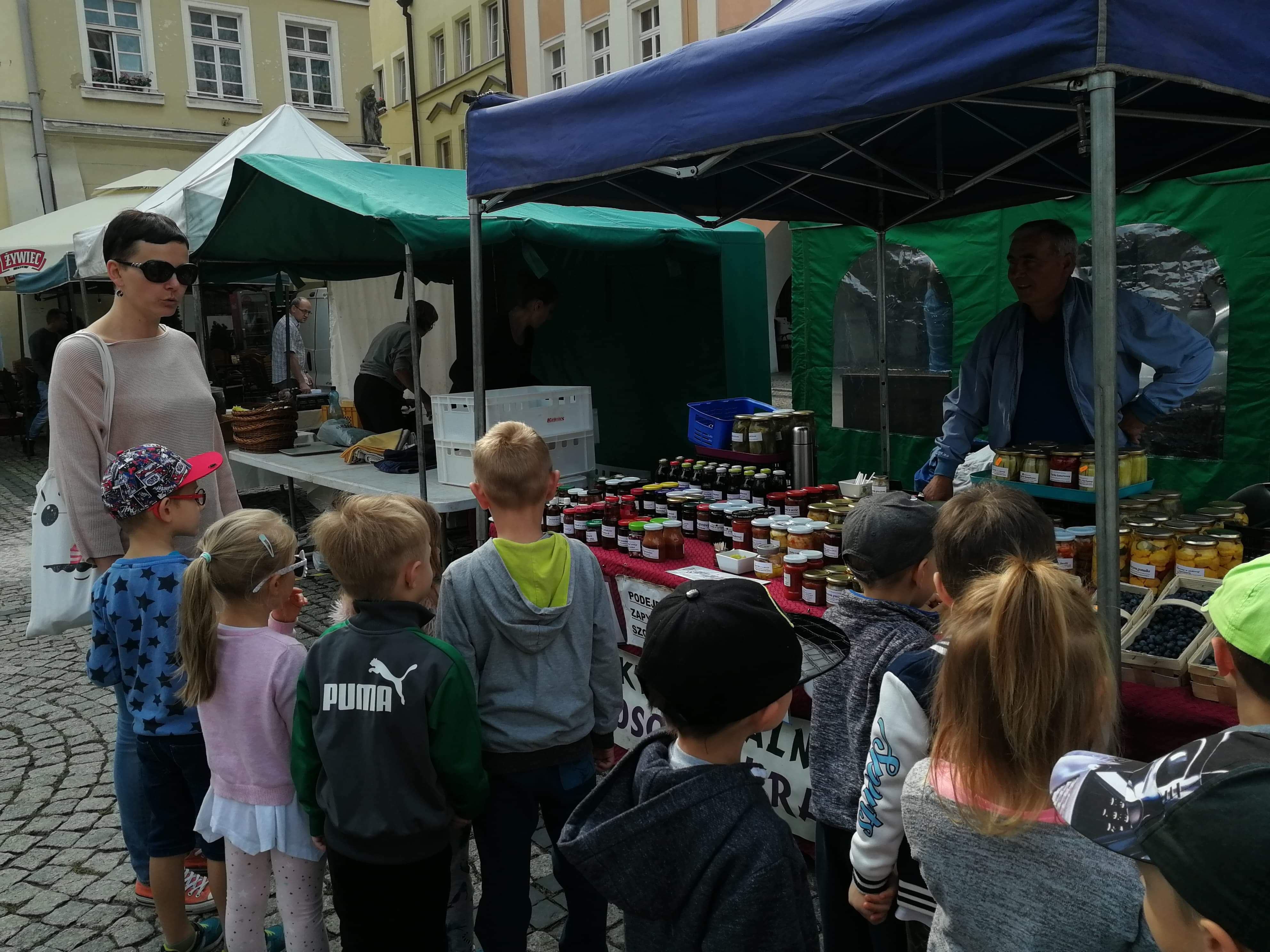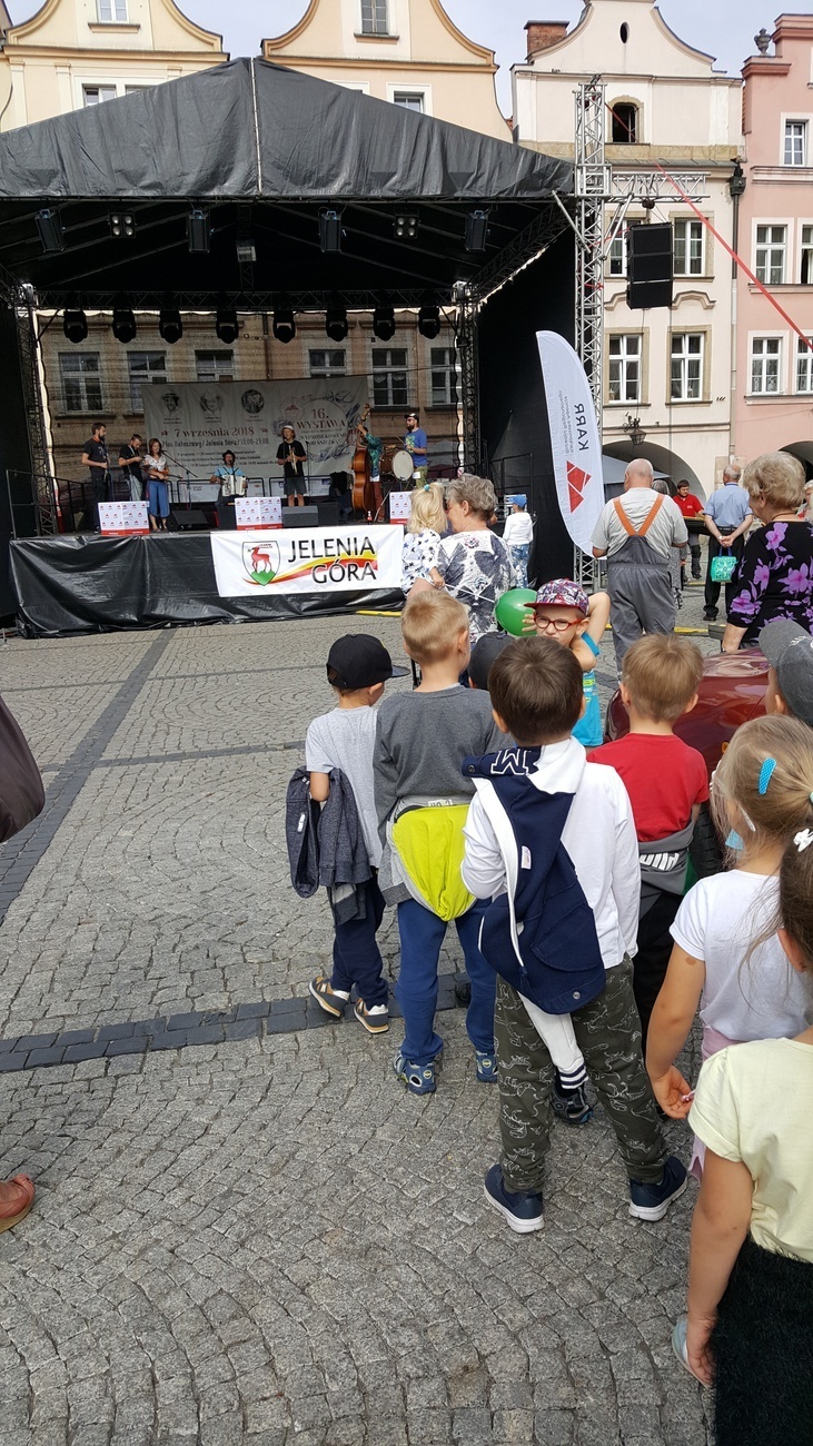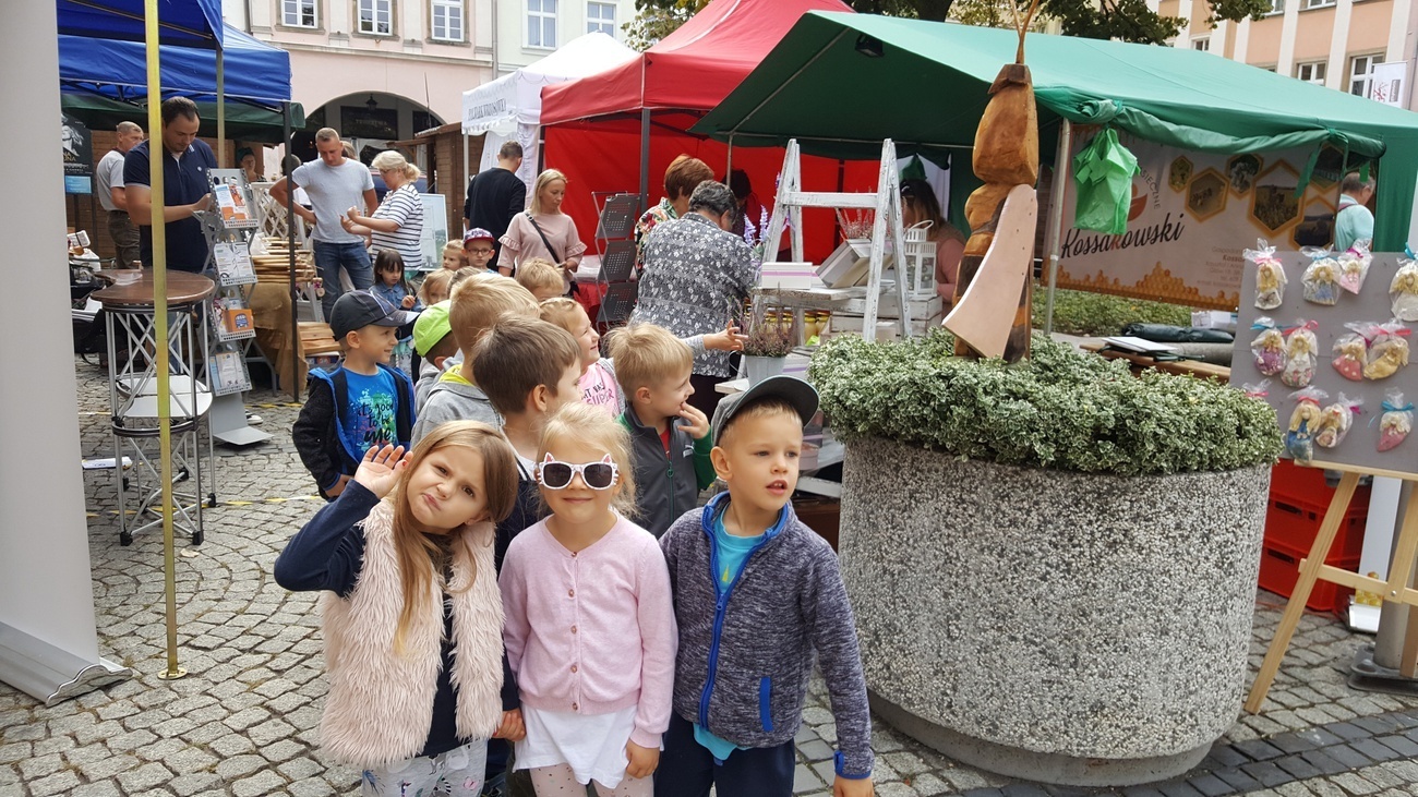 Byliśmy dziś na Jeleniogórskim Rynku, gdzie odbywała się impreza o nazwie „Wystawa produktów regionalnych - Wyprodukowano pod Śnieżką”. Na licznych stoiskach eksponowano przeróżne regionalne wyroby i specjały. Były wśród nich: wyhodowane przez lokalnych hodowców warzywa, miody z dolnośląskich pasiek, ręcznie utkane swetry z owczej wełny, wykonywana przez miejscowych artystów biżuteria. Spotkaliśmy tam również naszą znajomą panią Henię, która prezentowała zrobione własnoręcznie wełniane cudeńka. Na koniec wysłuchaliśmy koncertu ludowej kapeli wystawionego na wielkiej scenie.