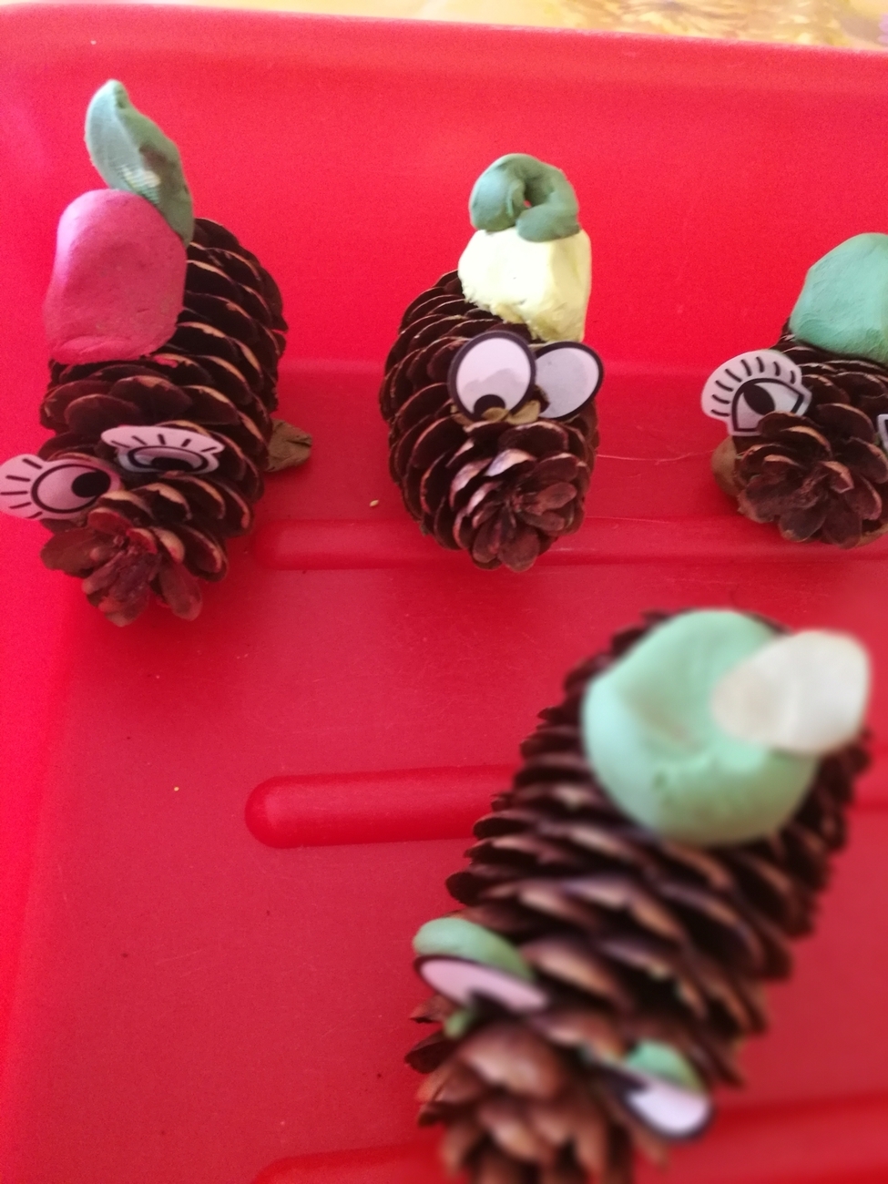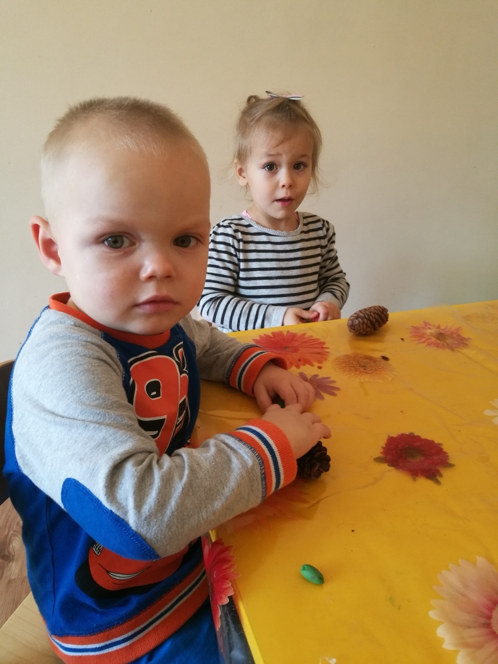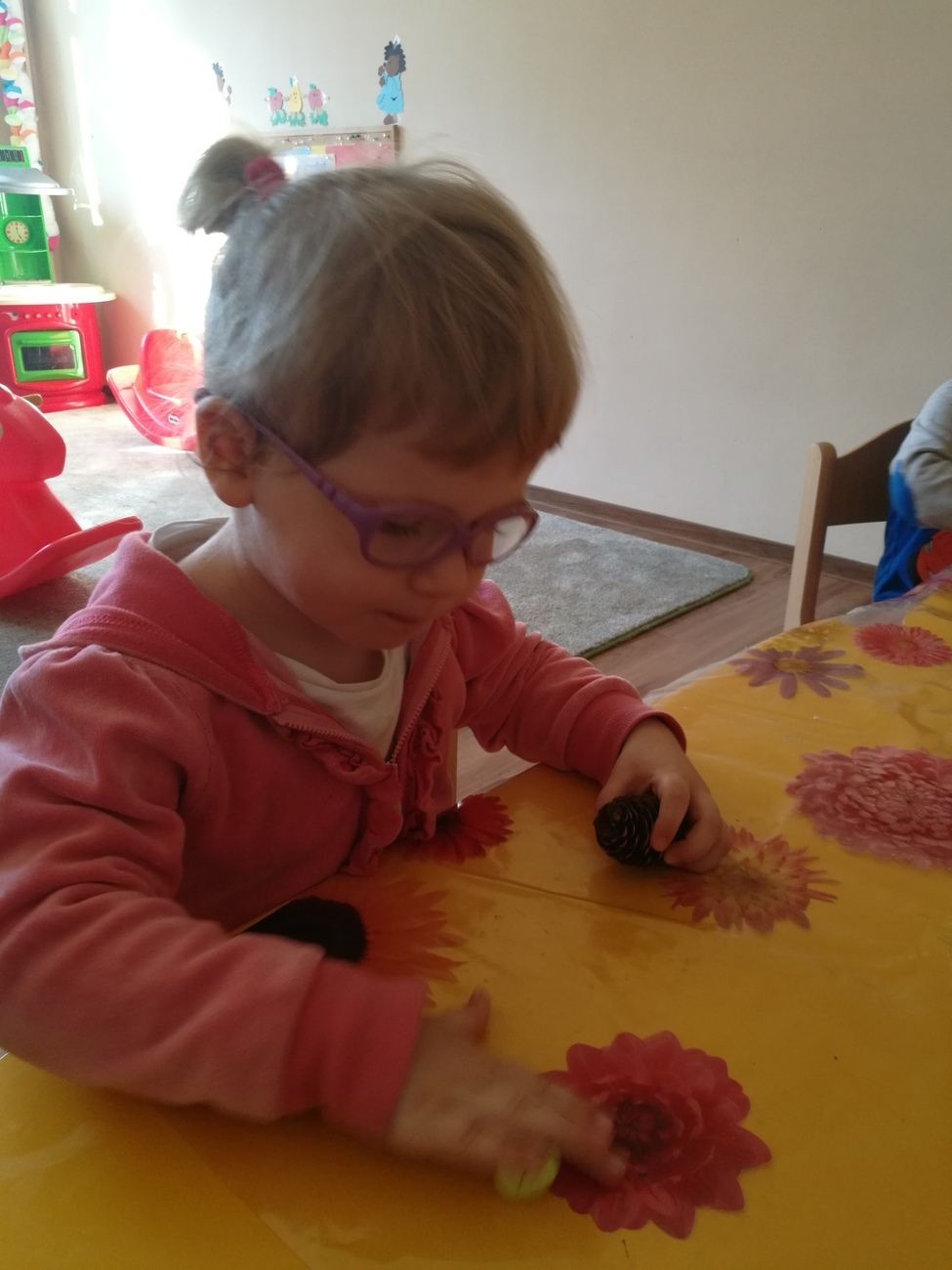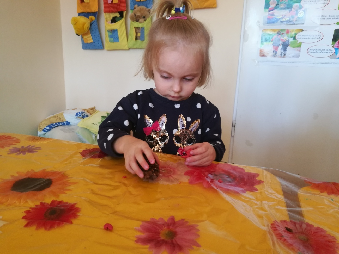 Skarby mimo tego, że są najmłodszą grupą w przedszkolu interesują się całym otaczającym światem. Bardzo szybko zauważyliśmy, ze przyroda wokół nas się zmienia. Spadające liście, kasztany, szyszki zainspirowały nas do stworzenia pracy plastycznej, w której wykorzystaliśmy „dary jesieni”. Z pozbieranych szyszek i plasteliny postanowiliśmy wykonać zwierzątko, które było bohaterem ostatnio czytanej przez nas bajki. Jeż - bo o nim mowa, to wesołe stworzonko, które widzieliśmy tylko na razie na zdjęciach. Z plasteliny ulepiliśmy nóżki naszego jeża i jabłuszka, które jeż będzie nosił na swoich kolcach. Następnie z szyszek zrobiliśmy tułów i z naklejek - oczka. Nasze zwierzątka wyszły bardzo ładne i wesołe. Ozdobią teraz naszą salę, a później zabierzemy je do domu.