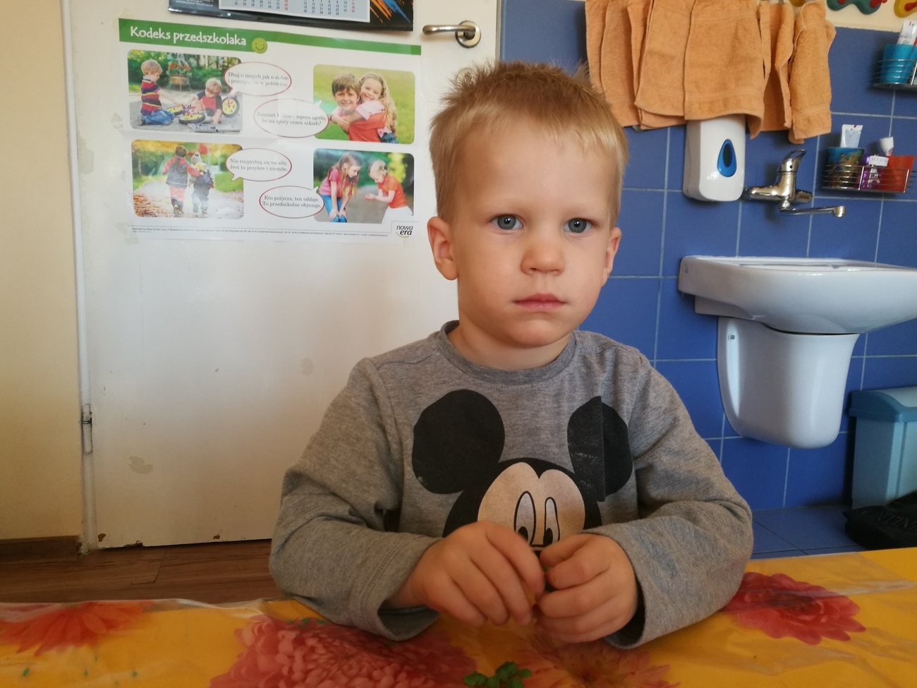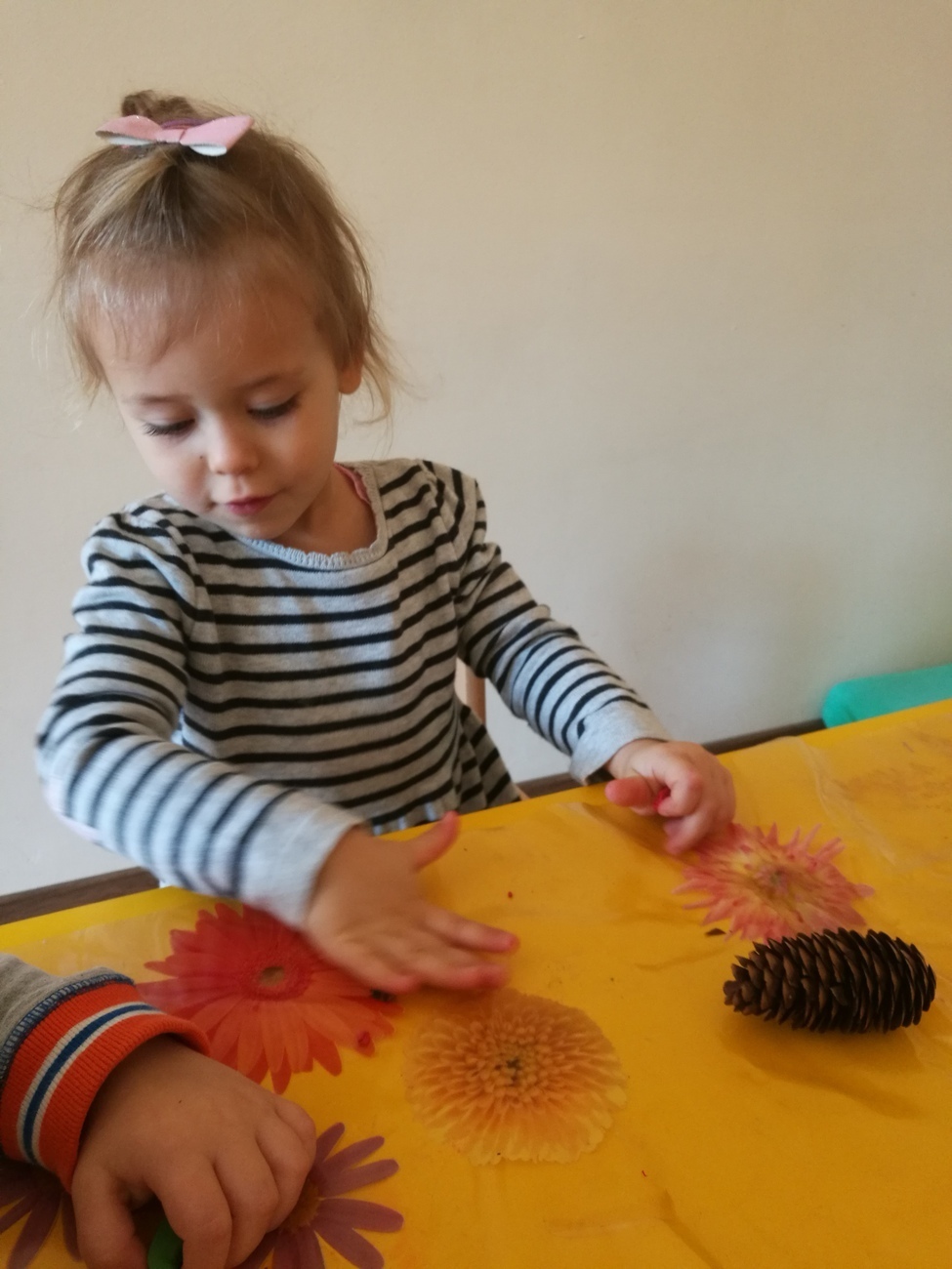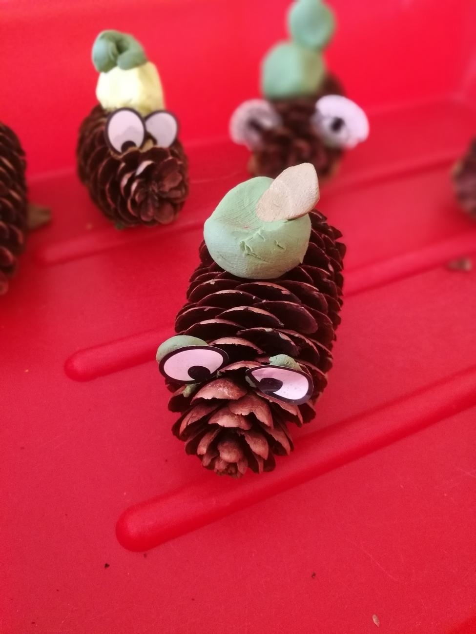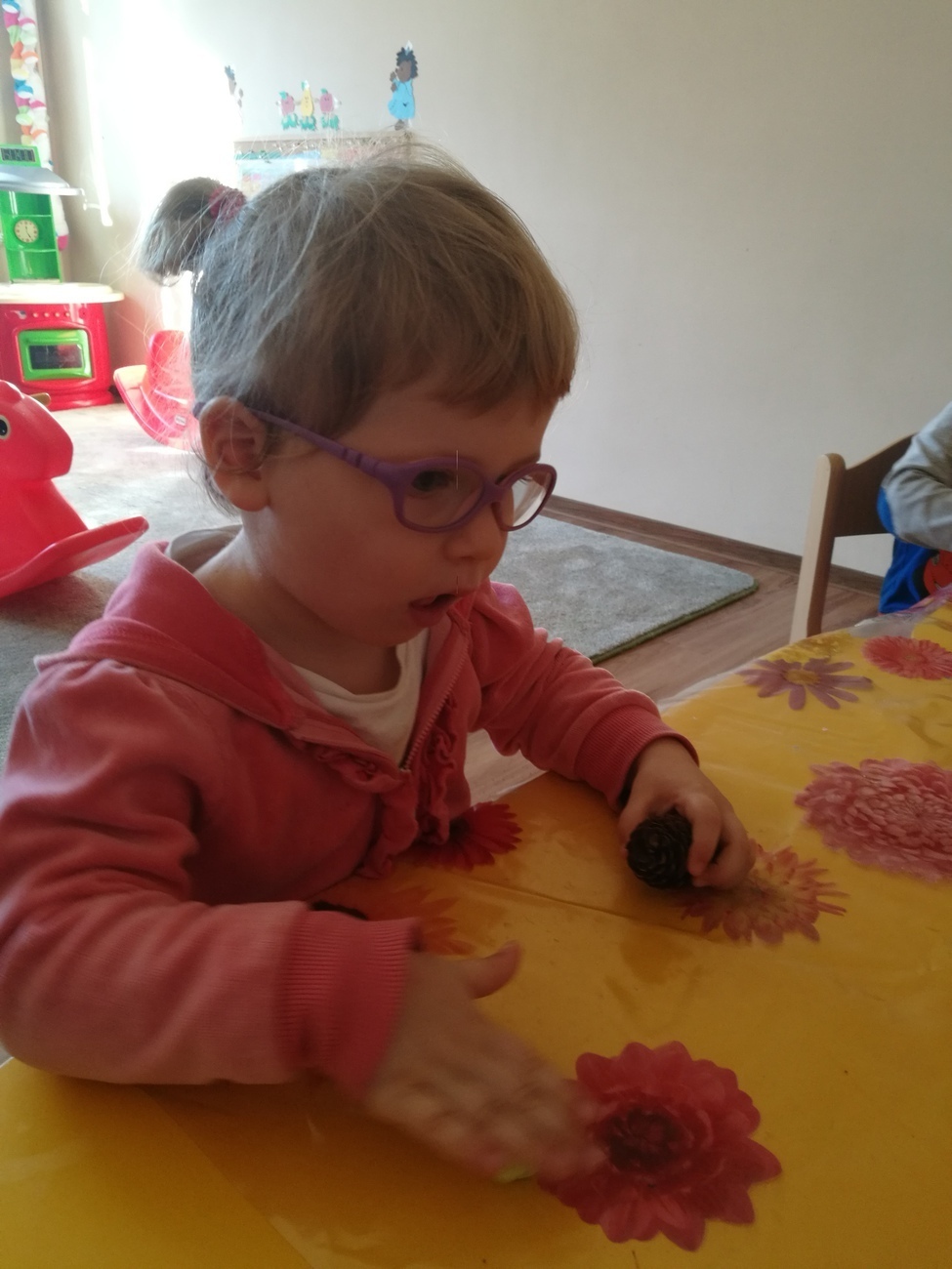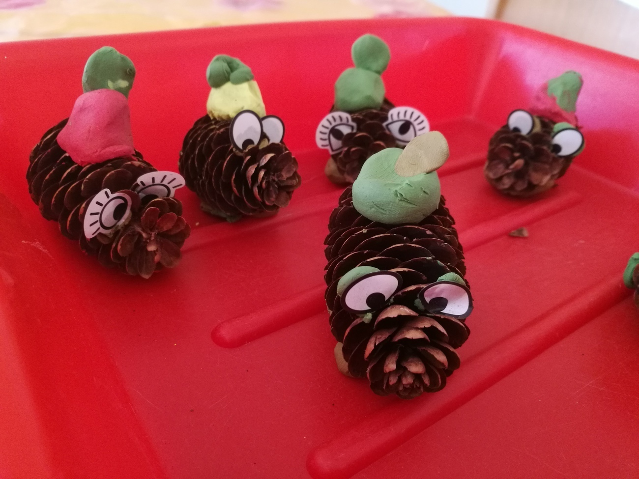 Skarby mimo tego, że są najmłodszą grupą w przedszkolu interesują się całym otaczającym światem. Bardzo szybko zauważyliśmy, ze przyroda wokół nas się zmienia. Spadające liście, kasztany, szyszki zainspirowały nas do stworzenia pracy plastycznej, w której wykorzystaliśmy „dary jesieni”. Z pozbieranych szyszek i plasteliny postanowiliśmy wykonać zwierzątko, które było bohaterem ostatnio czytanej przez nas bajki. Jeż - bo o nim mowa, to wesołe stworzonko, które widzieliśmy tylko na razie na zdjęciach. Z plasteliny ulepiliśmy nóżki naszego jeża i jabłuszka, które jeż będzie nosił na swoich kolcach. Następnie z szyszek zrobiliśmy tułów i z naklejek - oczka. Nasze zwierzątka wyszły bardzo ładne i wesołe. Ozdobią teraz naszą salę, a później zabierzemy je do domu.