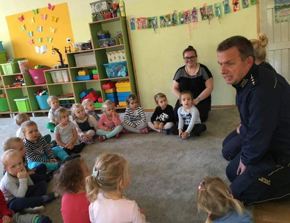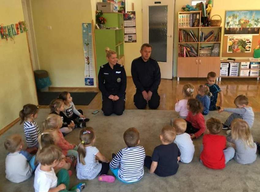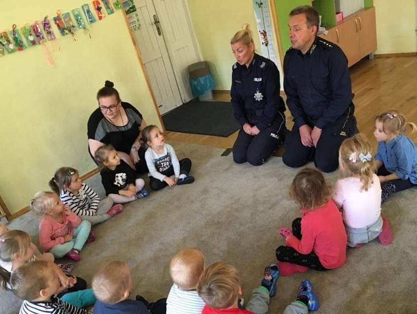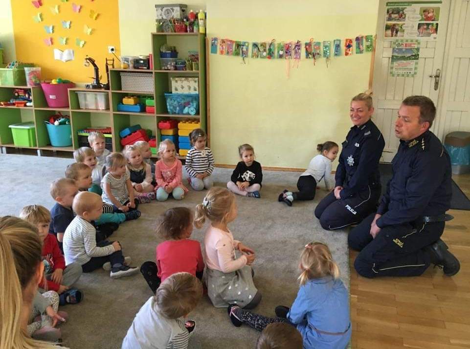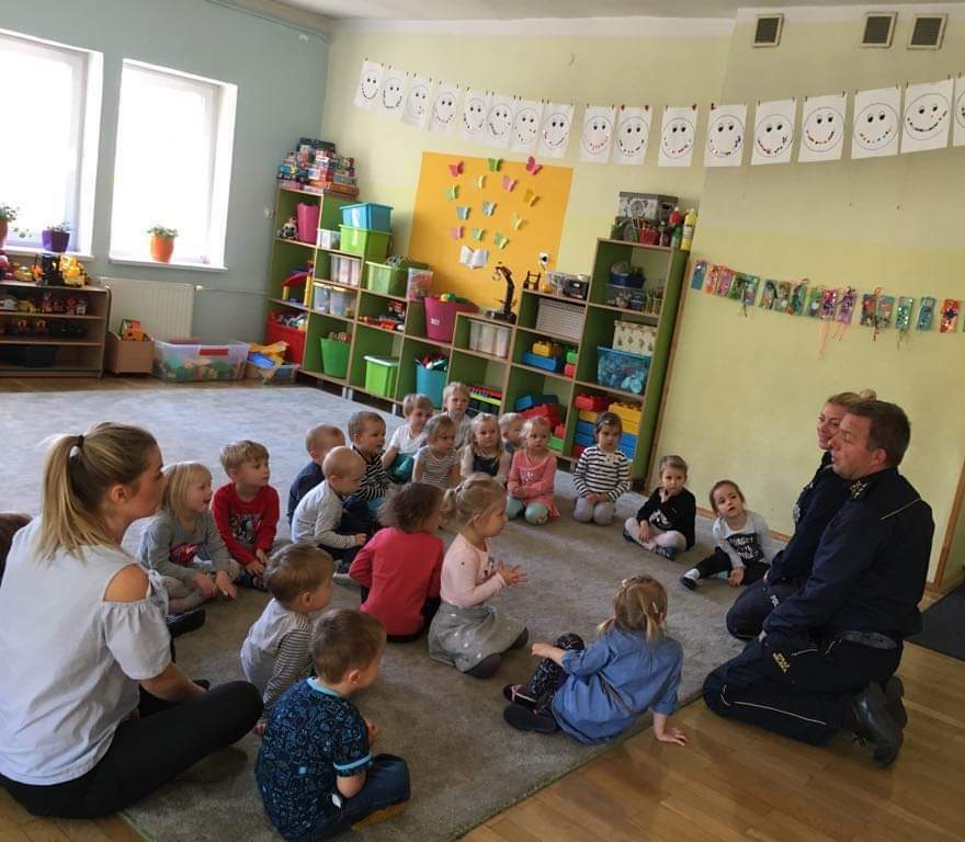Dzisiejszego dnia odwiedzili nas goście. Pani Beata, pan Grzegorz. Opowiedzieli nam o tym jak być bezpiecznym na drodze i w przedszkolu. Pani policjantka przypomniała nam numery alarmowe. Pan Grzegorz zobrazował nam co może nam grozić jak będziemy zachowywać się niegrzecznie. Na koniec wizyty wspólnie śpiewaliśmy o sygnalizacji świetlnej. Policjanci sprawdzali tym naszą spostrzegawczość, ponieważ w piosence były ukryte małe błędy.