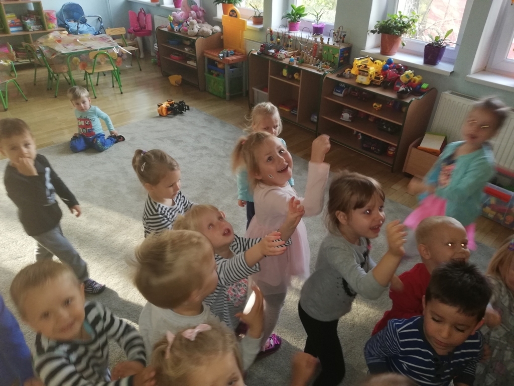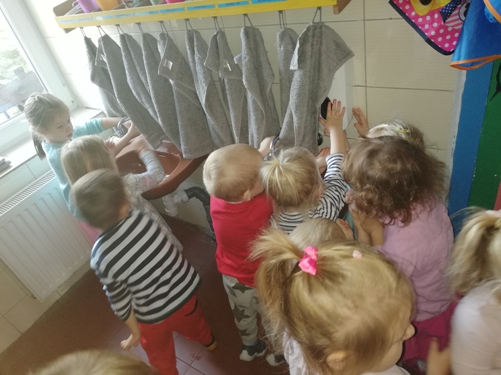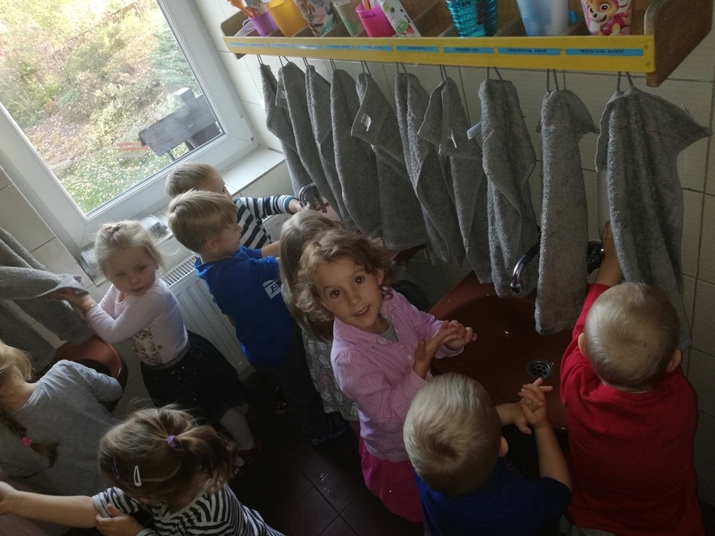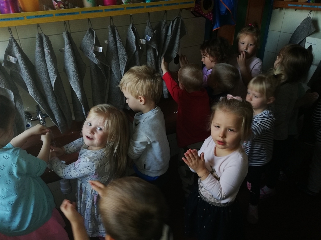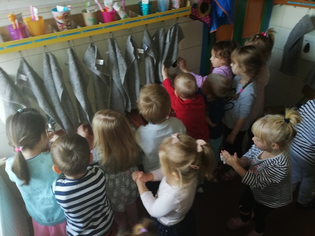 Każdy Smerf wie, że dbanie o czystość to dobra rzecz. Dzieci tego dnia poznały jak prawidłowo myć ręce. Nauczyły się piosenki o czystych rękach. Bawiliśmy się i tańczyliśmy przy bańkach mydlanych. Po wspólnych zabawach i zagadkach o higienie. Dzieci myły rączki według poprawnej kolejności. Na koniec zajęć wykonały wspólną pracę plastyczną pt. „Myjemy ręce”.