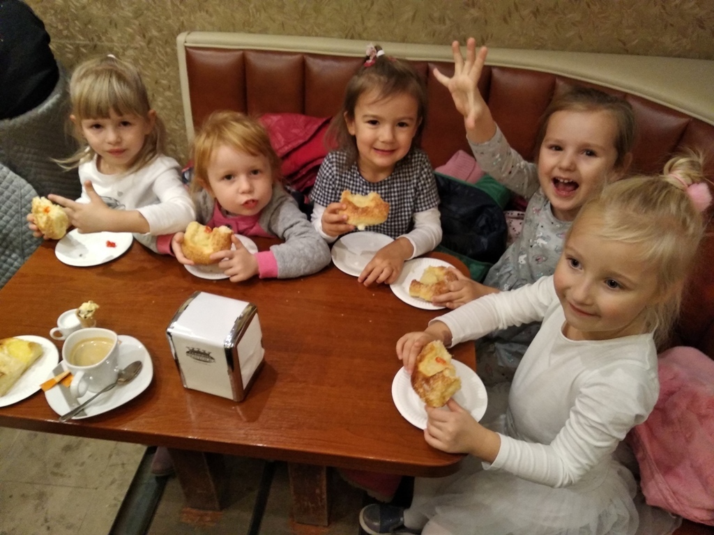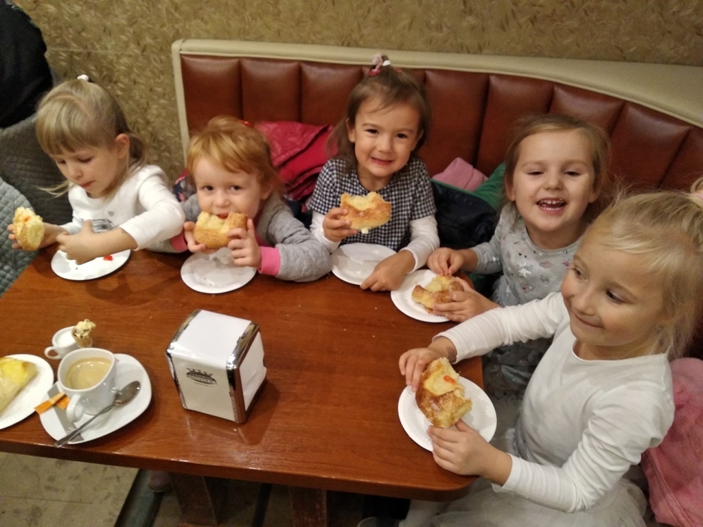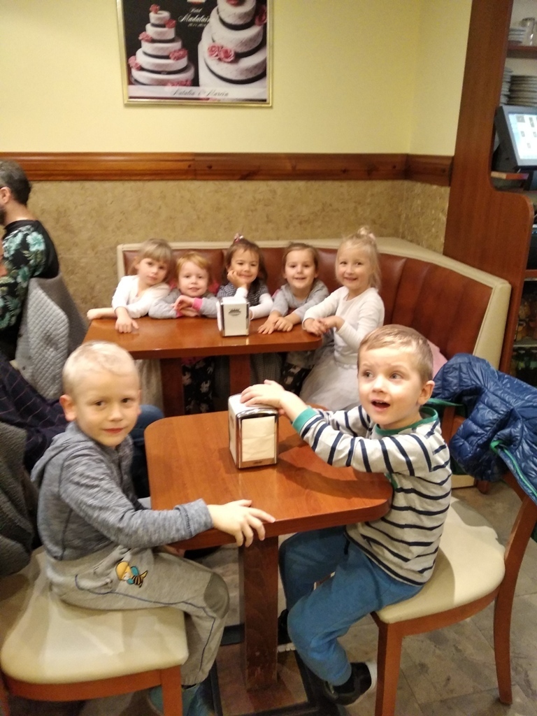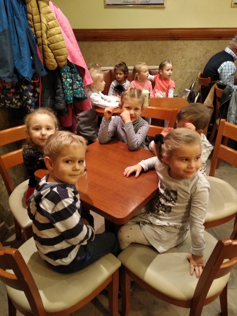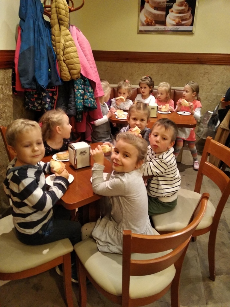 Dzisiejszego dnia wybraliśmy się całą grupą na przepyszne ciastko do kawiarni, która znajduje się w sercu naszego miasta. W kawiarni mieliśmy okazję spróbować pysznych wypieków, a panie które tam pracują bardzo miło i przyjaźnie nas przyjęły. Tego dnia była piękna pogoda dlatego mogliśmy podziwiać uroki tegorocznej pięknej jesieni. Rozmawialiśmy i przypominaliśmy sobie o tym jakie są jej oznaki. Korzystając z tak pięknej pogody przed powrotem do przedszkola bawiliśmy się na placu zabaw.